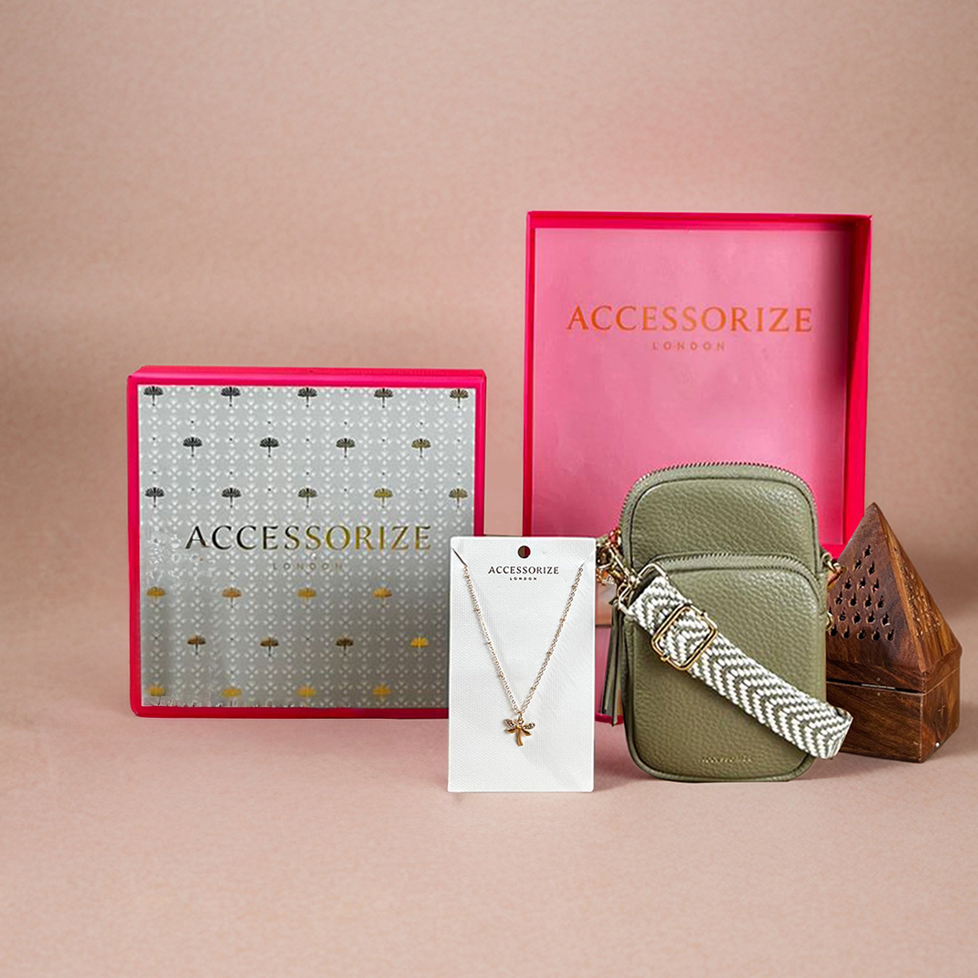 Green Crossbody Phone Bag & Gold necklace Combo Set for woman (Diwali Gift Hamper Box)
