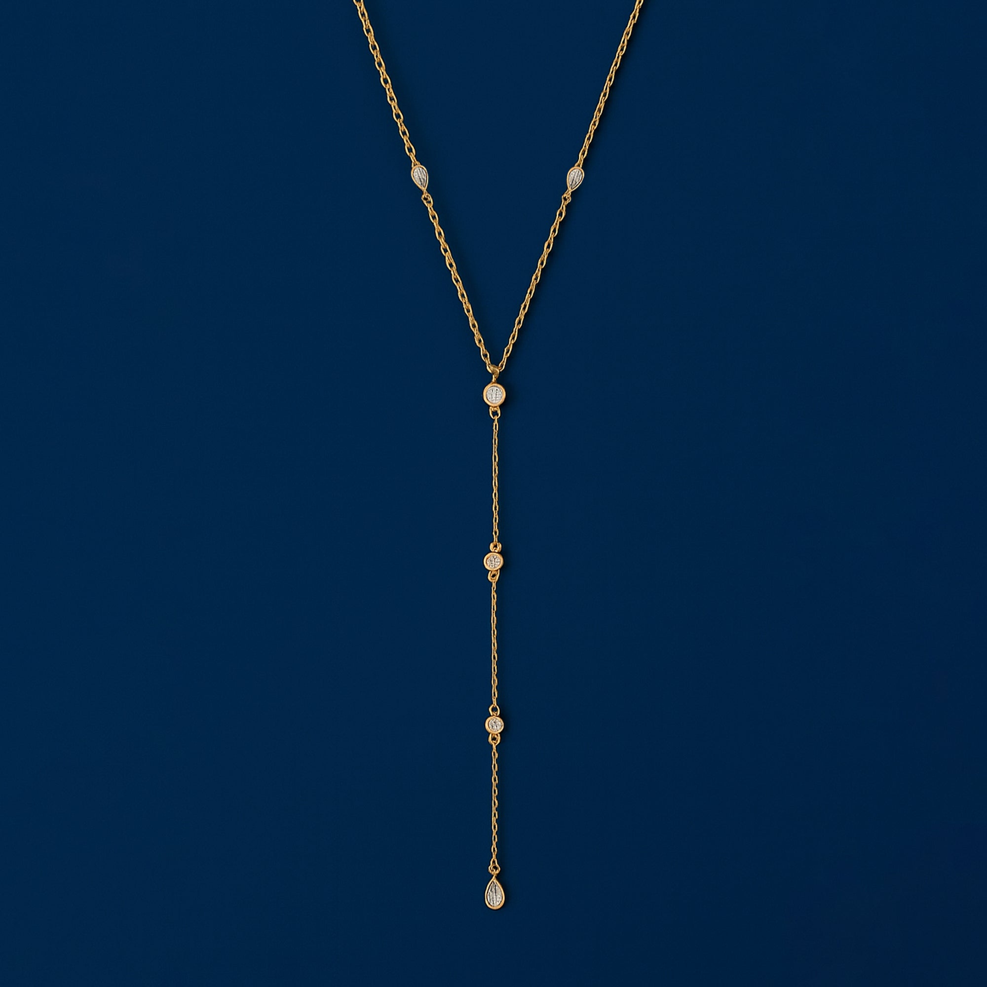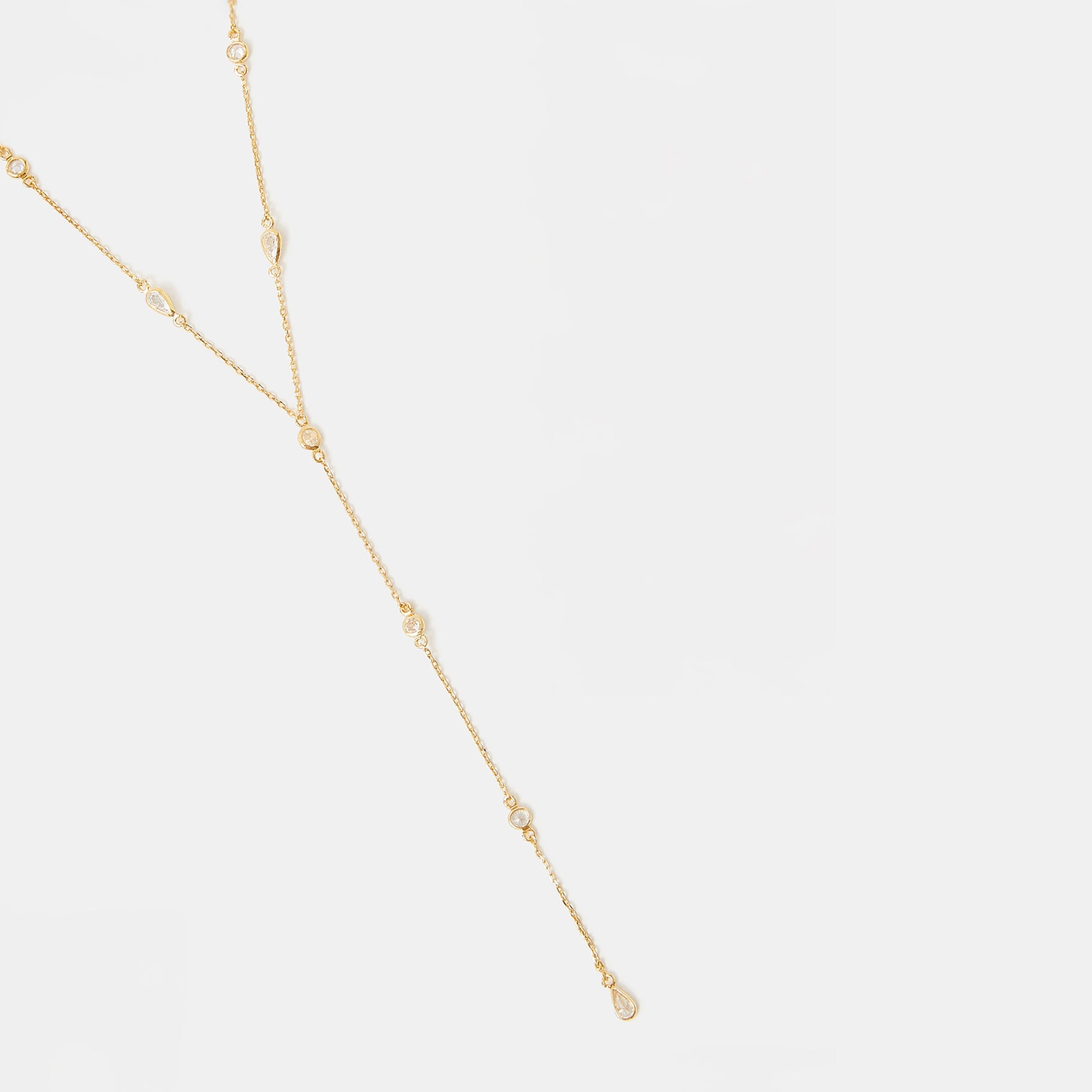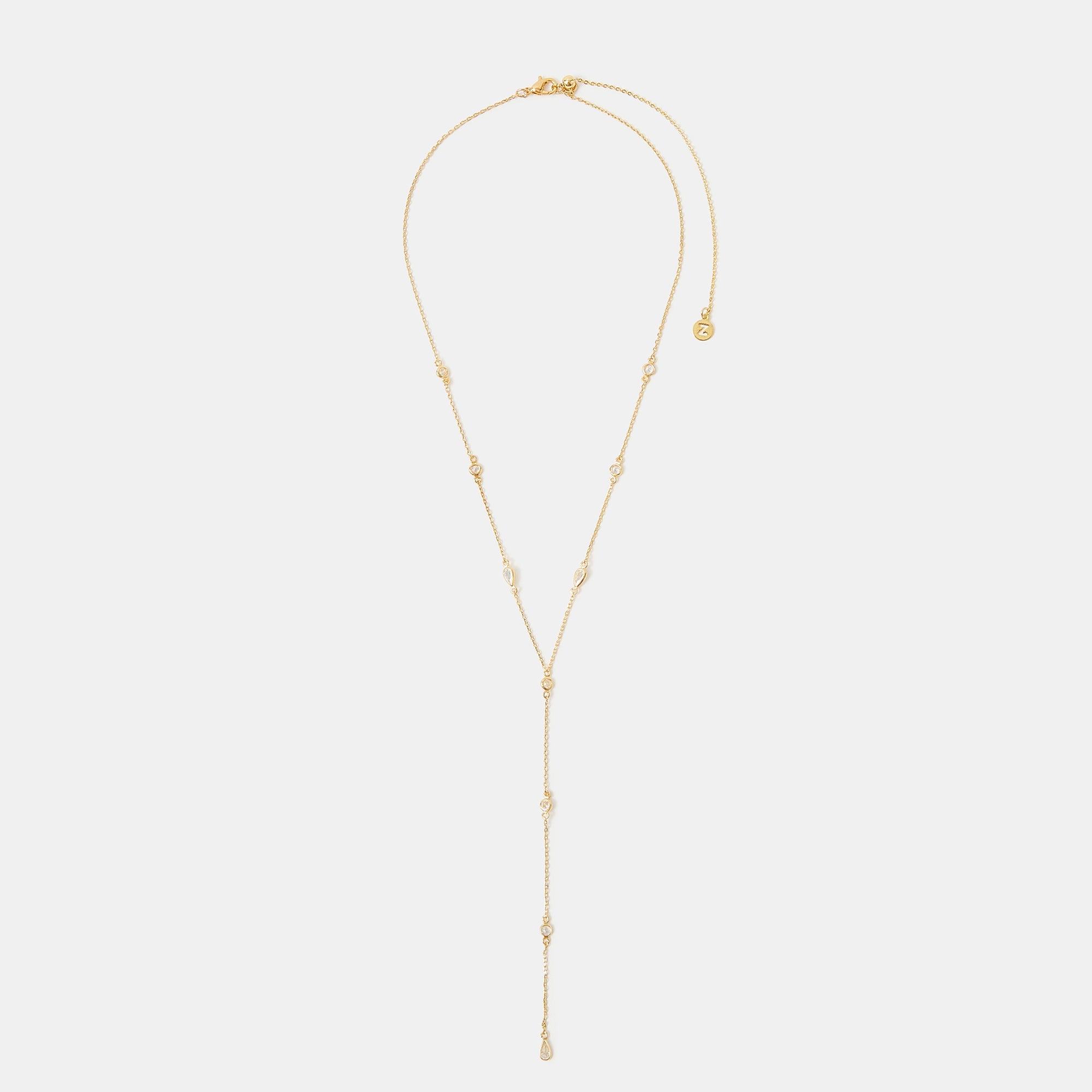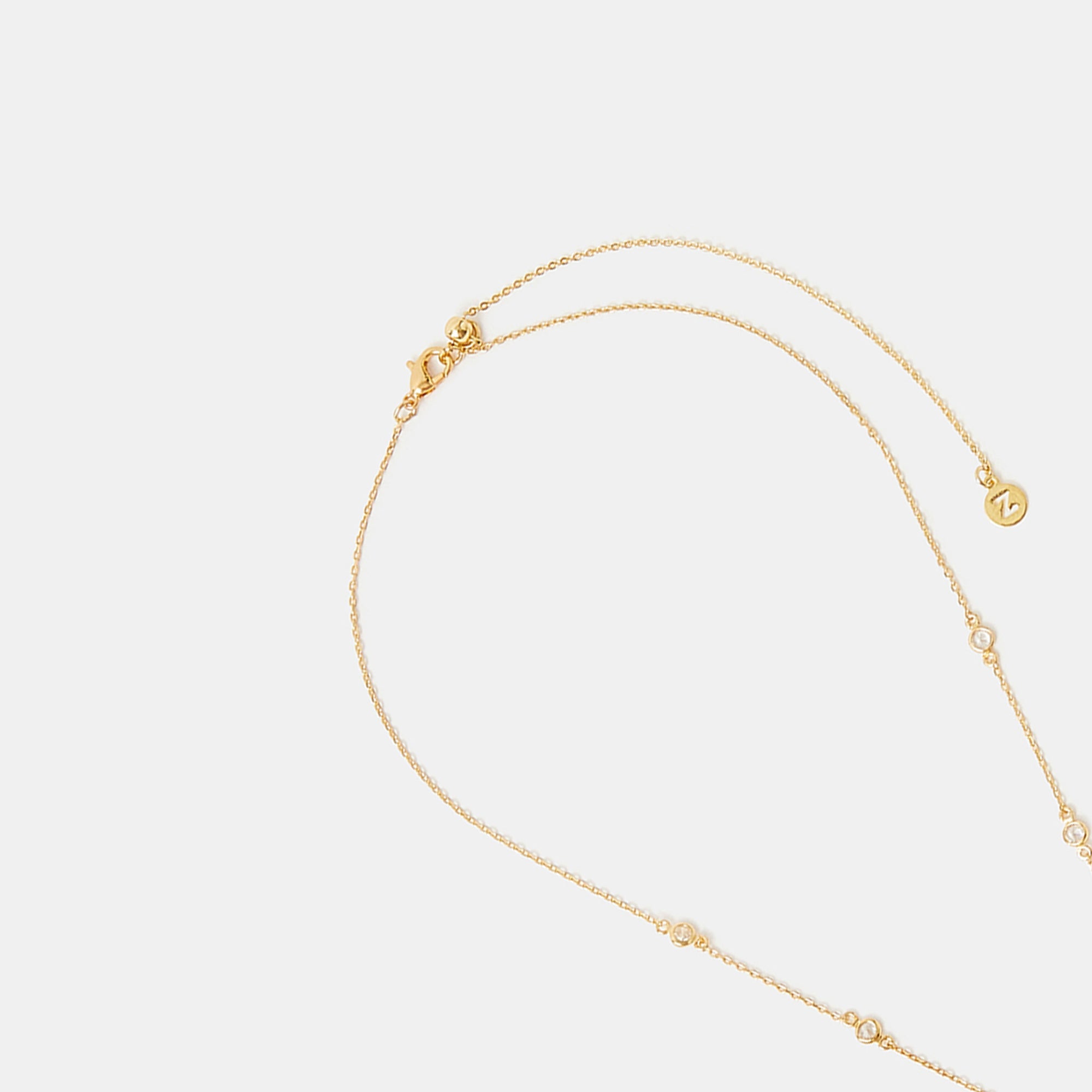 Perfect for pairing with V-neck dresses and blouses, this elegant necklace is set with sparkly diamantés to finish. Fastens with a lobster clasp and extender.
