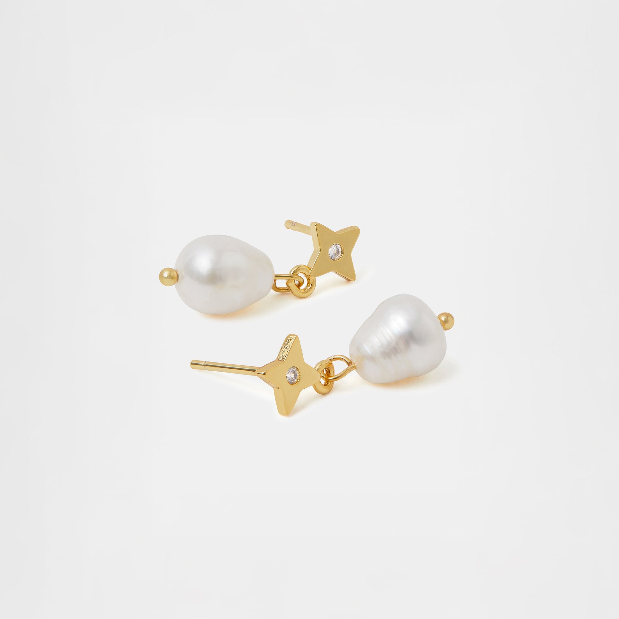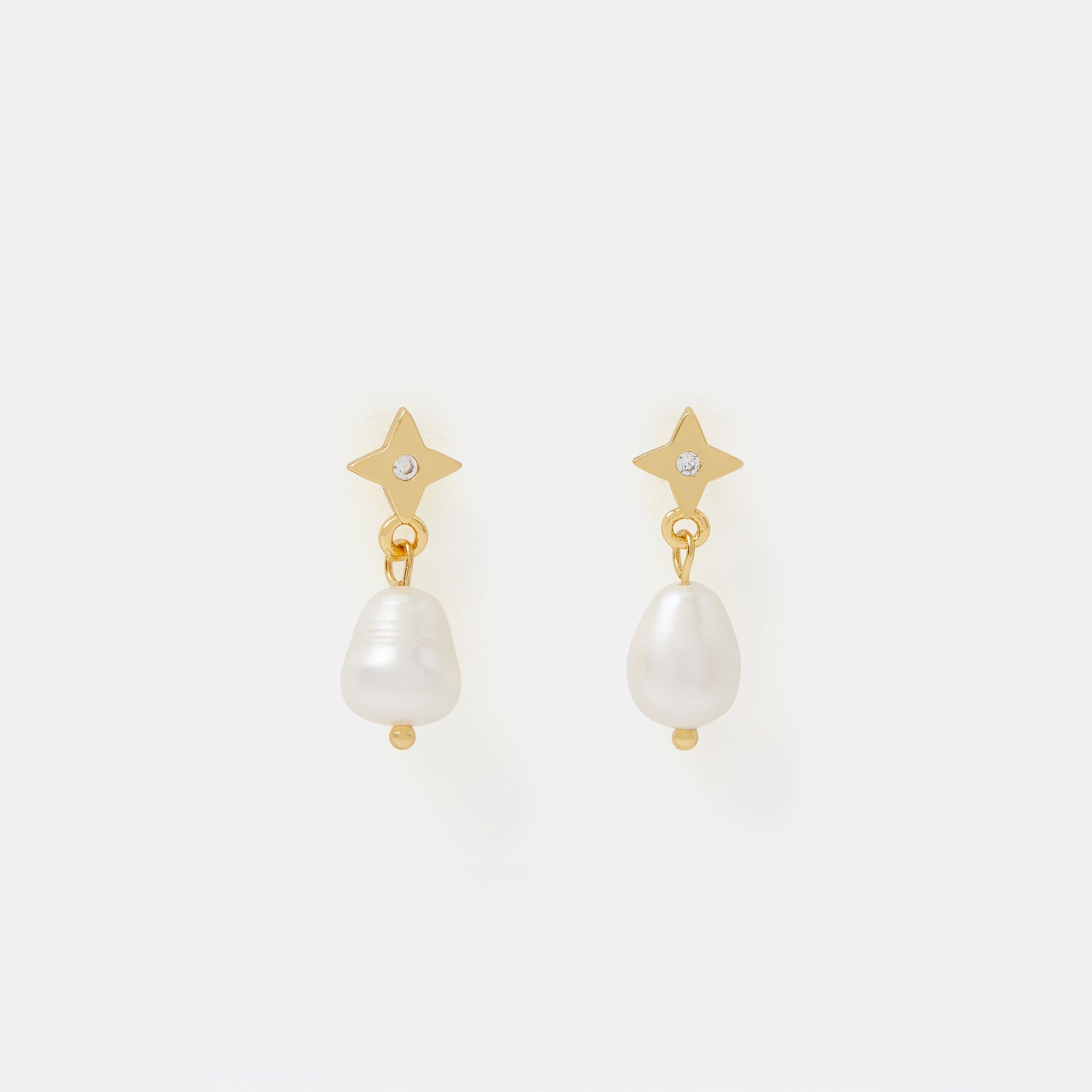 Delicate and dazzling, these short drop earrings showcase a freshwater pearl dangling from a star-shaped stud profile.