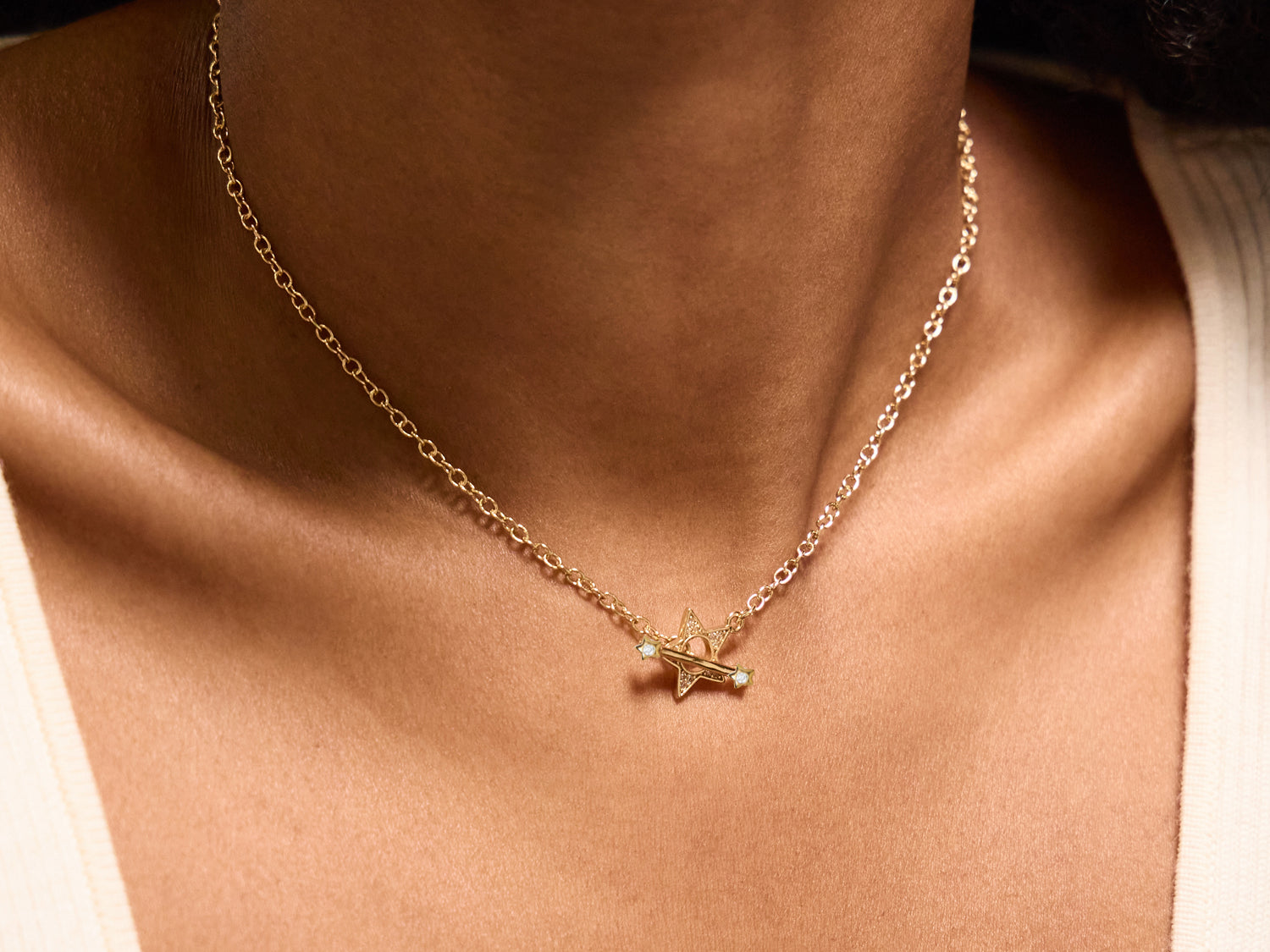 3. A charming addition to your stack, this necklace is designed on a classic chain with a cubic zirconia-encrusted star that secures the T-bar fastening