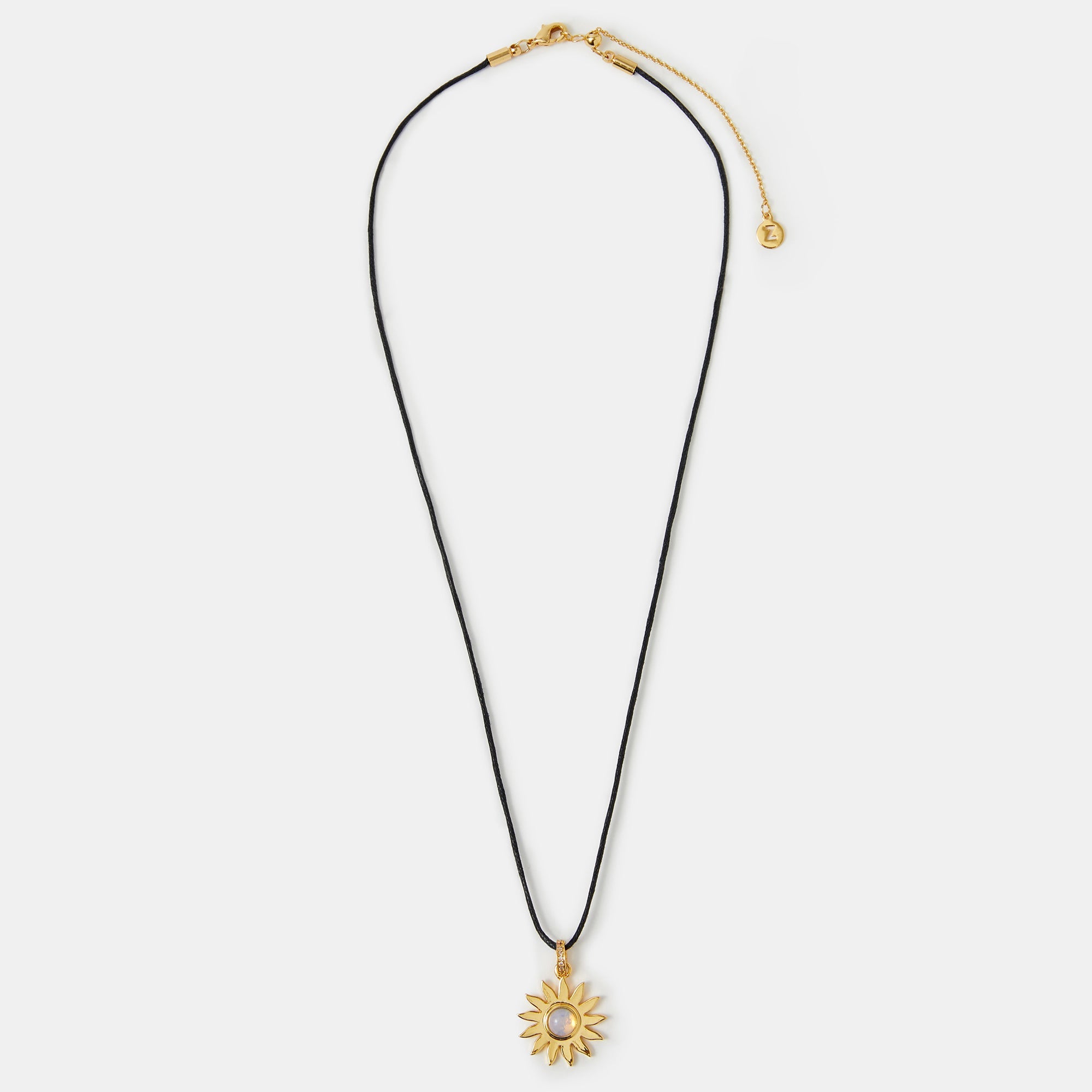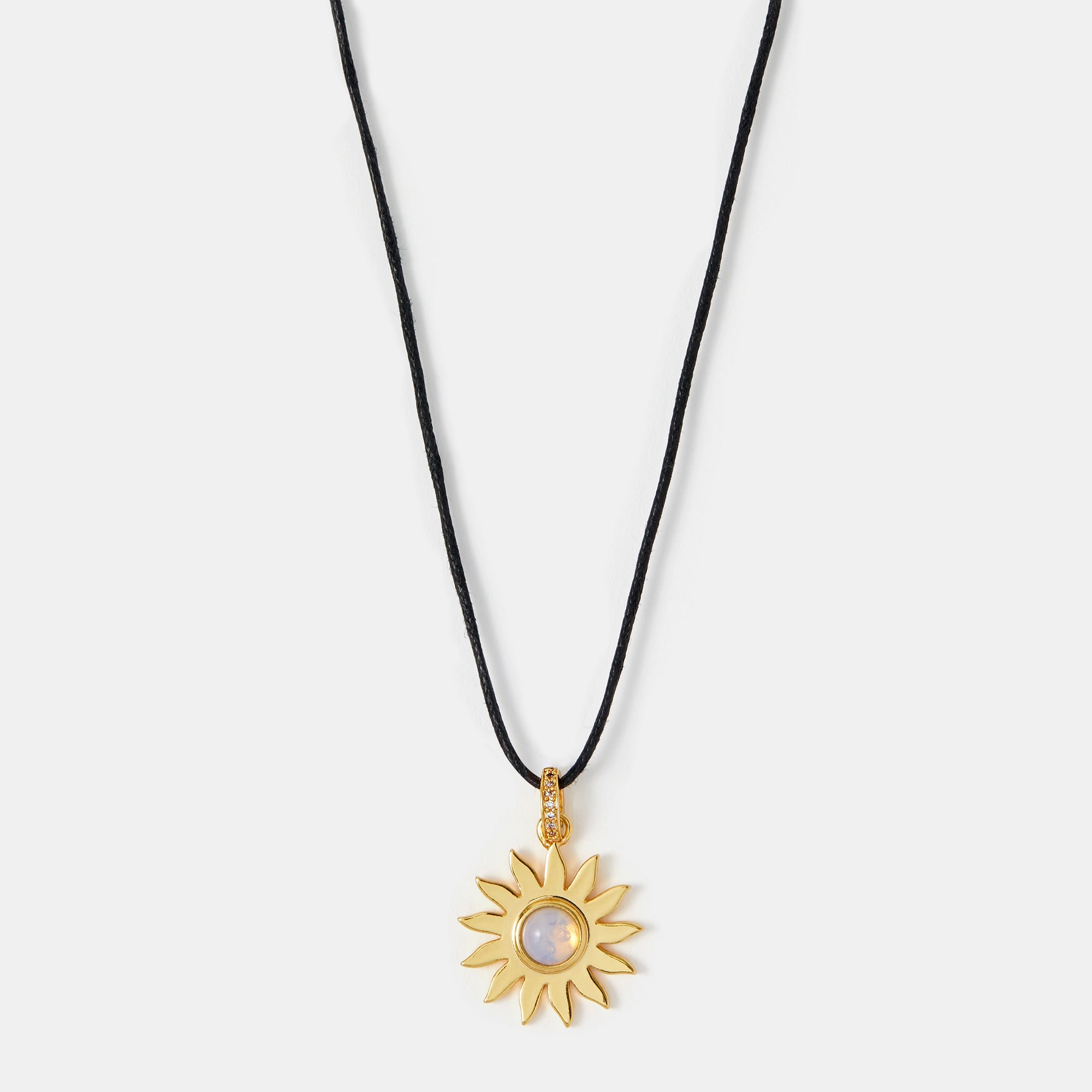 Introducing: your new summer acccessory. Showcasing a striking sun pendant dangling from a 90s-inspired cord necklace, it's finished with shimmery diamantés and stone detail at the centre. Fastens with a lobster clasp.