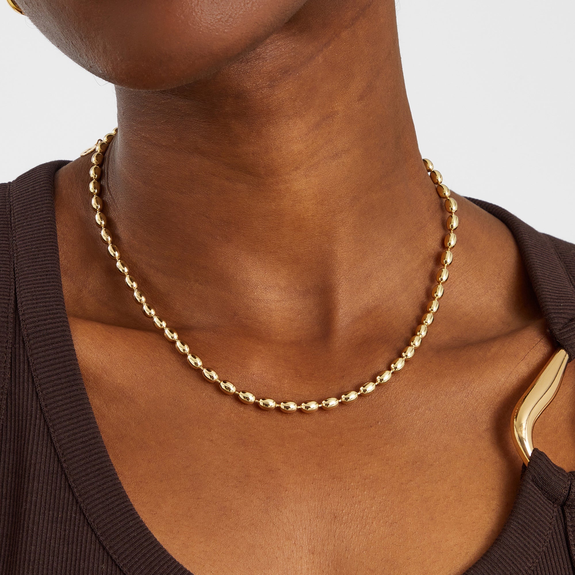 Not your average beaded necklace. Comprised of a chain with oval bead-like finishes, this necklace is perfect for stacking with pendants or styled as a stand-alone piece.