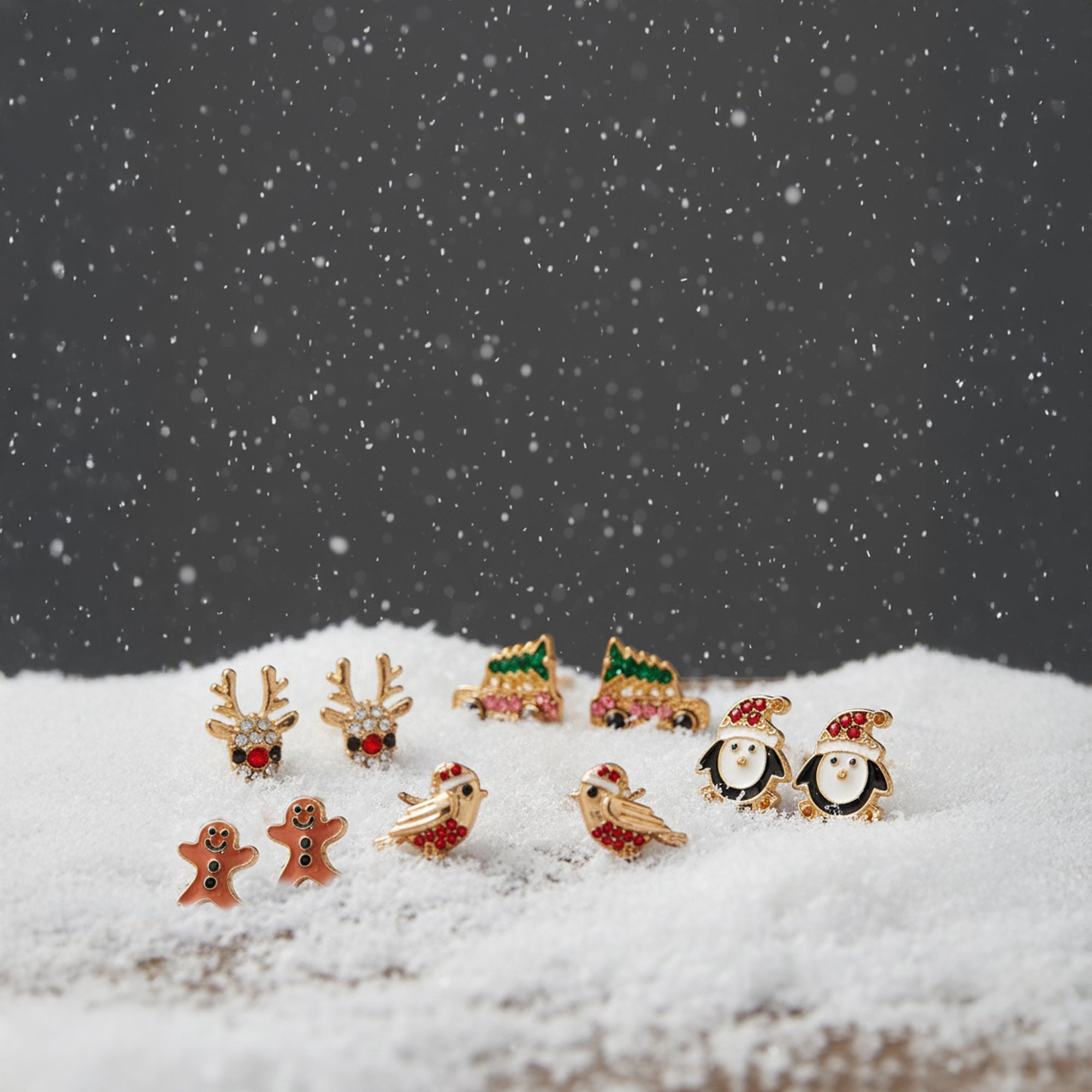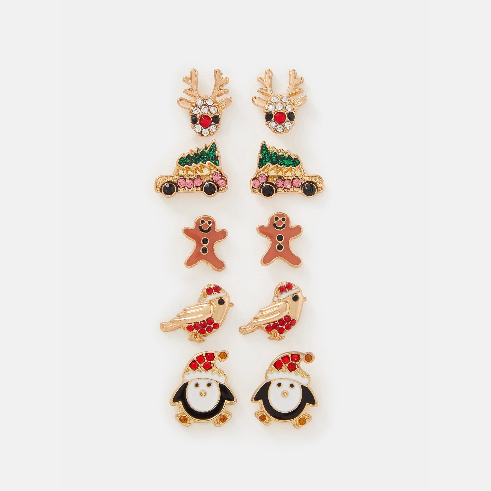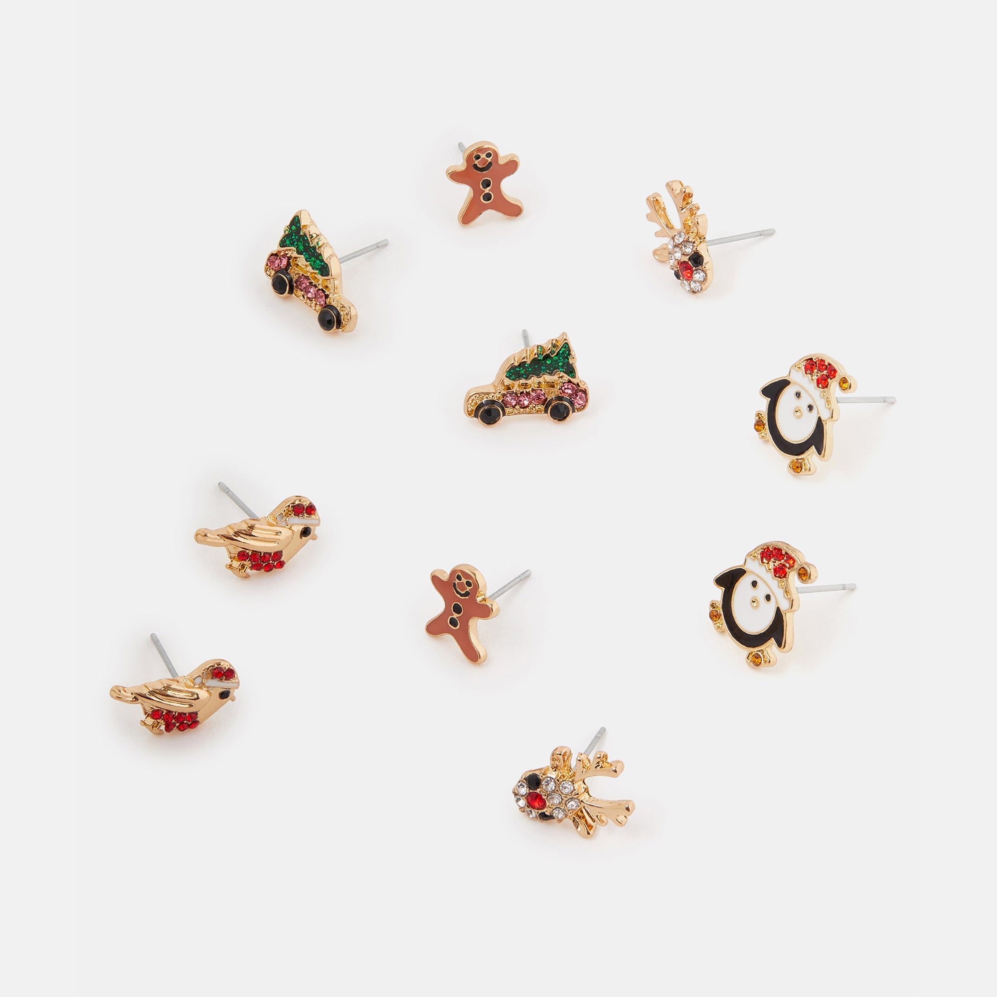 Create a fun, festive earscape to show off everyday in December! Dipped in a gold tone, these studs feature Rudolph, Christmas tree car, gingerbread man, robin and penguin designs with resin and diamante finishes. Five pairs included.
