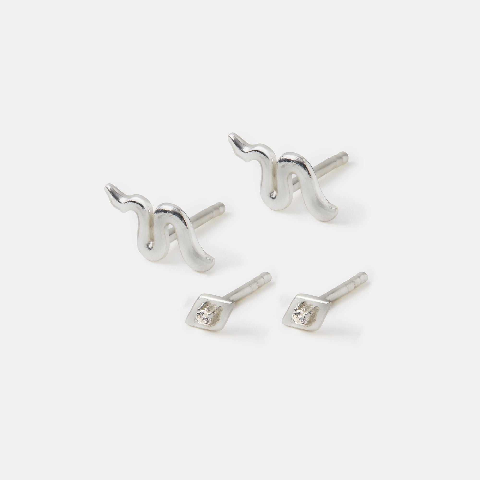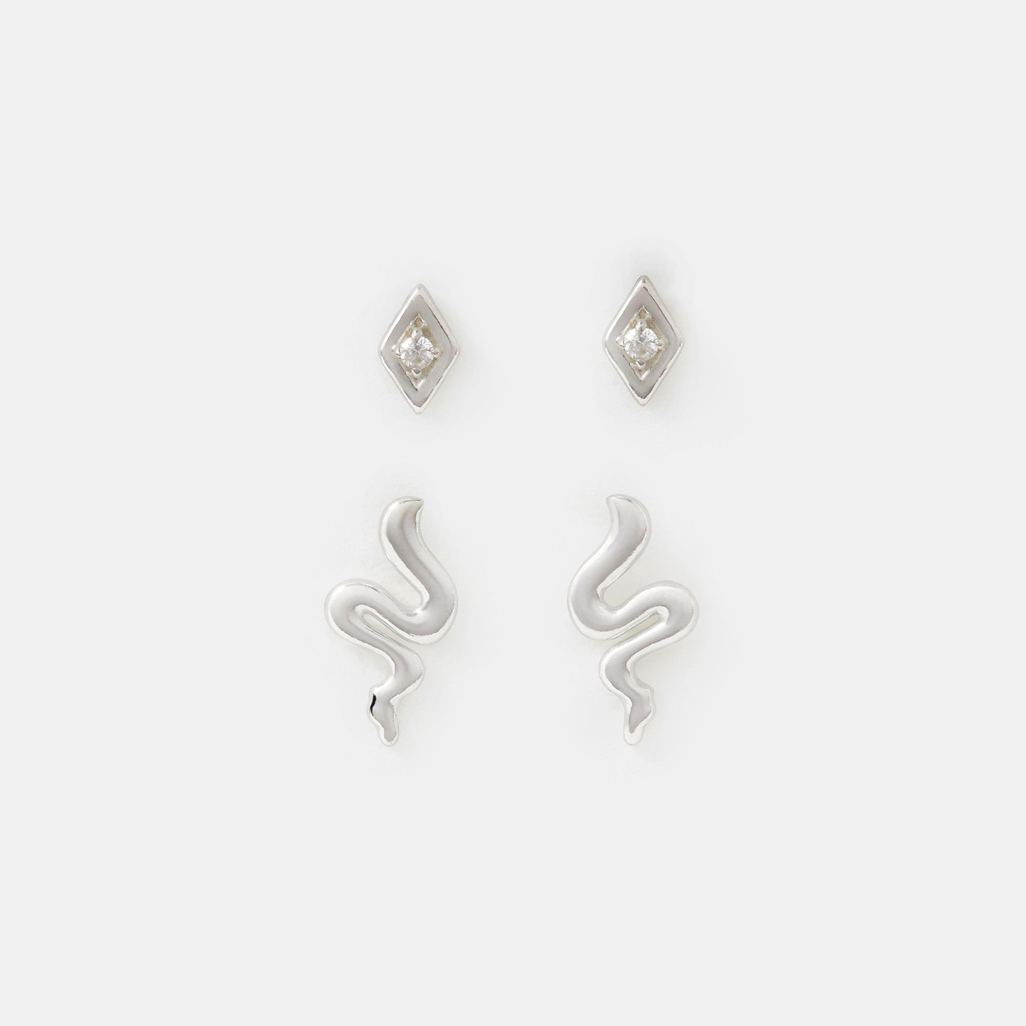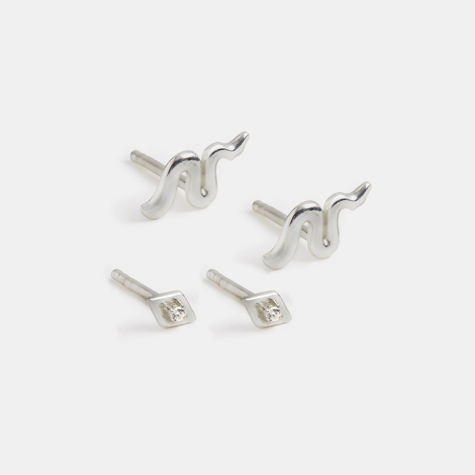 Serpents and sparkles? Classics for your ear stack, in our opinion. Crafted from solid 925 sterling silver, these studs showcase snakes and eyes with diamantes at the centre. Two pairs included.