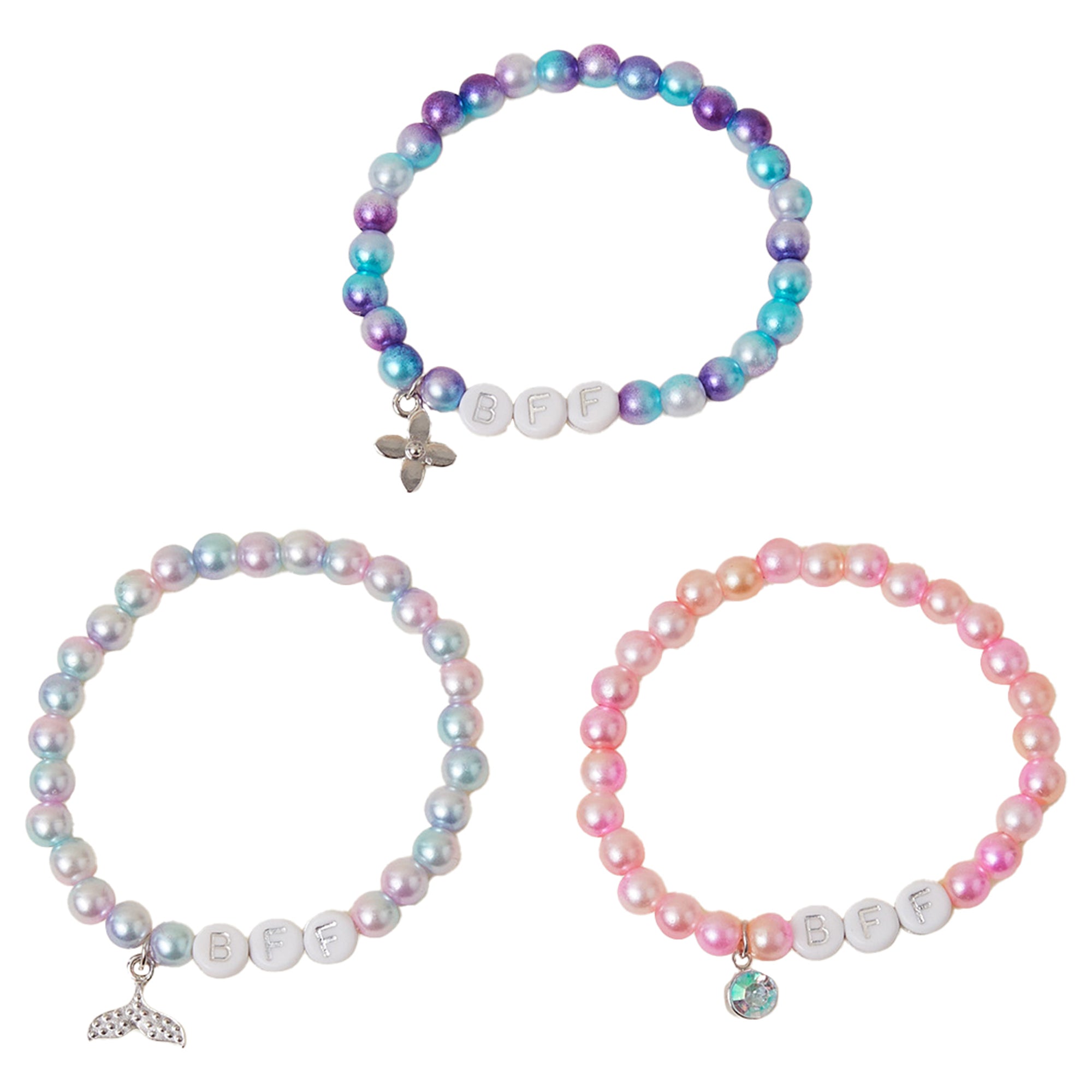 They'll love sharing these bracelets with their besties! The set features four beaded designs, each with a funky colour and a "BFF" charm. Three bracelets included.