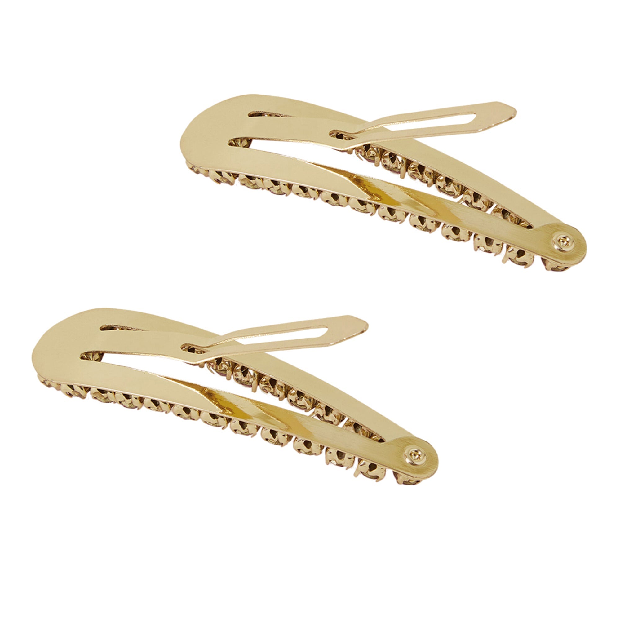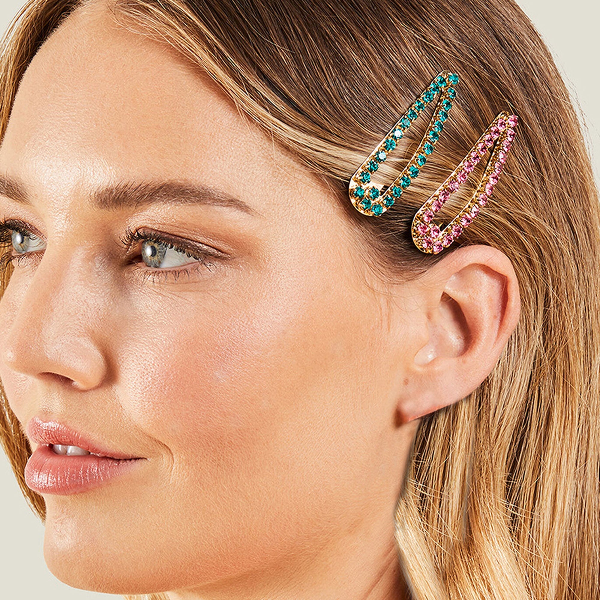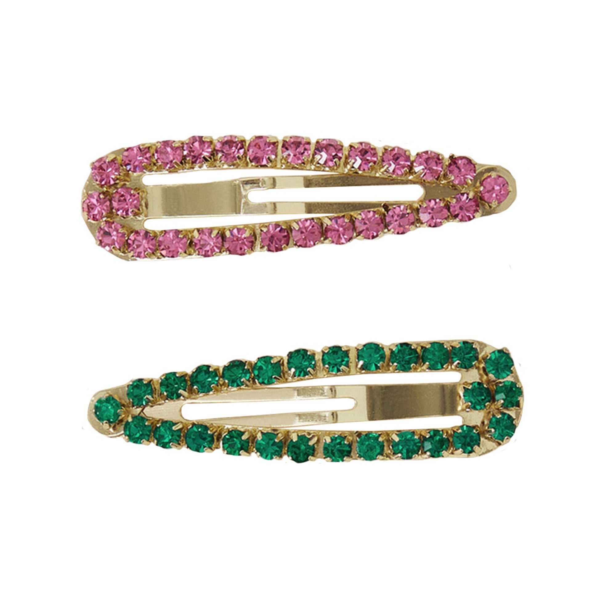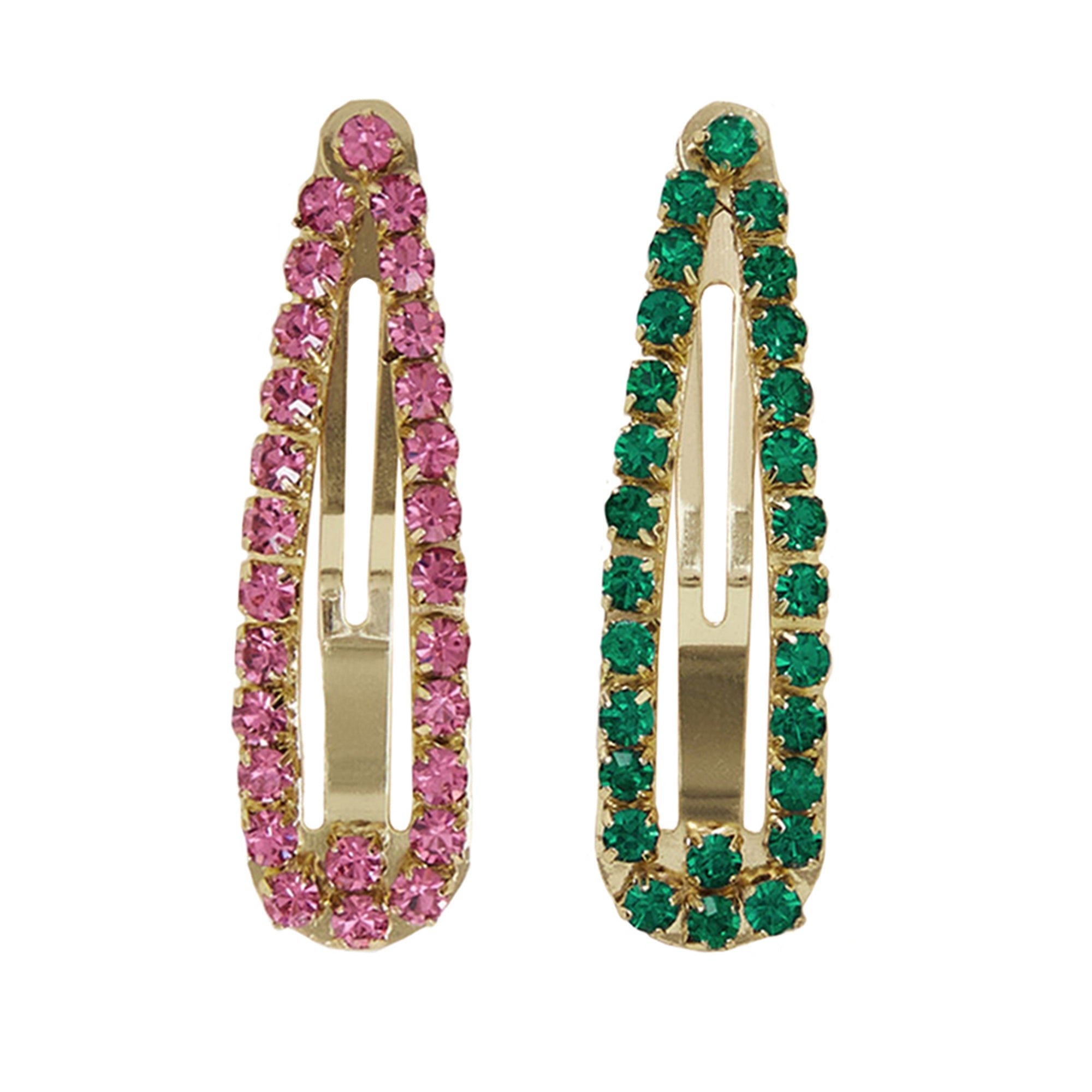 Pink and green tones sparkle on these hair clips, embellished with shiny gems. Designed in gold-tone metal, these clips are perfect for keeping your hair out the way on long casual days out with friends.