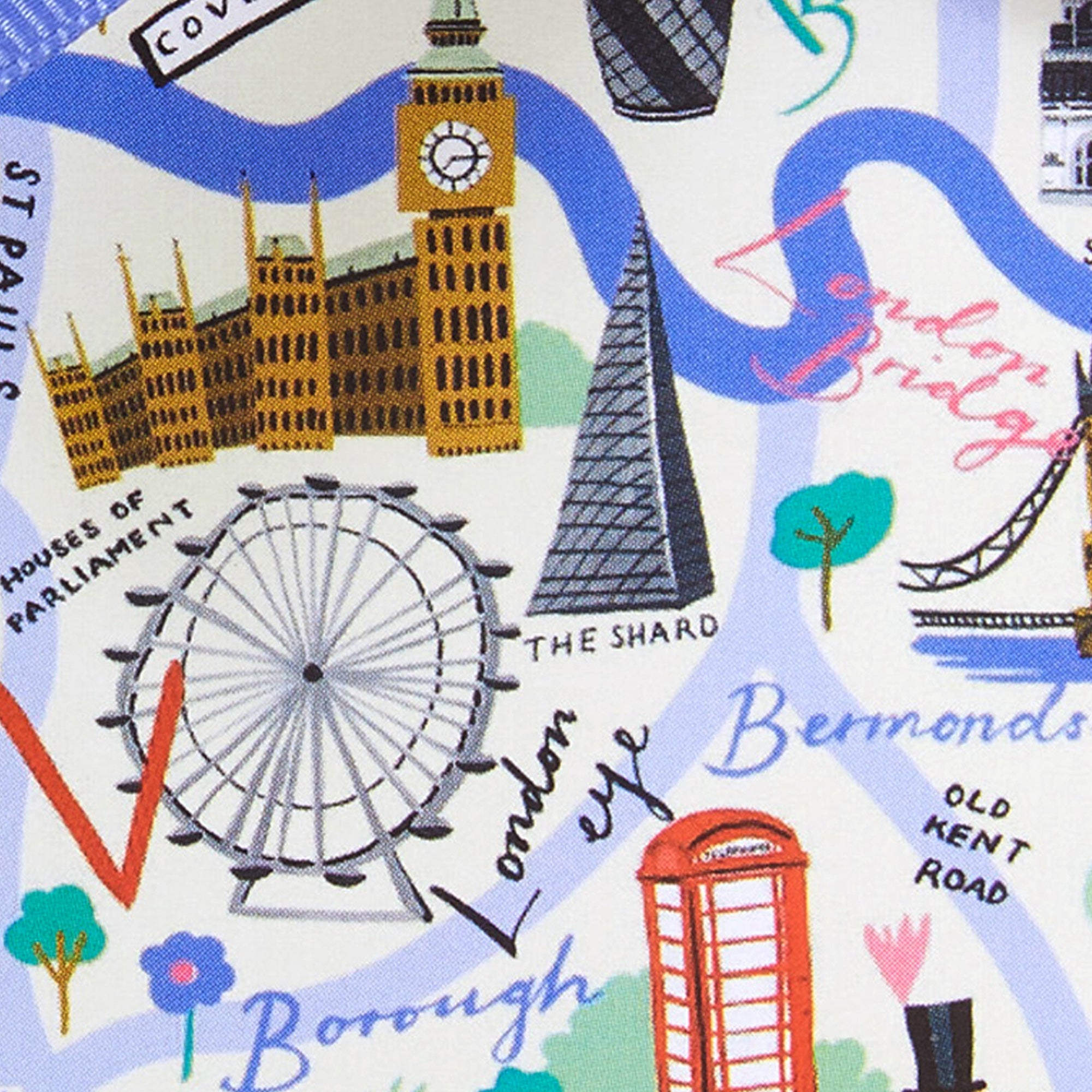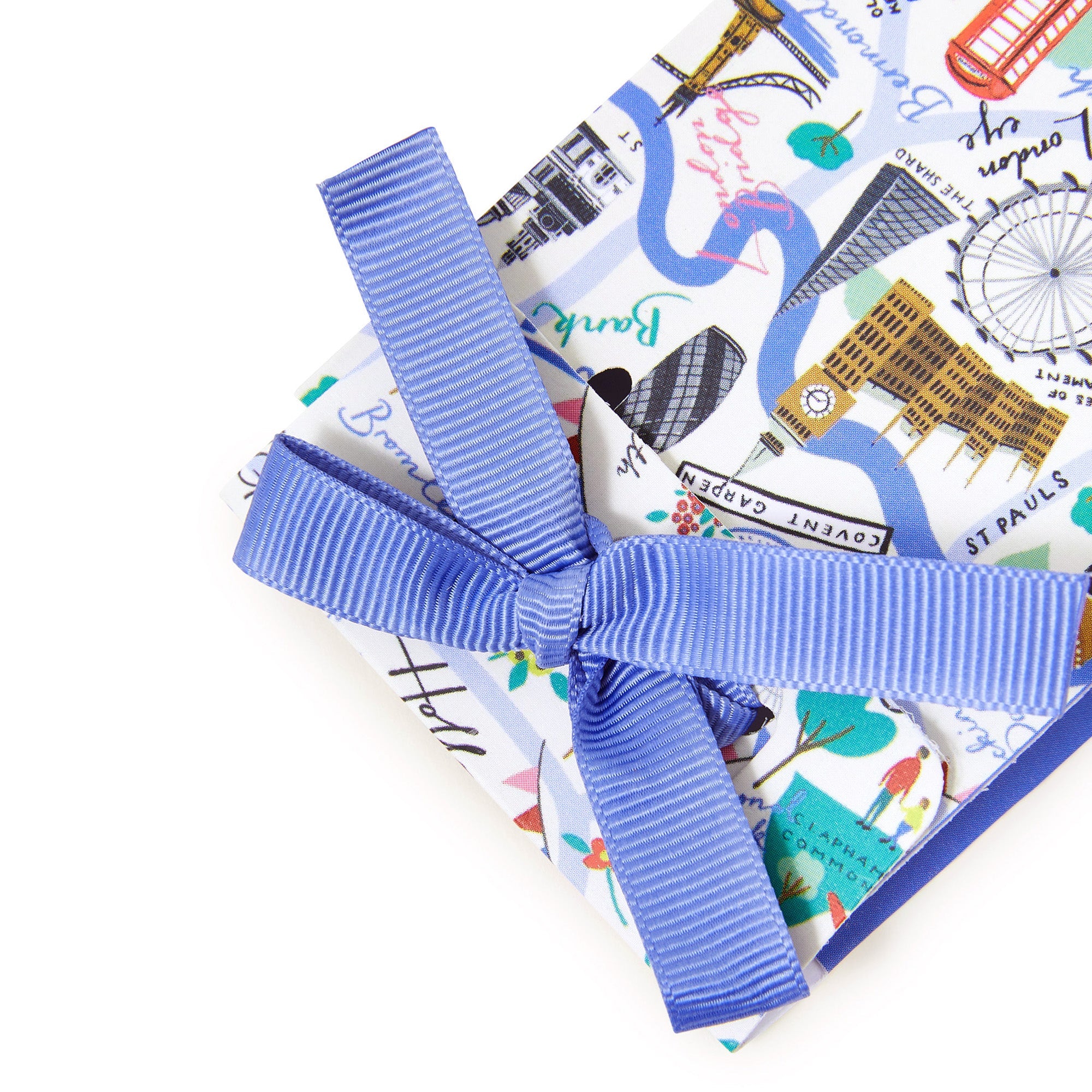Great for jewellery and other smaller gifts, this petite gift pouch has an adorable London print outer with a blue bow to finish.