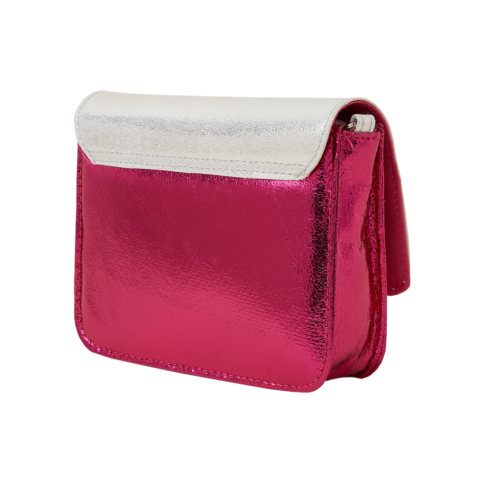 The perfect place for their toy phone, lip balm, and a few sneaky sweets, this cross-body bag is coated in shiny metallic faux leather with a rainbow design to the fold over flap. Finished with an adjustable strap to sit across the body.