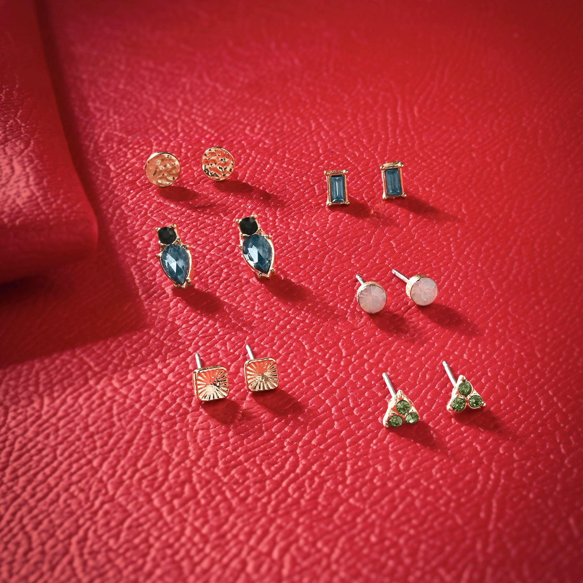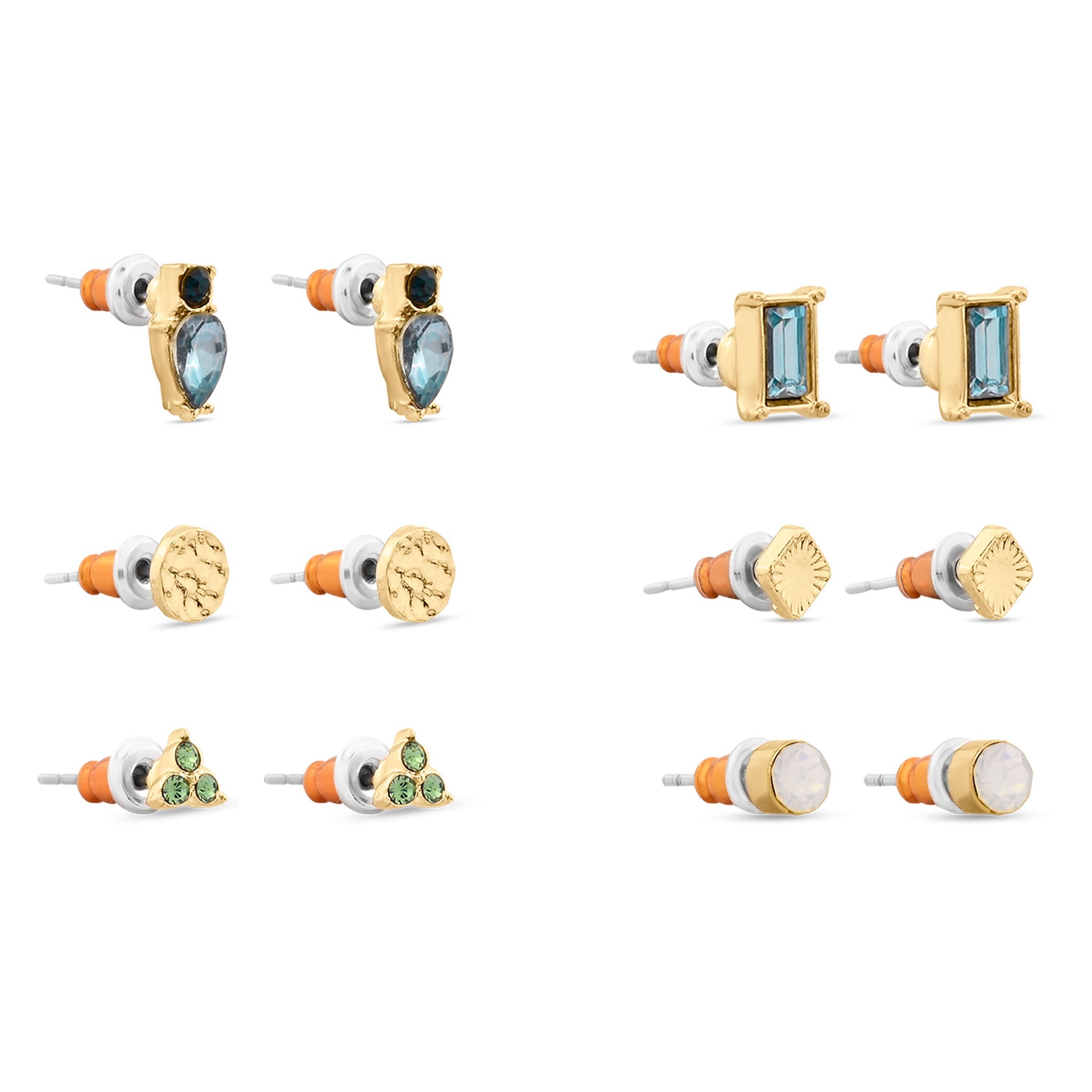 Let everyday sparkle with this pack of stone-embellished earrings, featuring simple geometric studs and colourful gems. Six pairs of earrings included.The Post and Back lock offers both security and ease of wear, providing a comfortable fit while keeping the earrings securely in place
