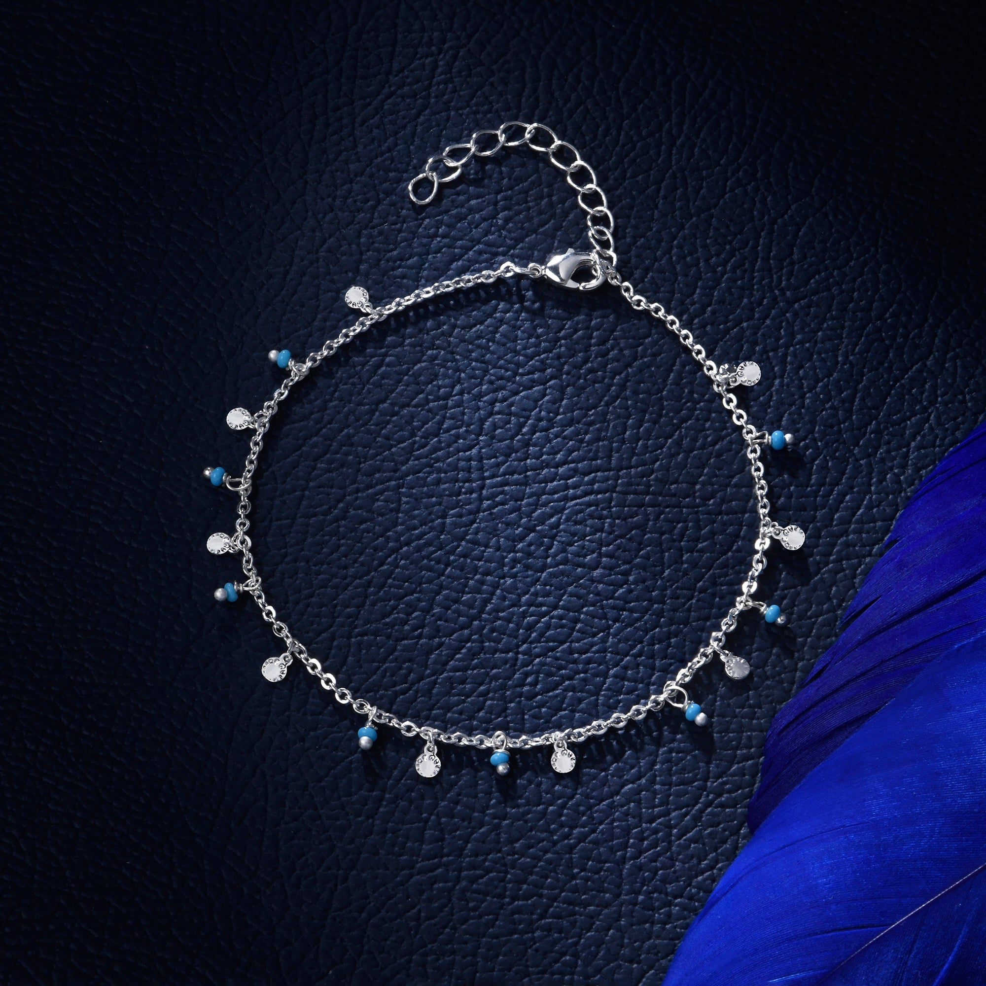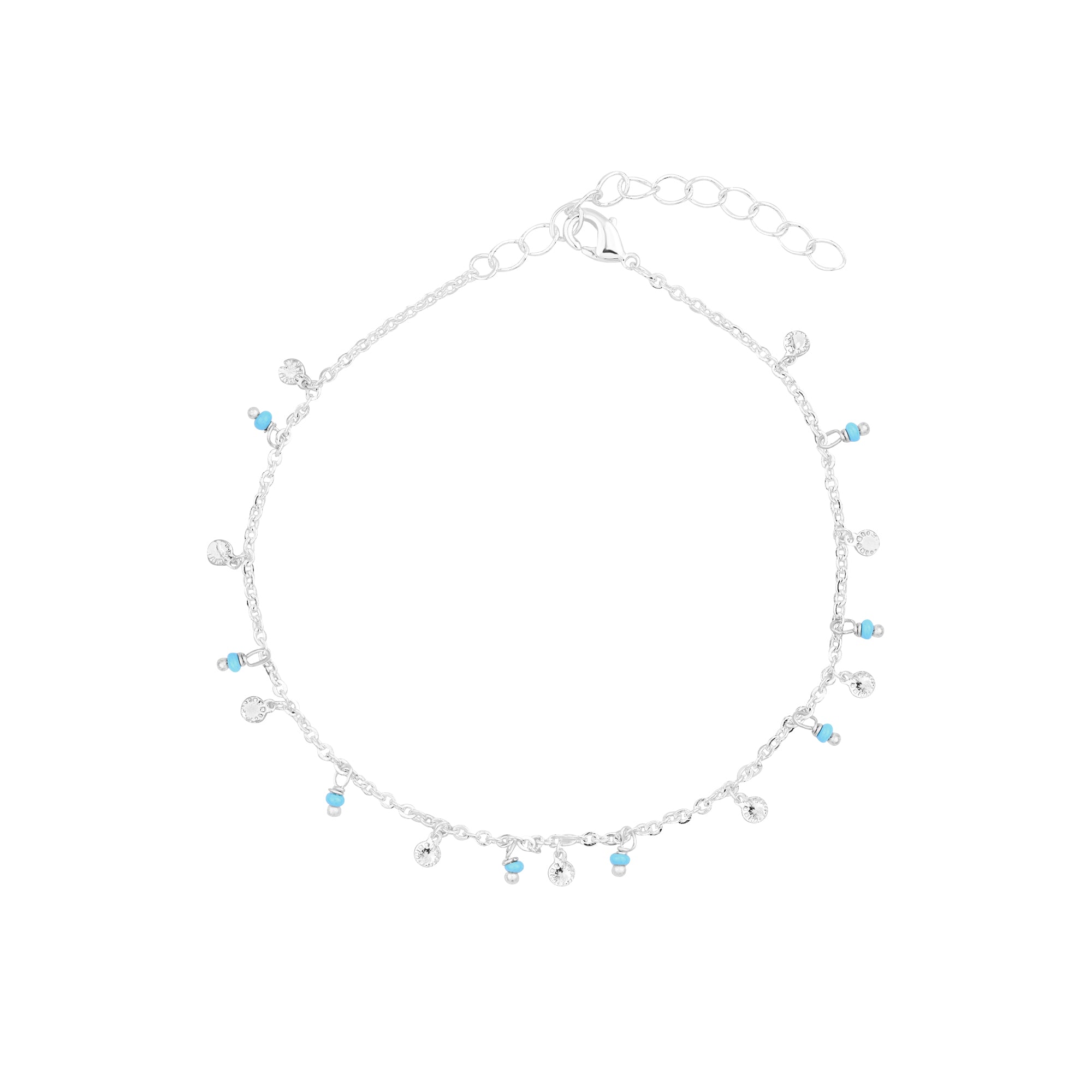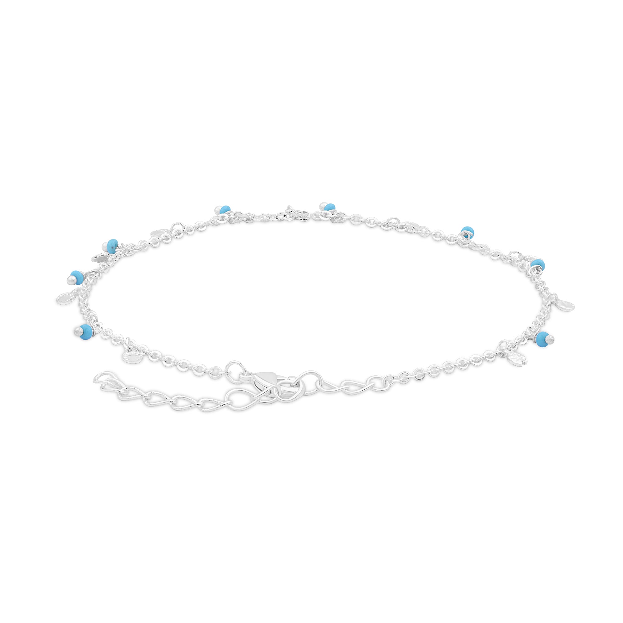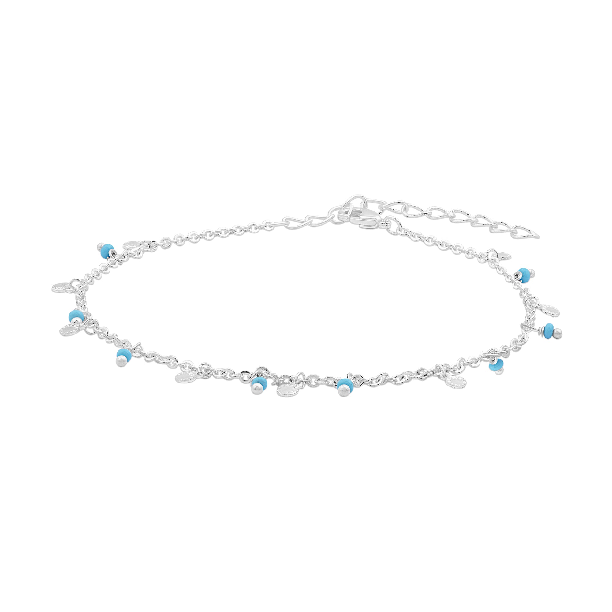 Refreshing turquoise-tone beads adorn this anklet, emulating the clear sea on your holiday travels. Linked together with a sterling silver-plated chain, style it to surf lessons on the beach and wanders around the local markets. Fastens with a lobster clasp and extender.