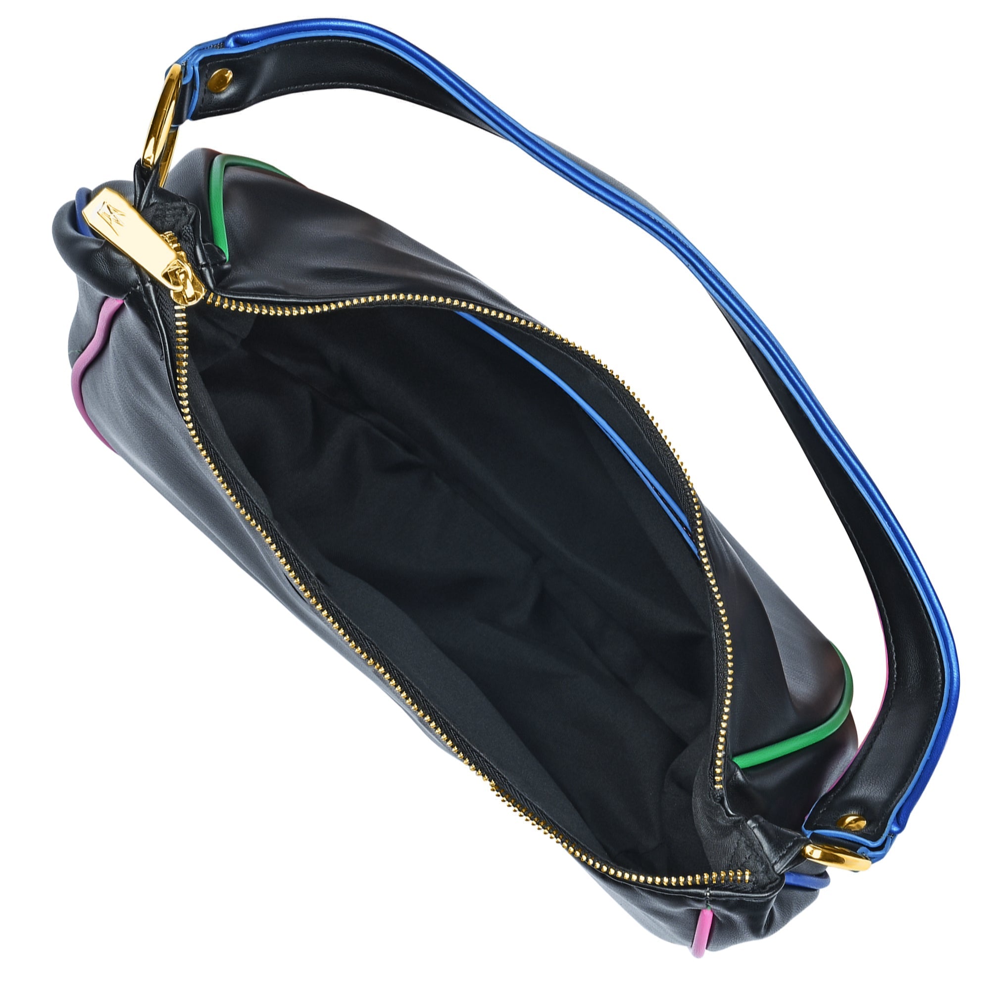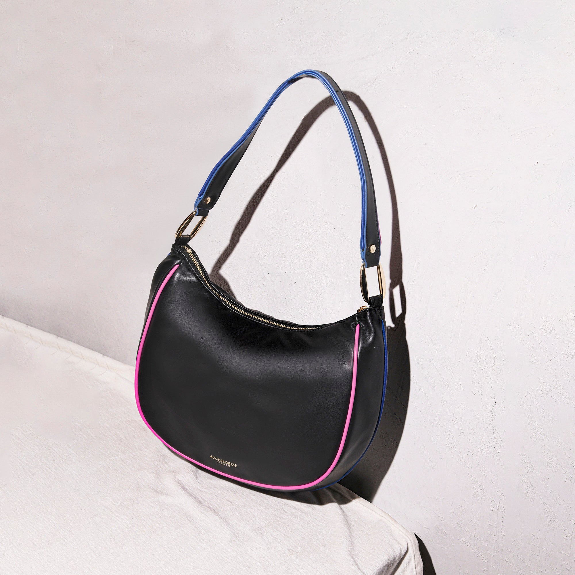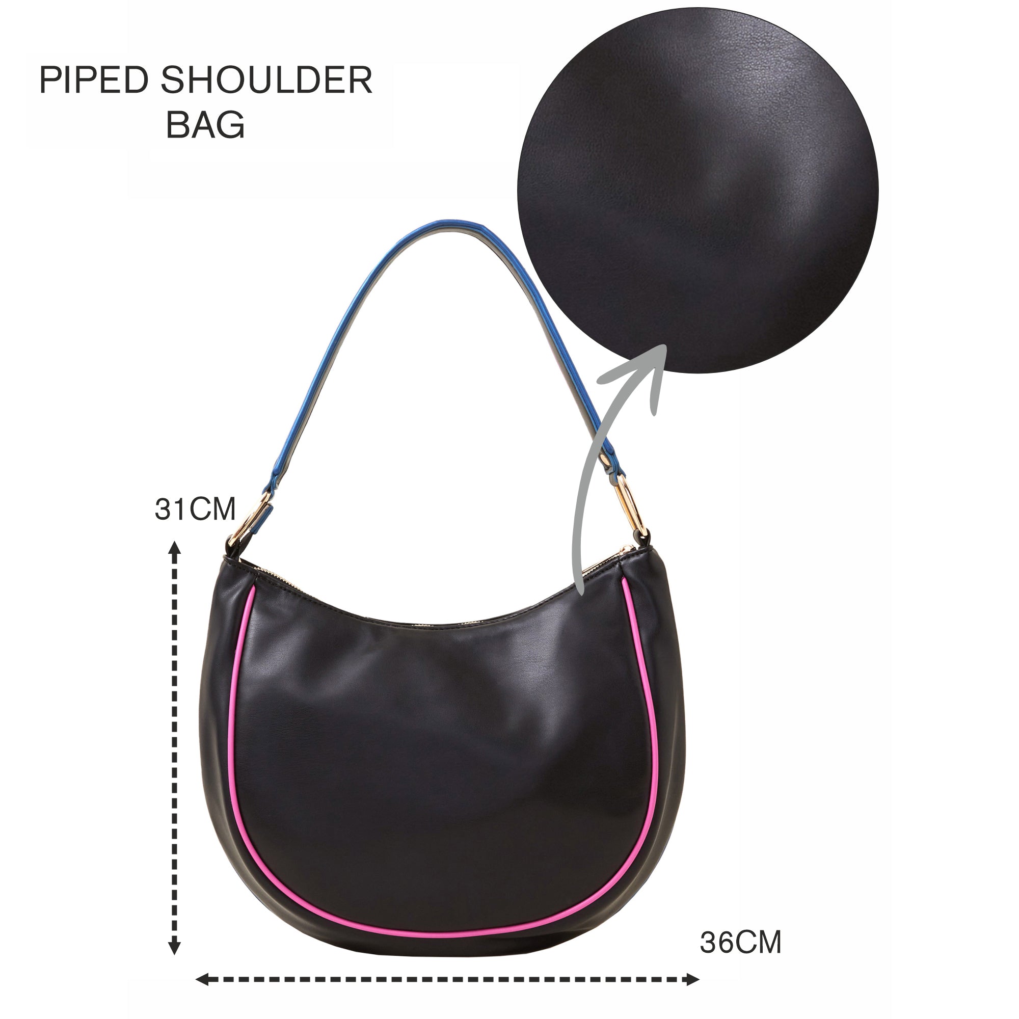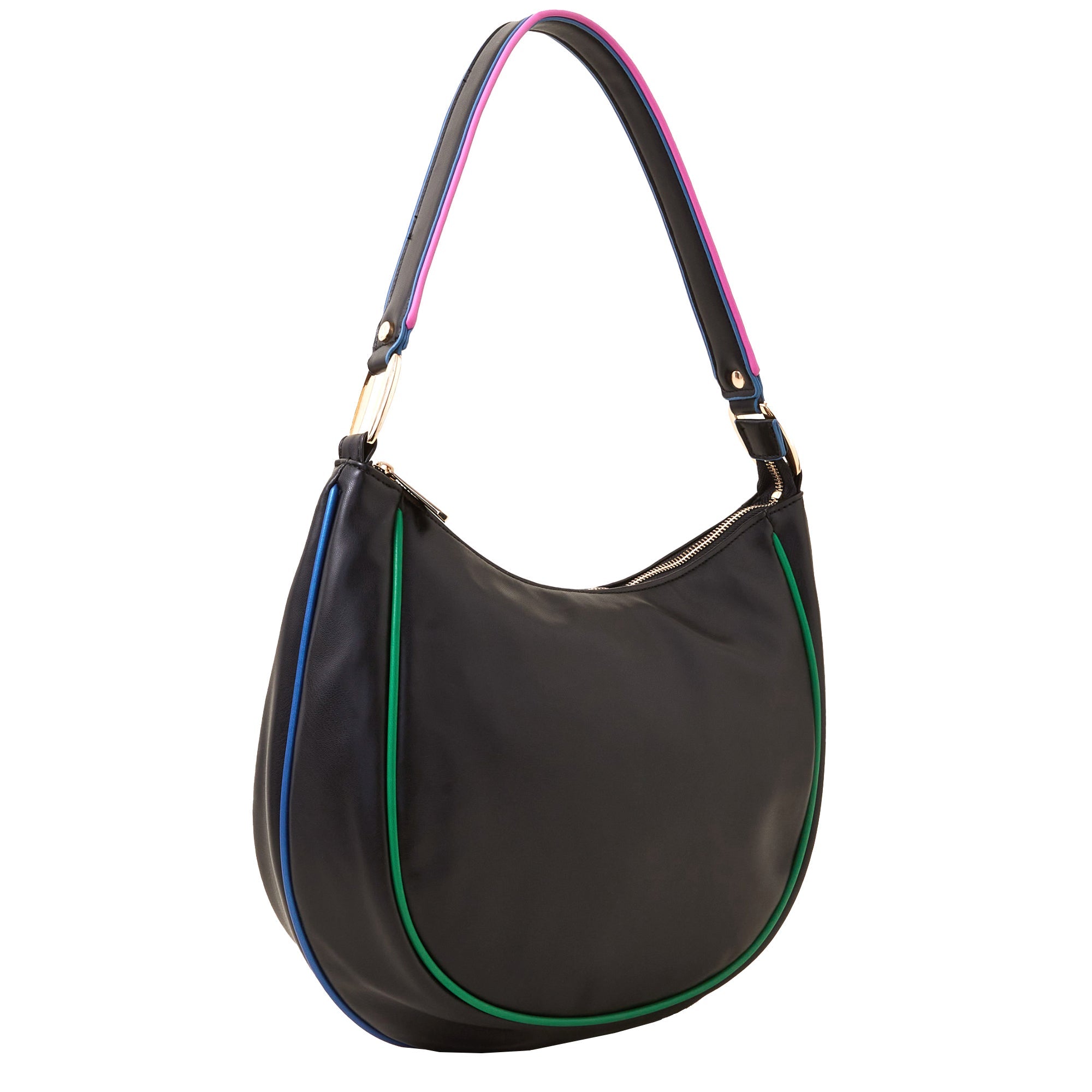 A touch of the 80s. Practical and ready to party, this shoulder bag is designed with shiny faux leather and contrast neon piping. It features a zip fastening along the scoop profile, with a secure shoulder strap for easy carrying. Black