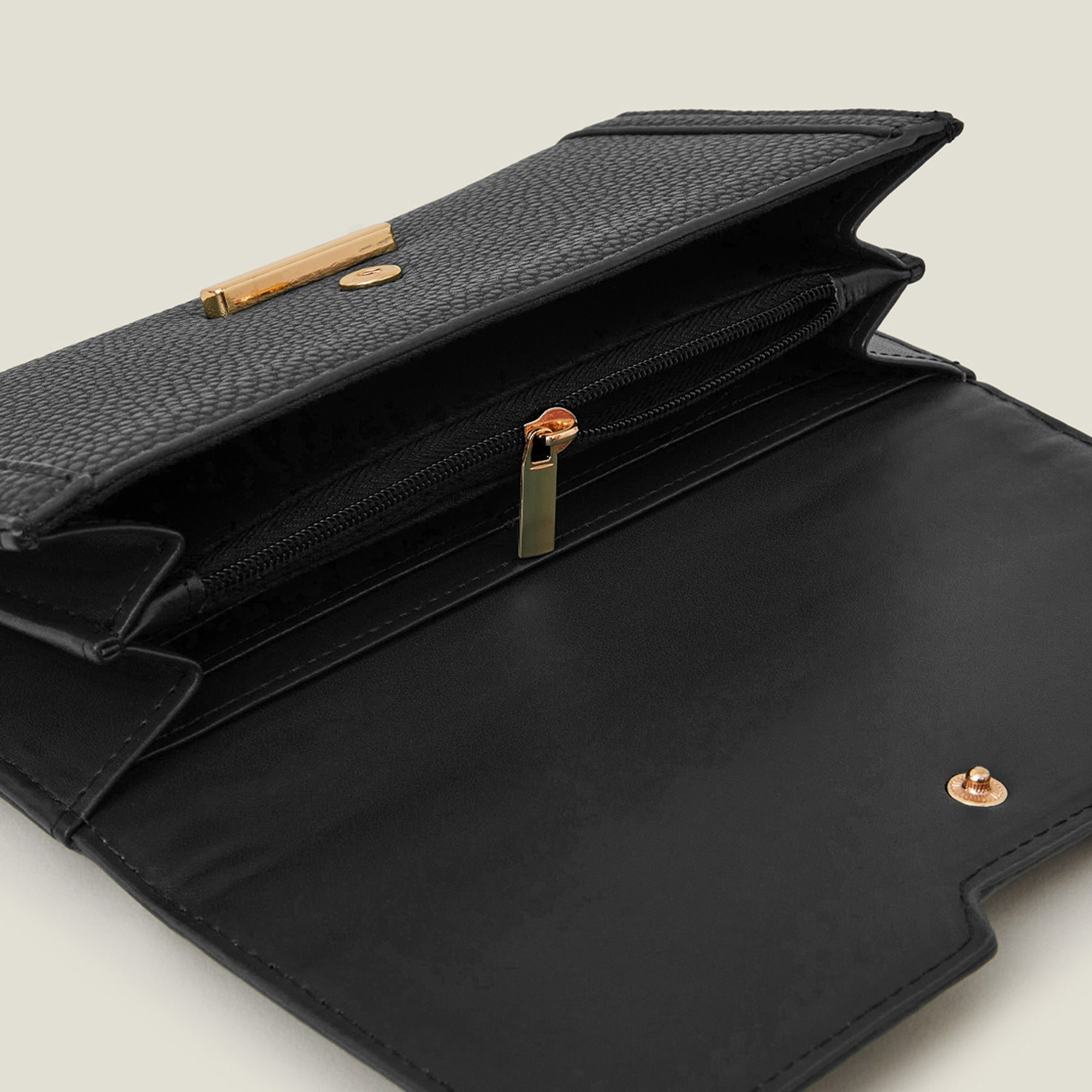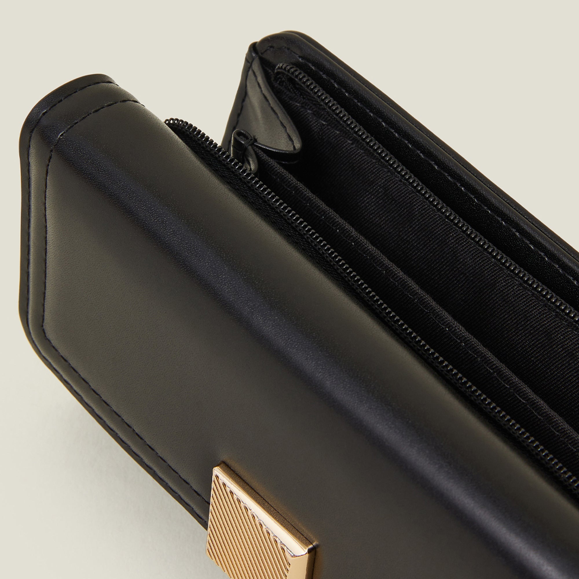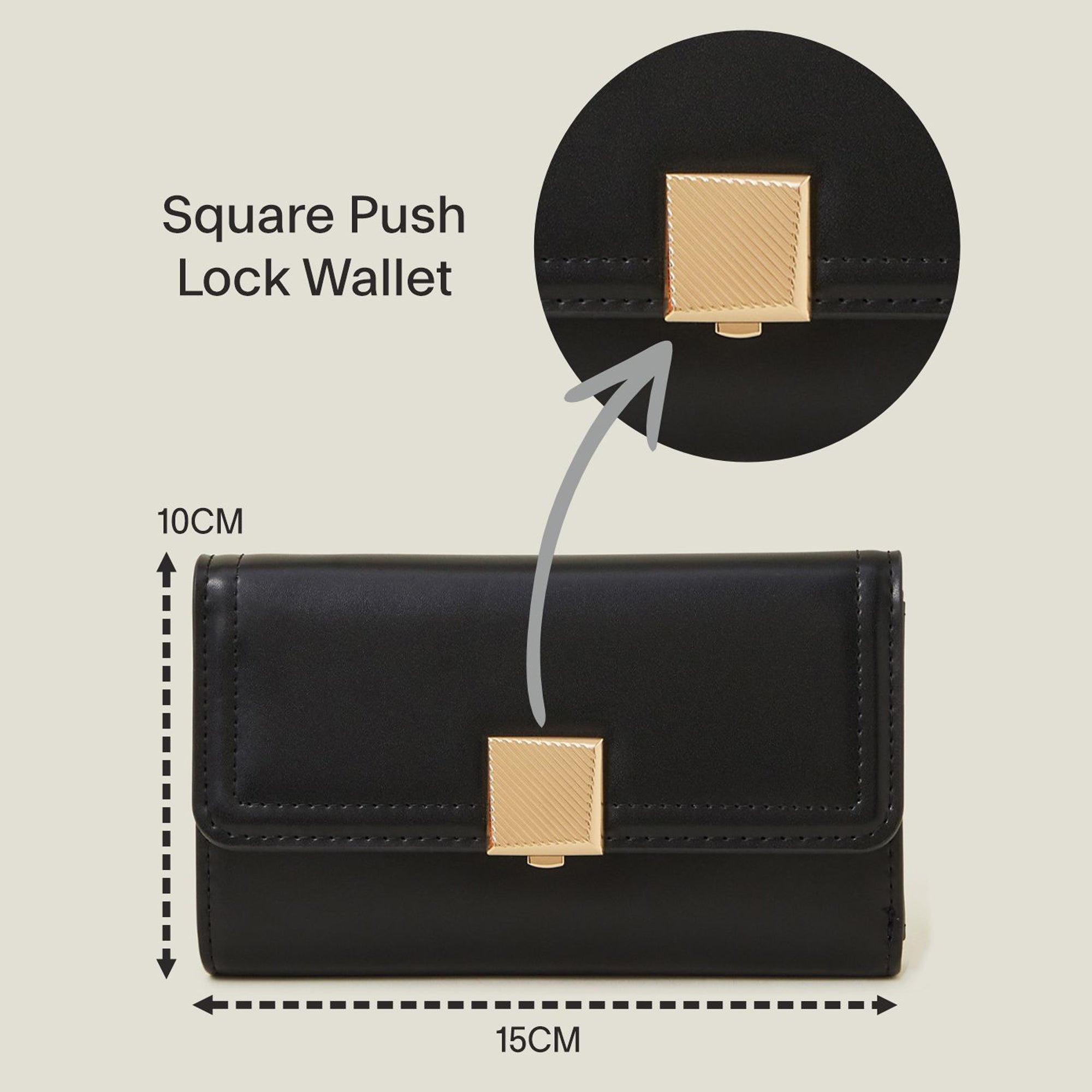 Cute and compact, this card holder-purse hybrid will keep everything together for trips in the handbag. To the inside is eight card slots and a zip compartment for cash. Fastens with a gold-tone push lock