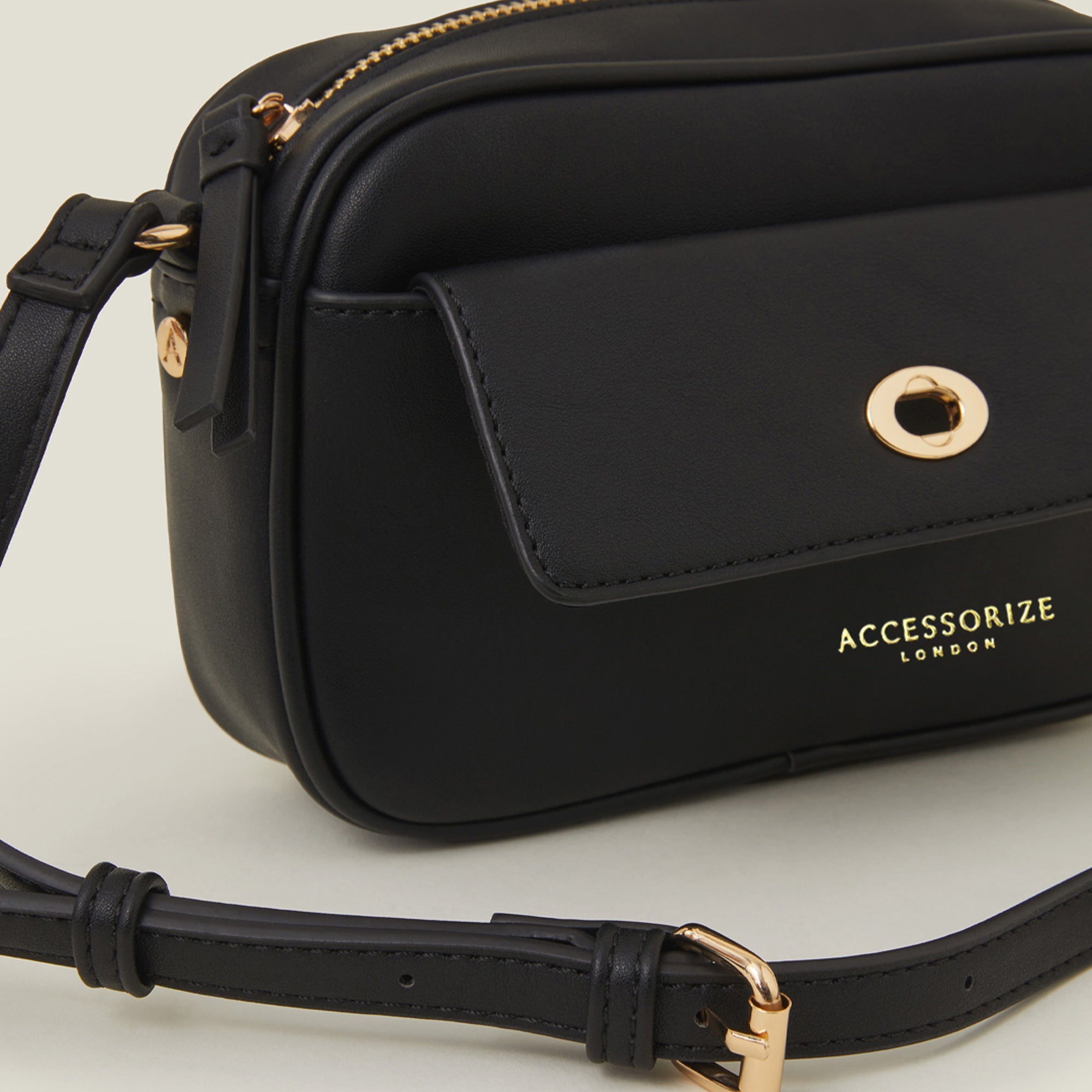 A wardrobe essential that stands the test of time. This crossbody bag is crafted from smooth faux leather with gold-tone hardware. Designed with an inner zip compartment, top zip fastening and front pocket with a secure twist lock