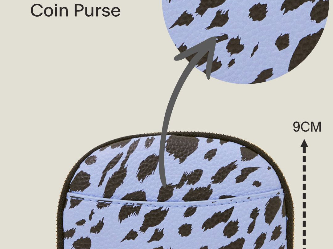 Animal print, all day. Designed with a dalmatian print on a lilac backdrop, this purse is crafted in a crescent profile with a zip fastening to keep your loose change safe.