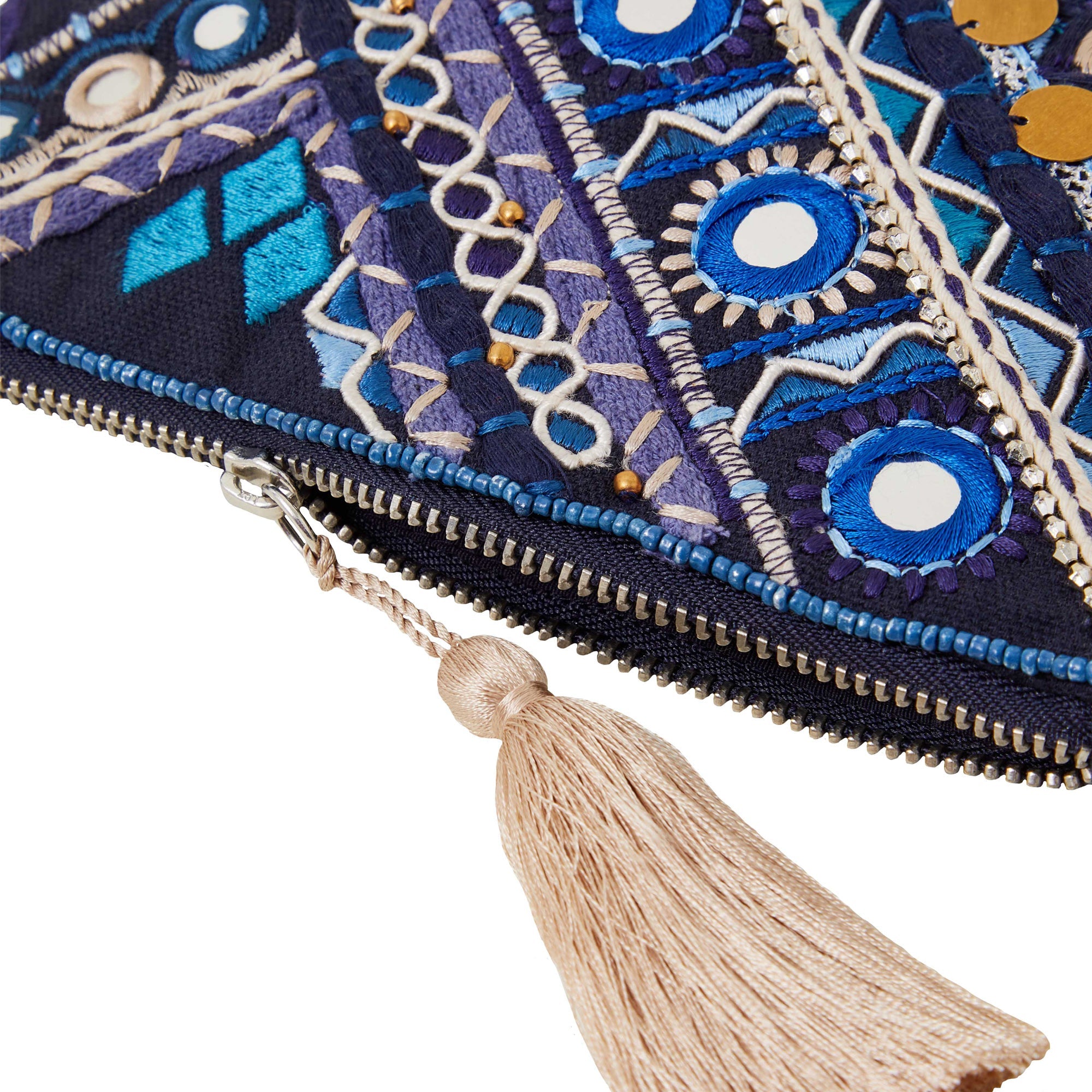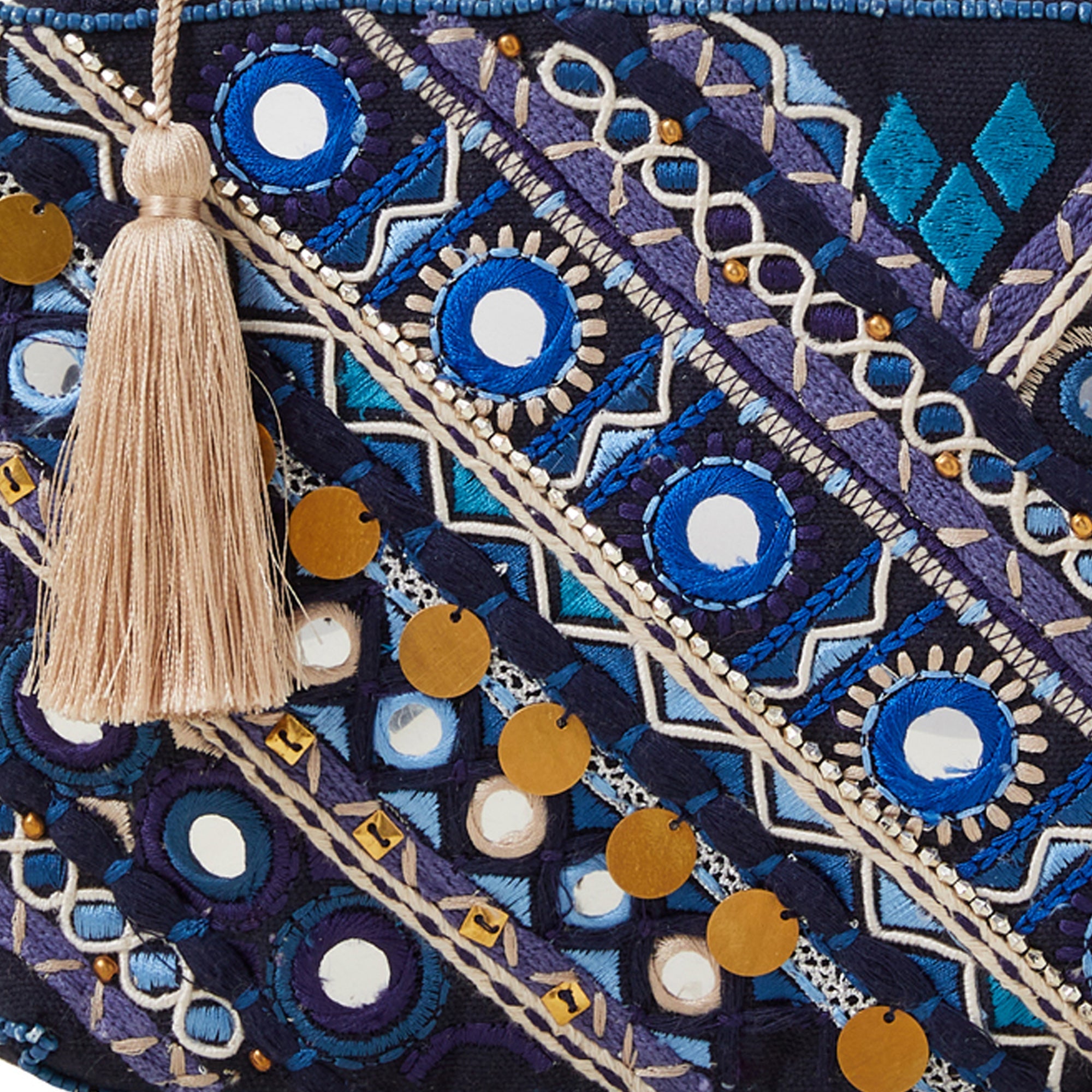 A pouch of possibilities. For your lip gloss, loose change or sunglasses, keep smaller essentials in this pouch. Hand-embellished with bohemian mirror details, beads and embroidery, you'll never lose it. Fastens with a zip.