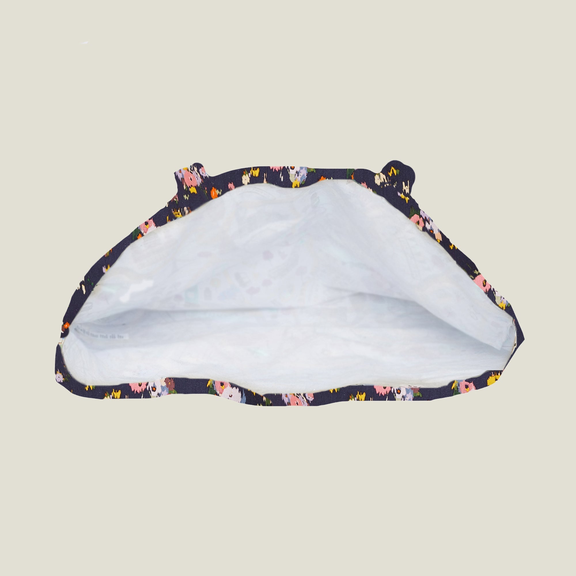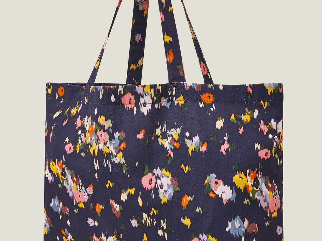A great grocery shopping partner, this large tote bag is patterned with abstract florals over the navy blue cotton canvas. Designed with two shoulder straps and an open main compartment to fit anything and everything inside