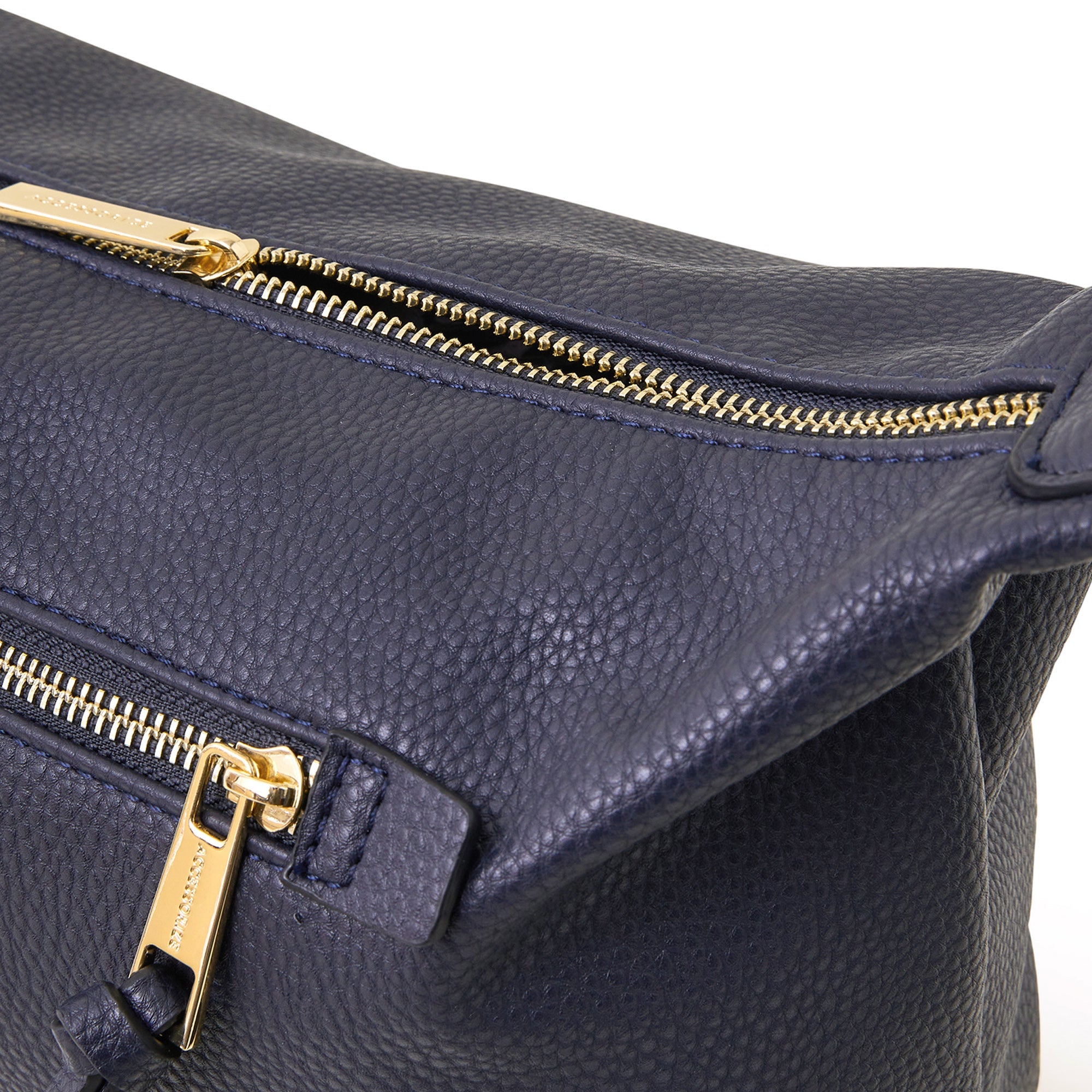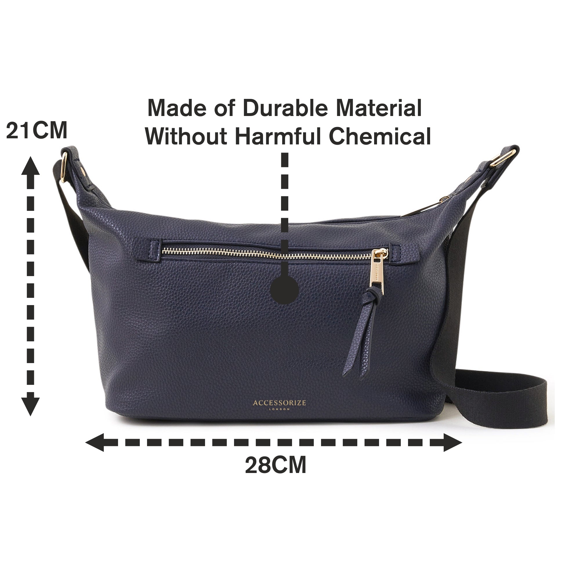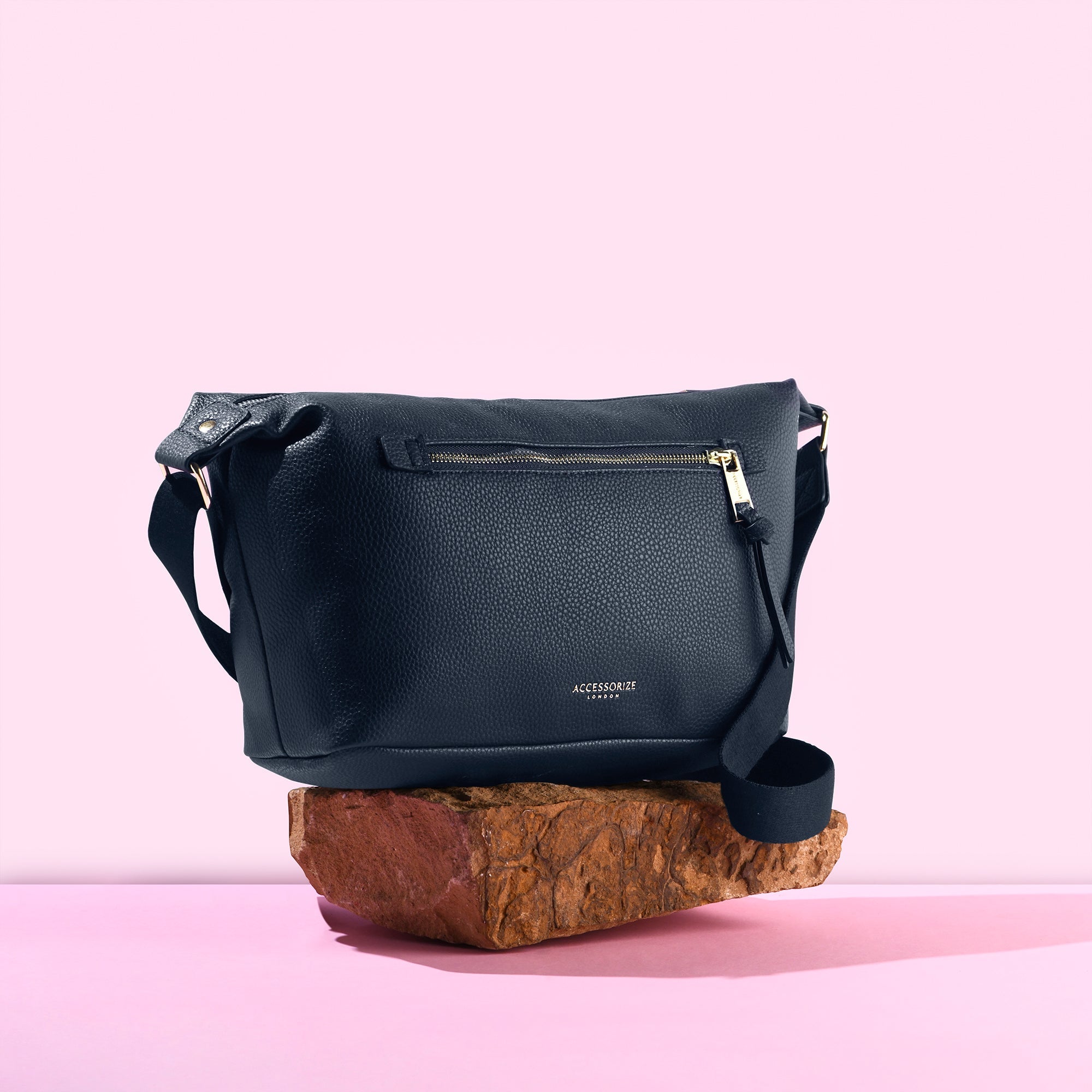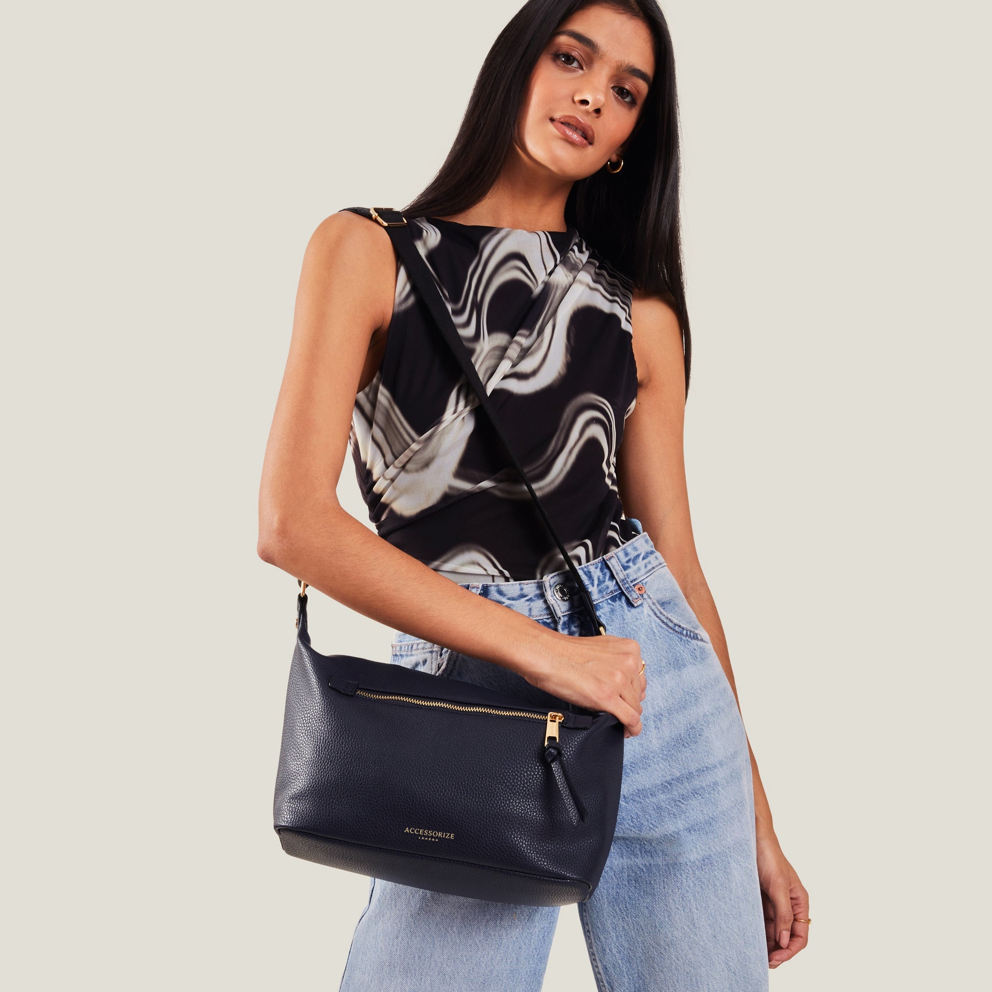 Stress less, this bag goes with everything. Designed in faux leather, it features a soft and slouchy profile that sits cross-body with an adjustable strap. Fastens with a zip. Blue
