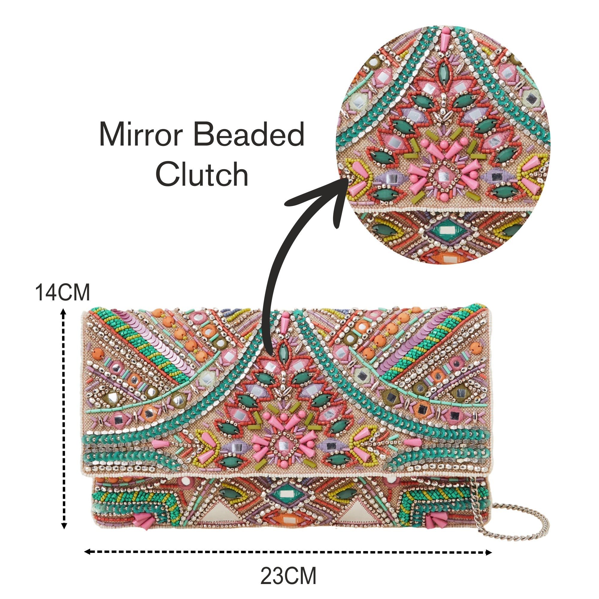 Worthy of Friday night plans, this clutch elevates any look with its beaded embellishments and mirrorwork. Finished with a chain strap that can be tucked in or styled over the shoulder, and fastens with a magnetic closure.