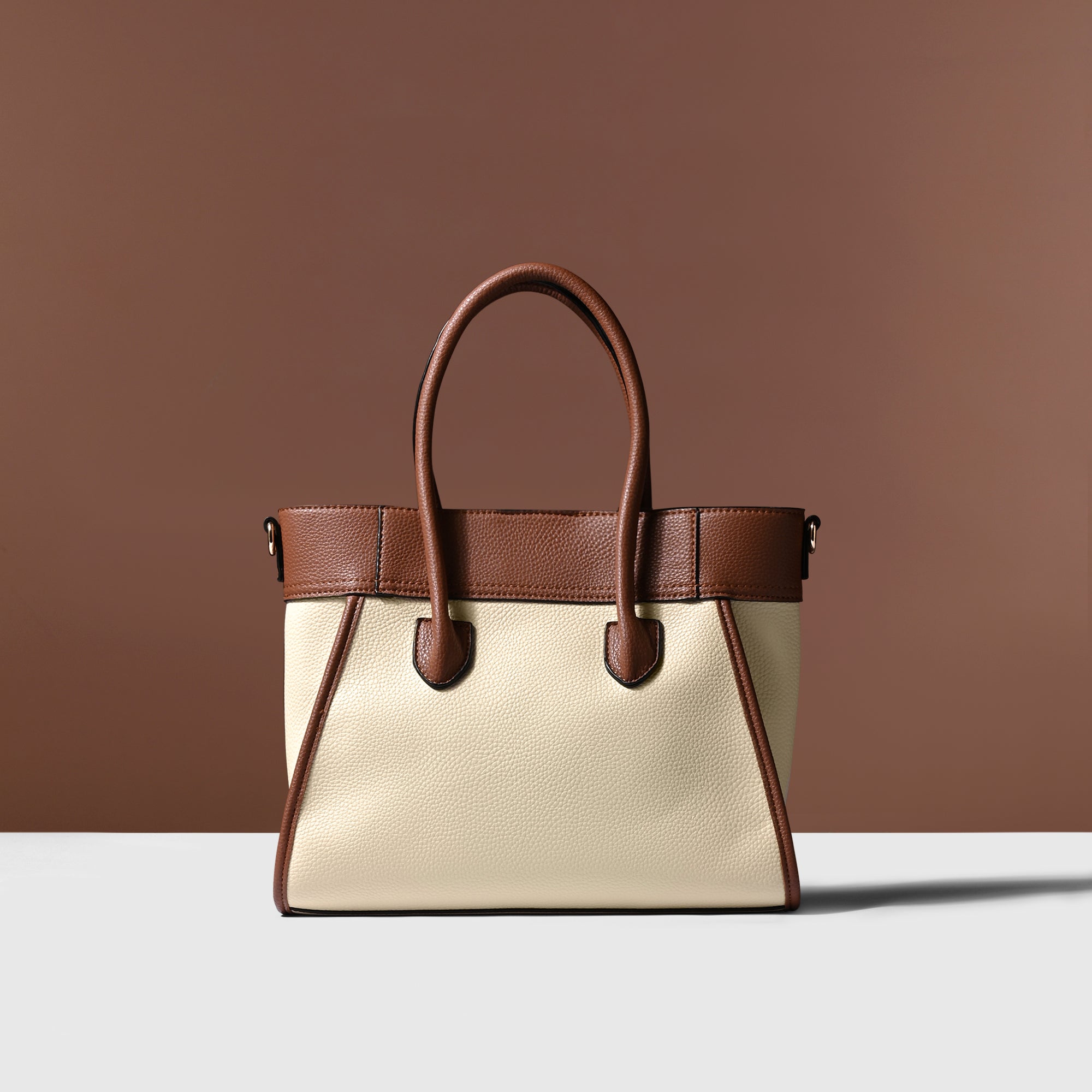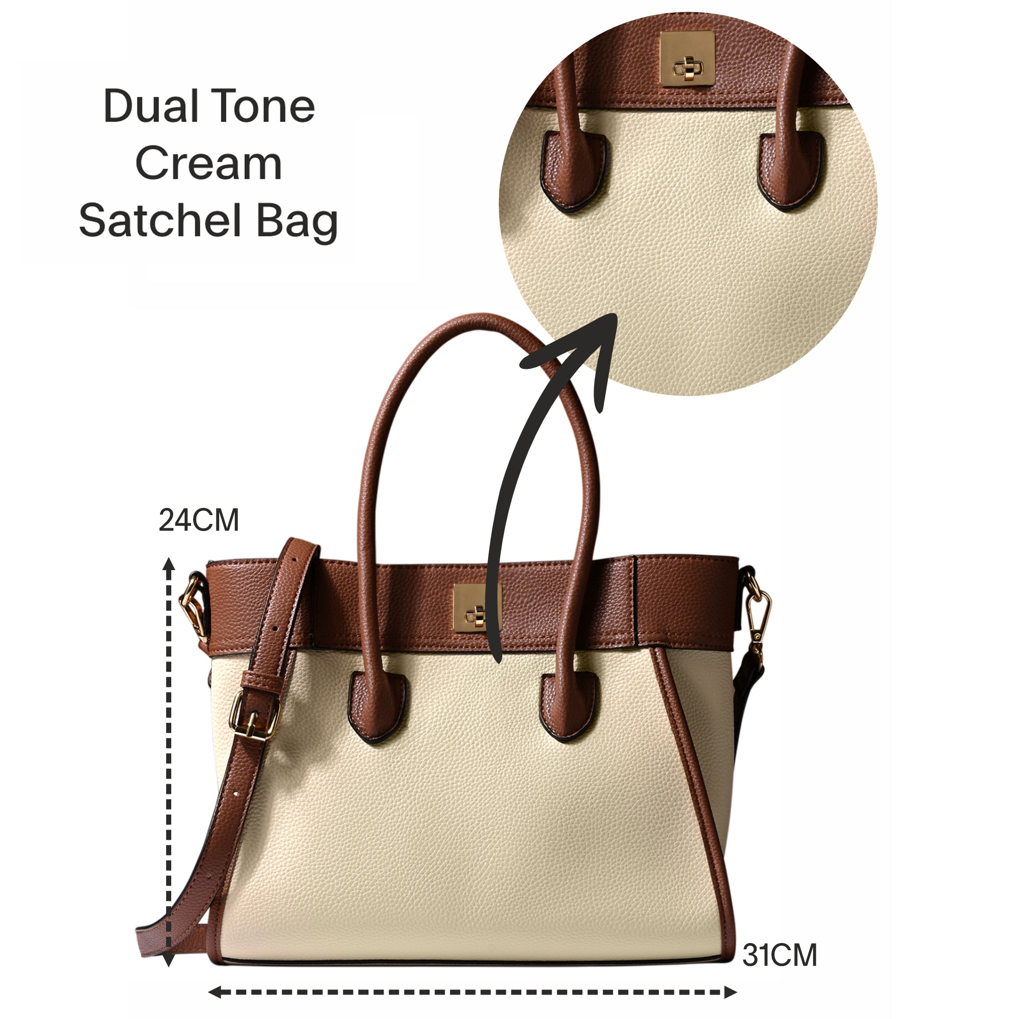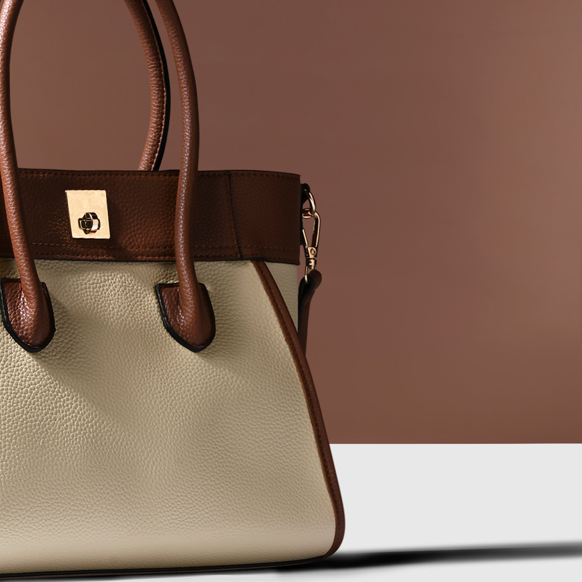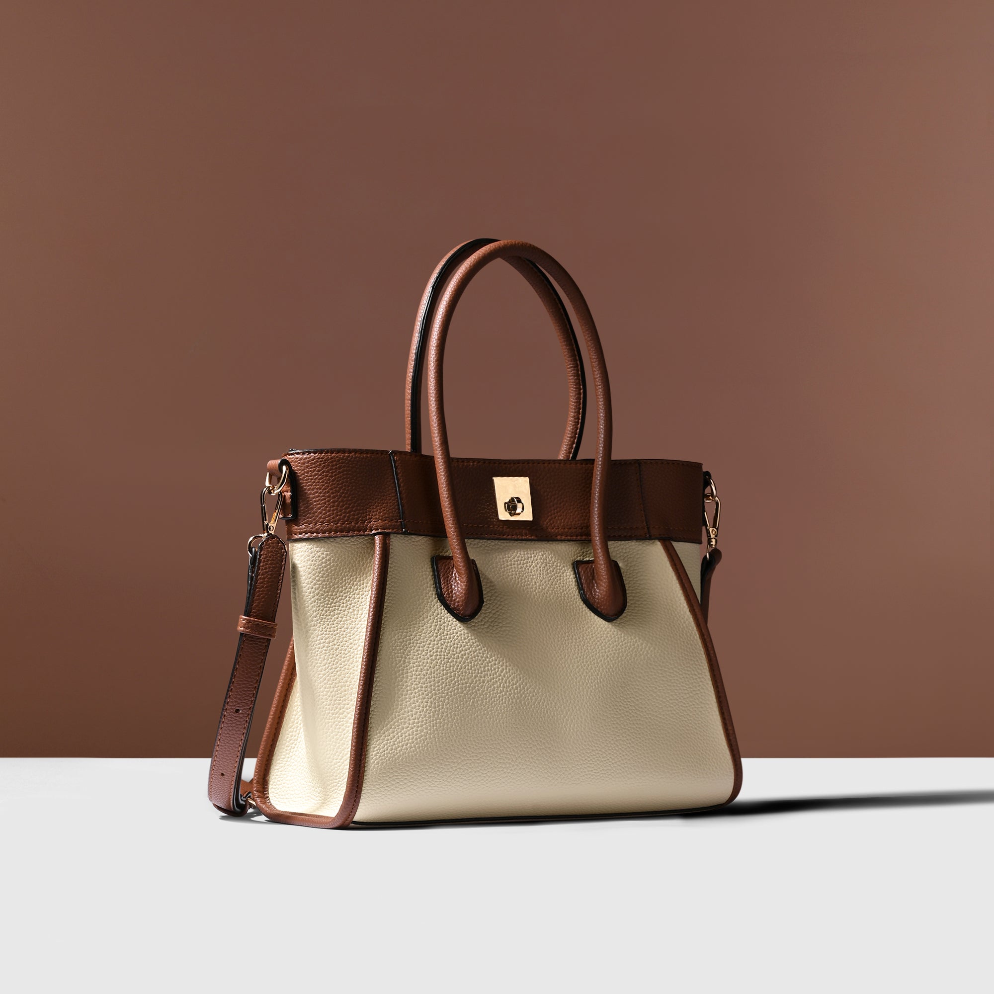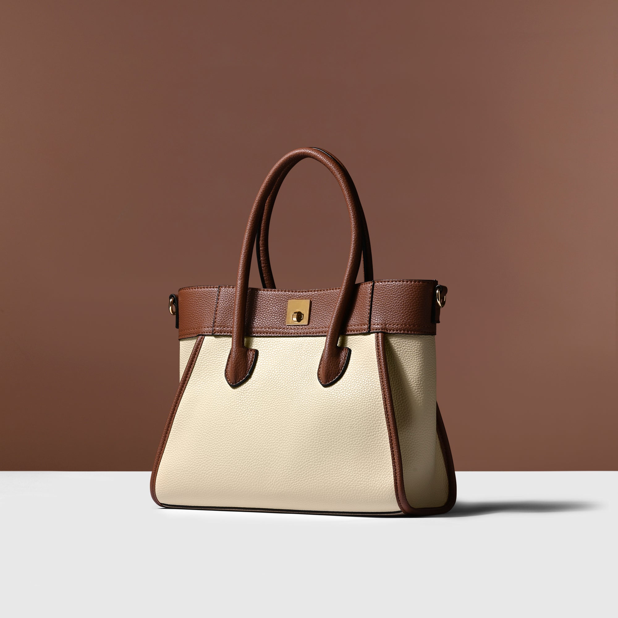 Add a touch of sophistication to your ensemble with this top-handle handbag featuring a chic dual-tone design and a classic twist lock closure. Versatile and stylish, it comes with a detachable long strap for added convenience, making it the perfect accessory for any occasion.