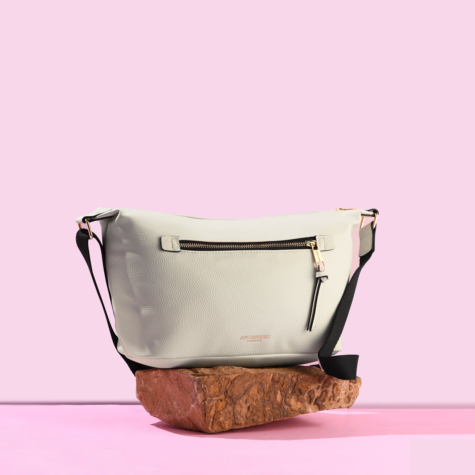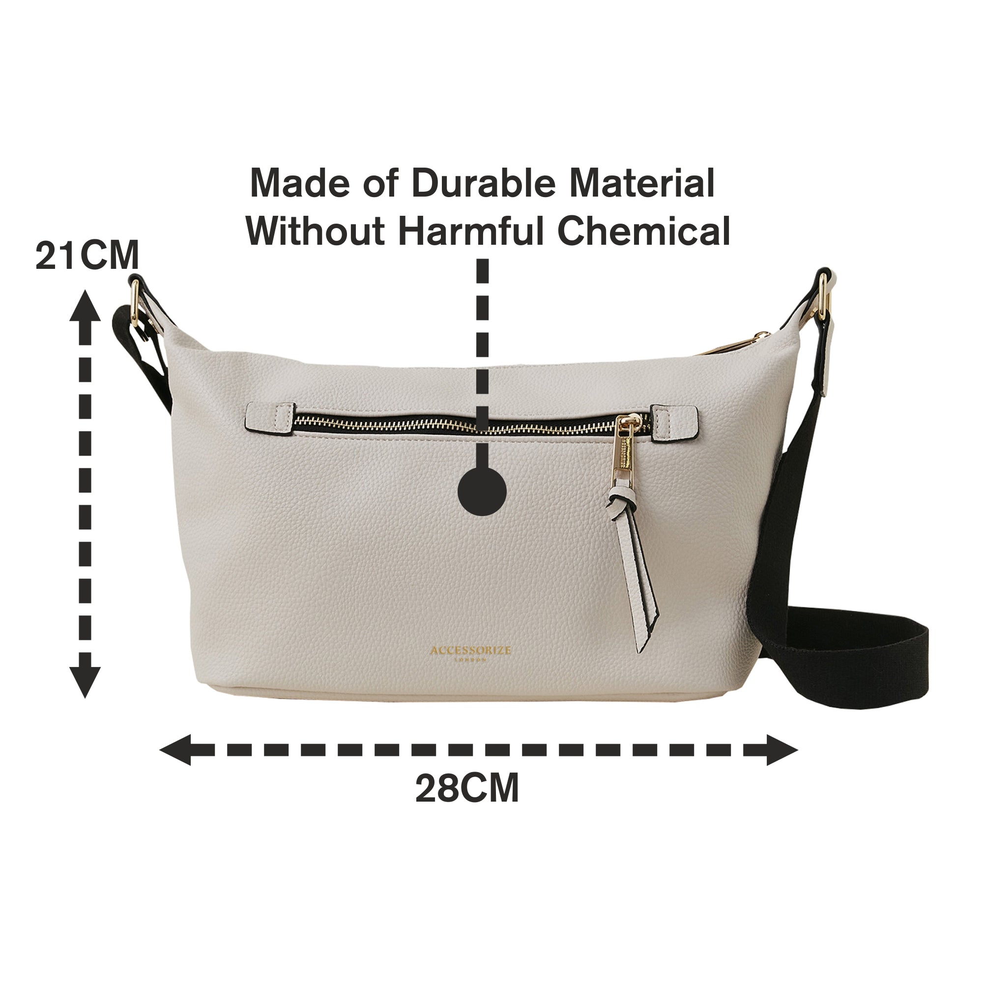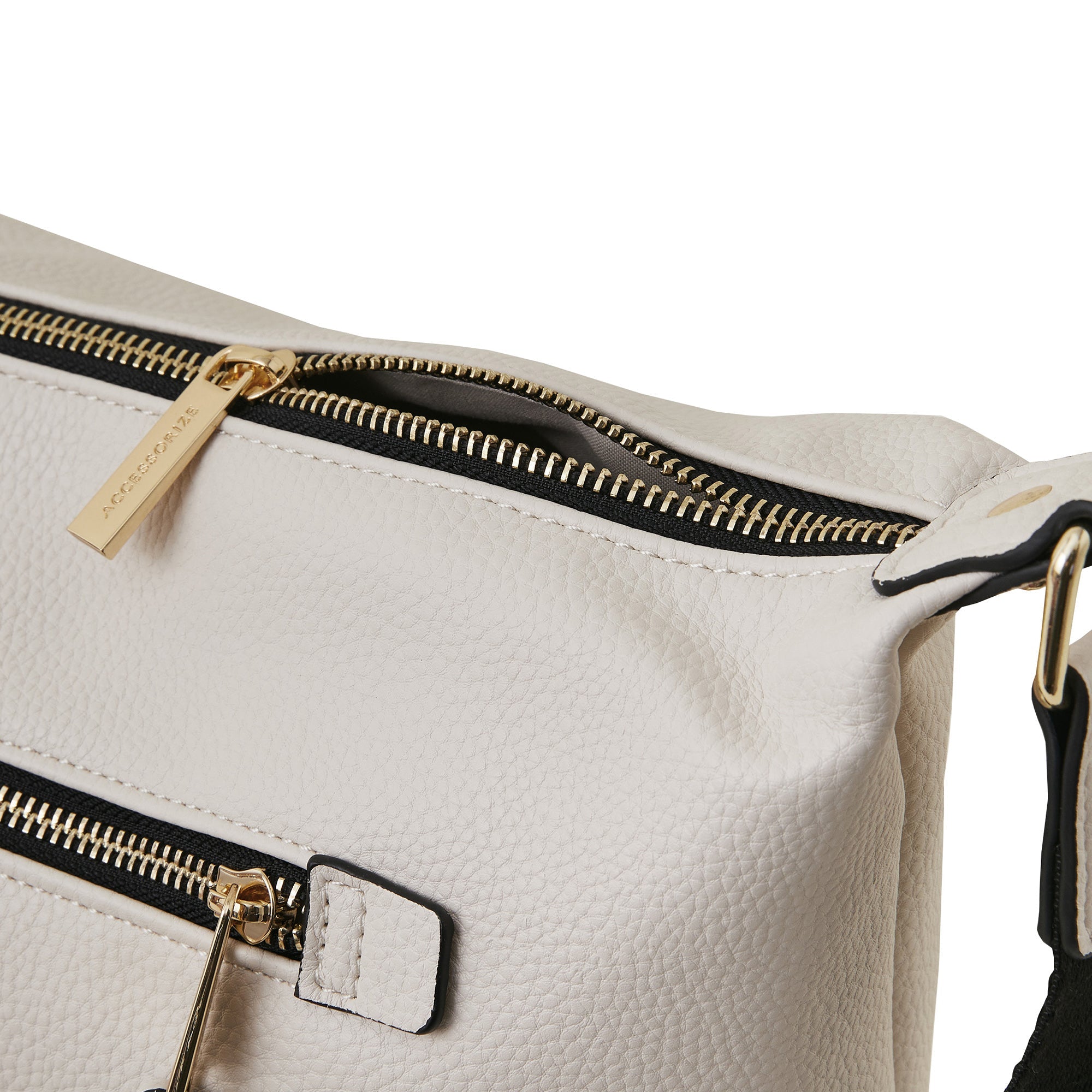 Stress less, this bag goes with everything. Designed in faux leather, it features a soft and slouchy profile that sits cross-body with an adjustable strap. Fastens with a zip. Cream