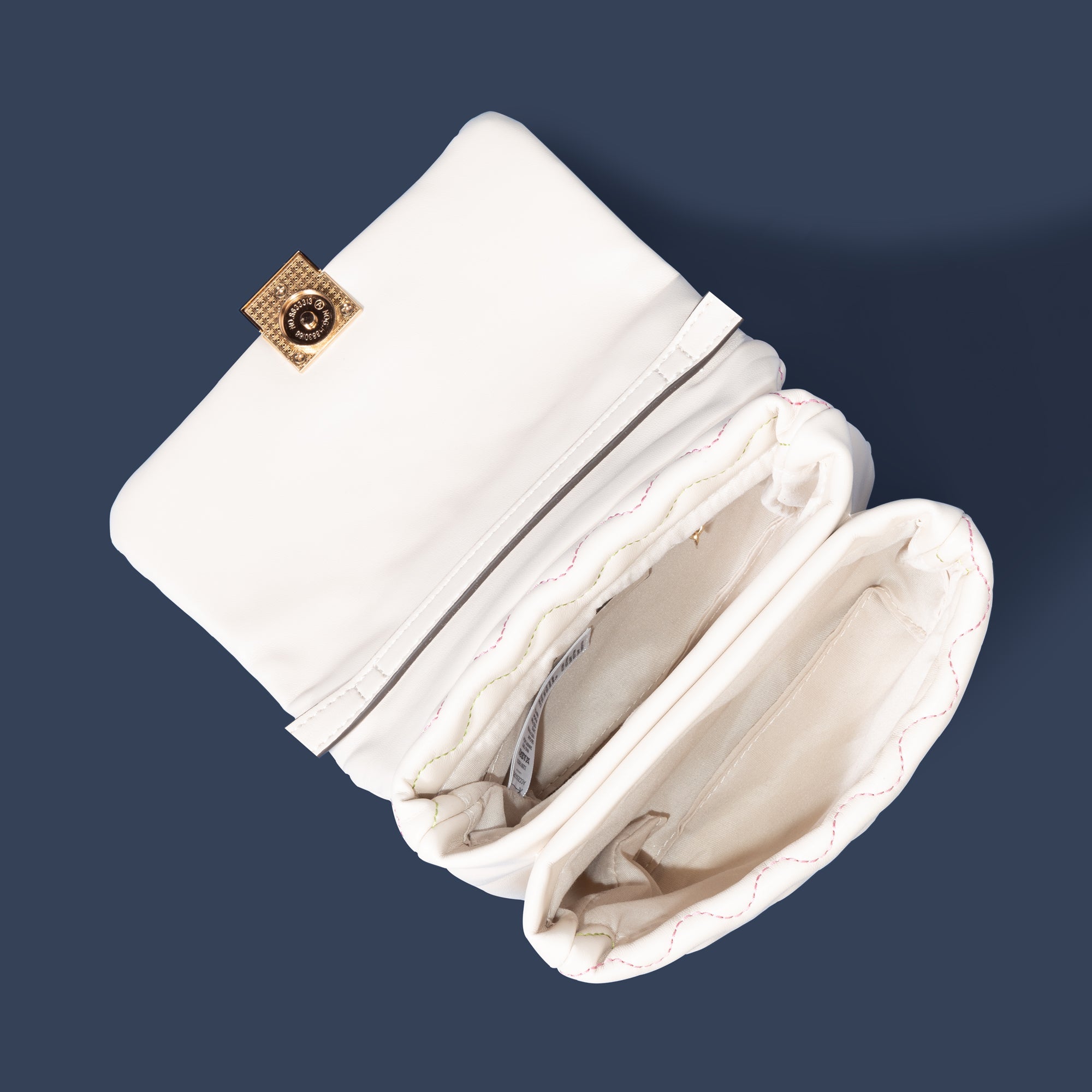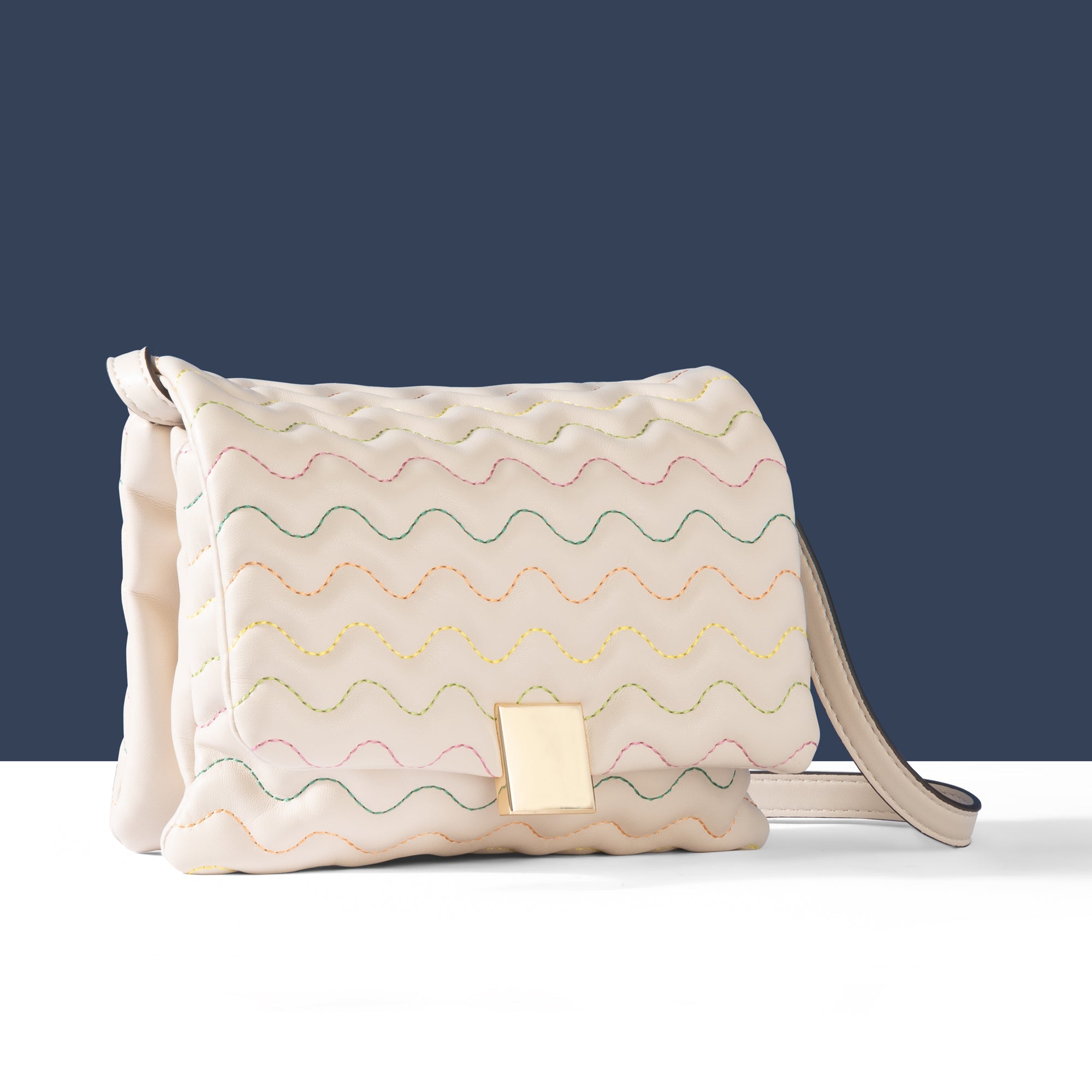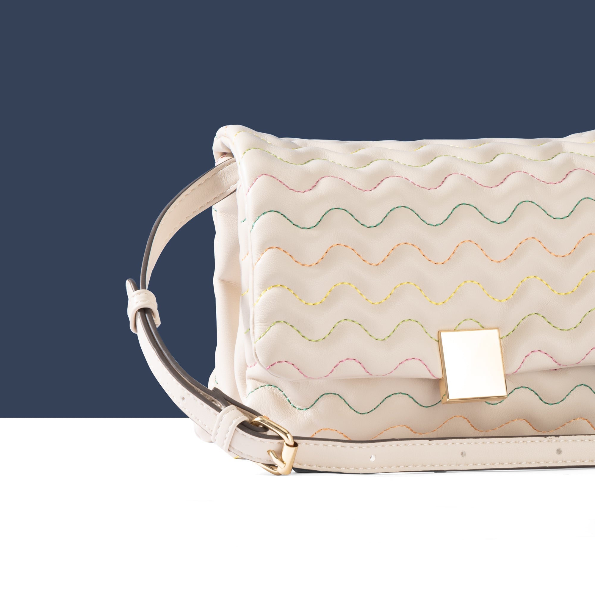 Trying to add colour into your edit? This bag does it subtly. Designed in faux leather, it features wiggle stitching in colourful thread all over, with a profile that's comprised of two separate sections. Finished with a magnetic closure and adjustable strap