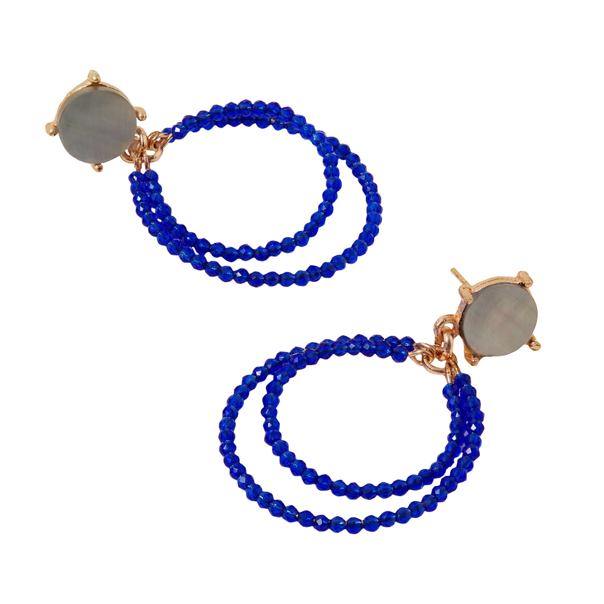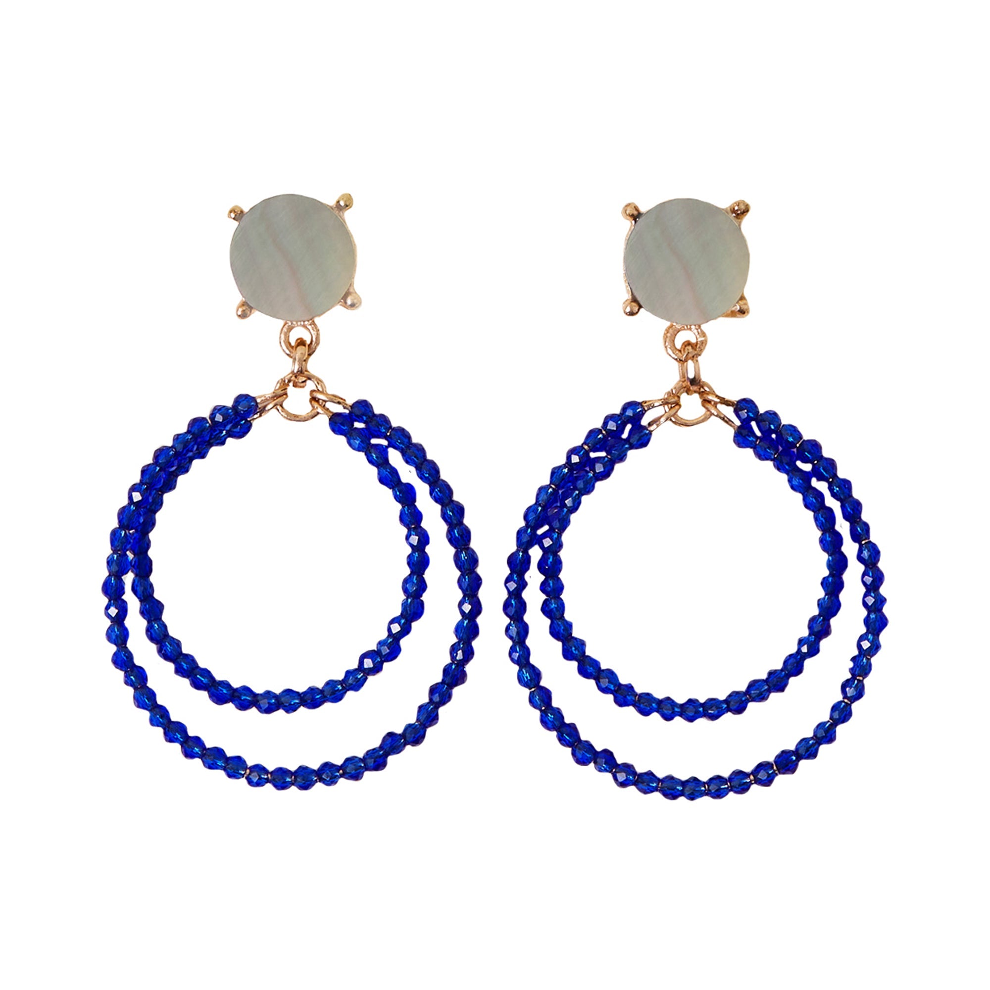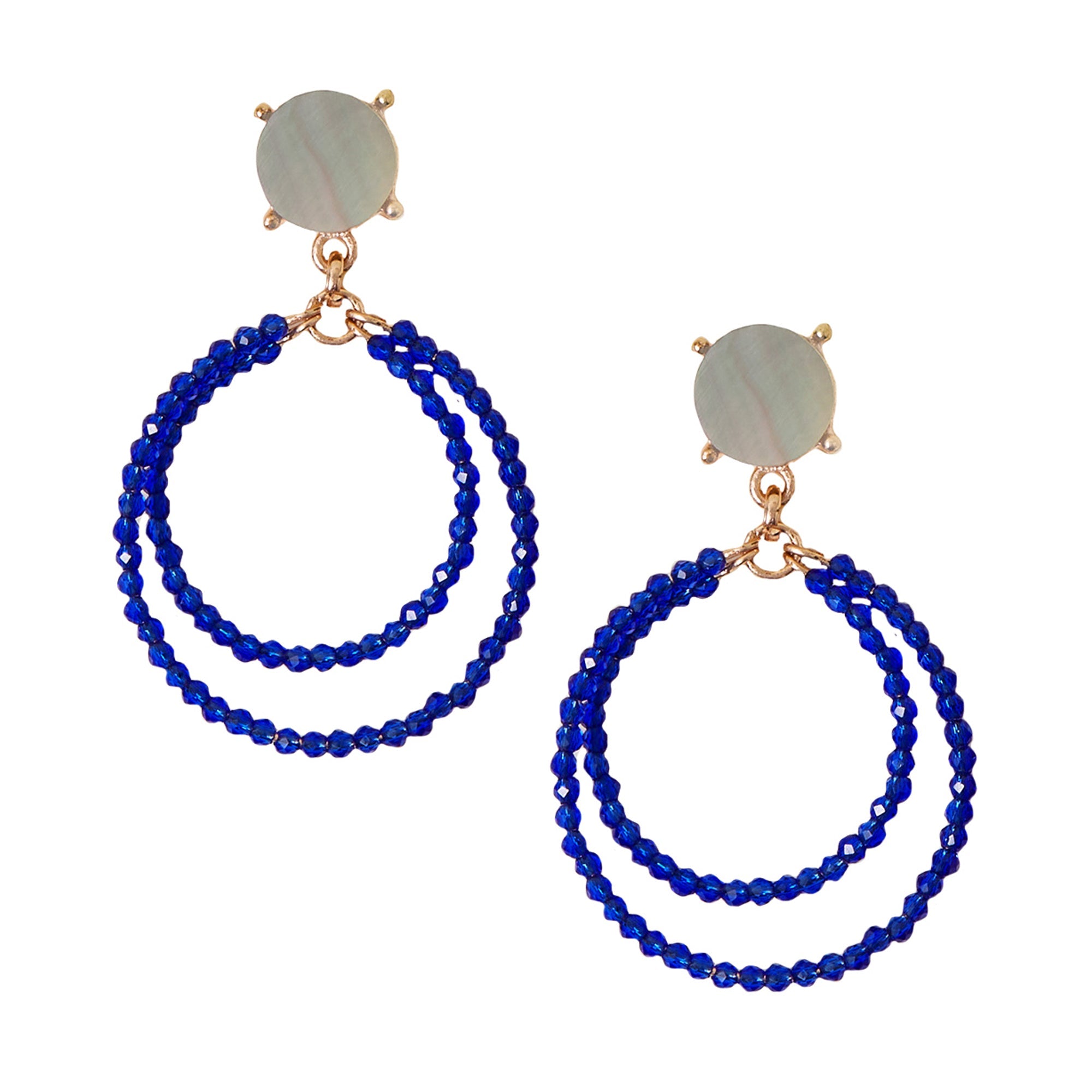 Hanging from a simple Mother of Pearl disc stud, these earrings feature concentric circle drops that are threaded with teeny tiny facet beads.