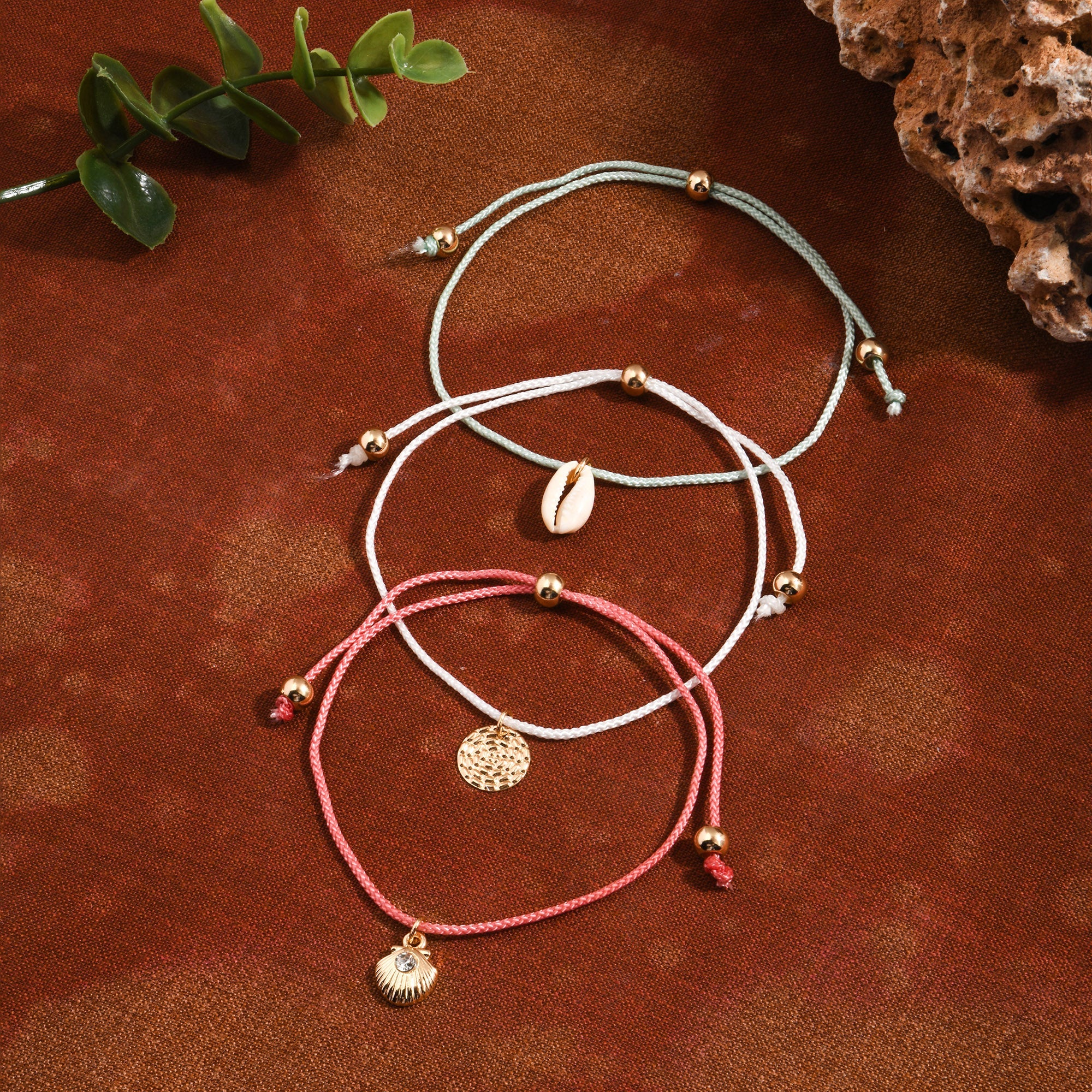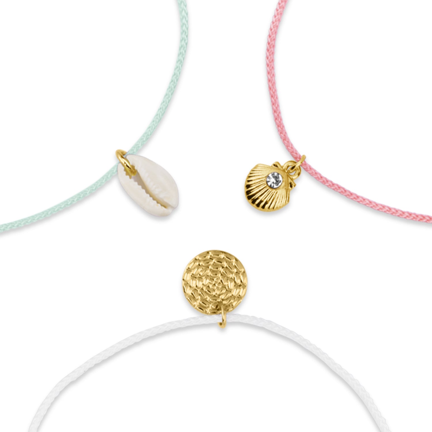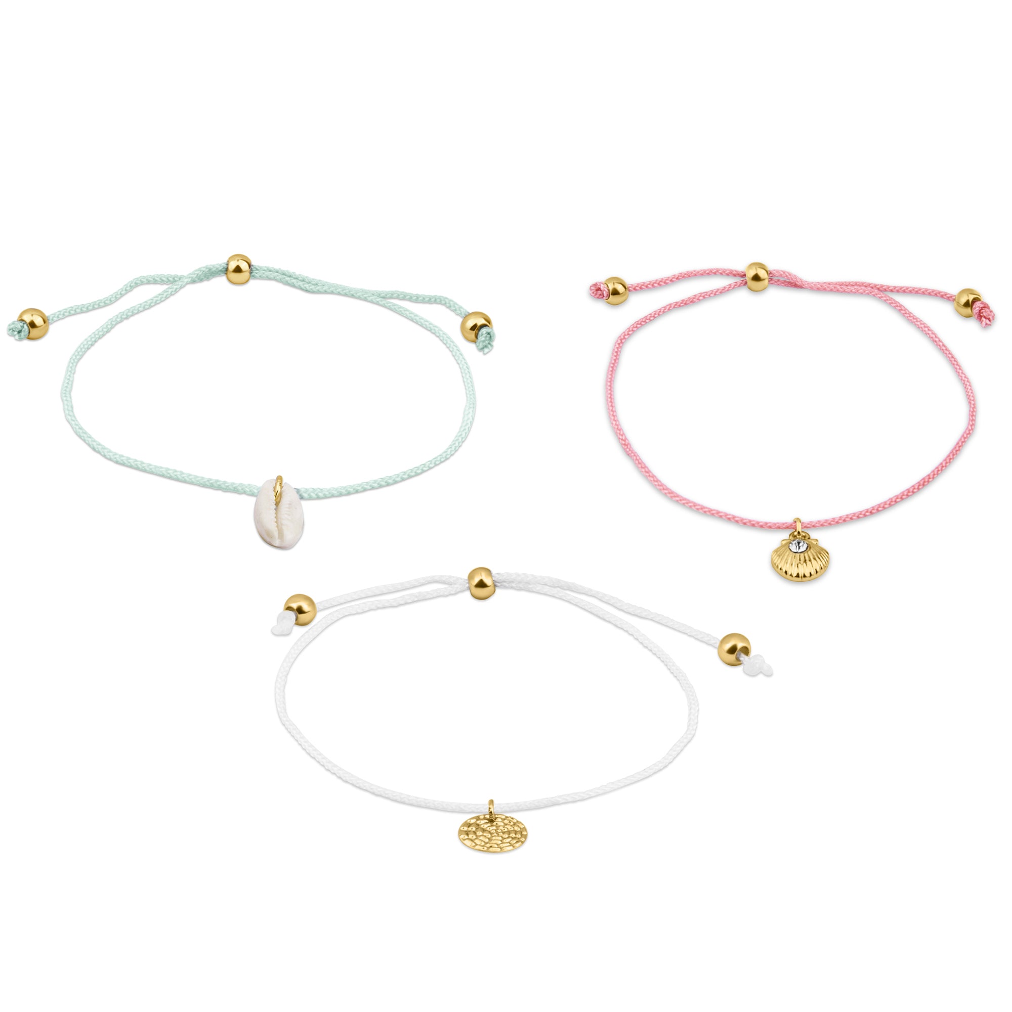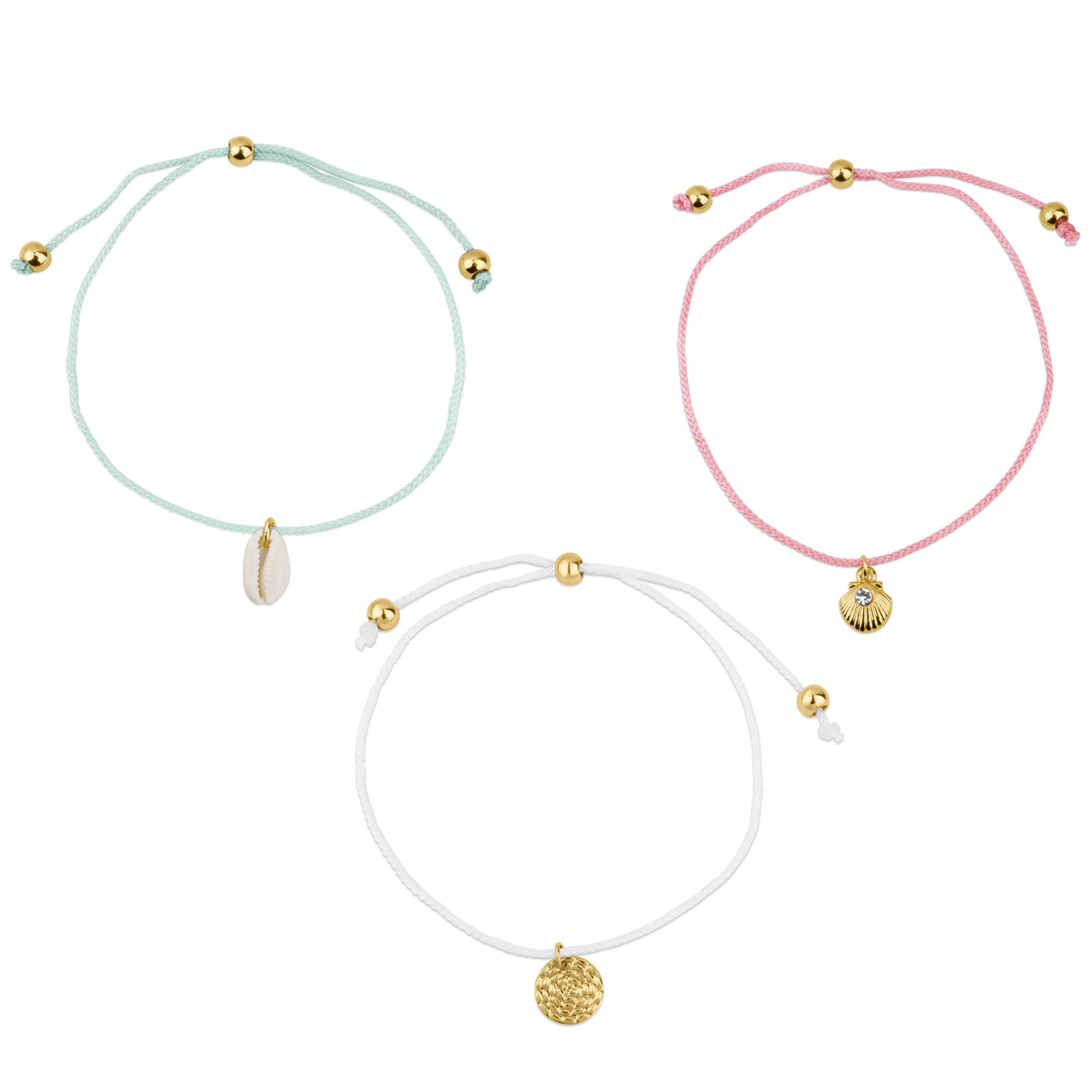 Which way to the beach? Designed with a cord band, each anklet boasts a sweet charm, including shells, sparkles, and discs. Fastens with a drawstring closure.