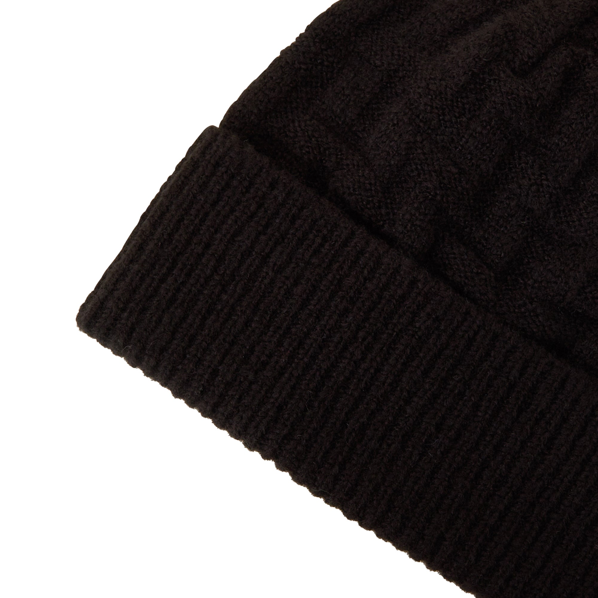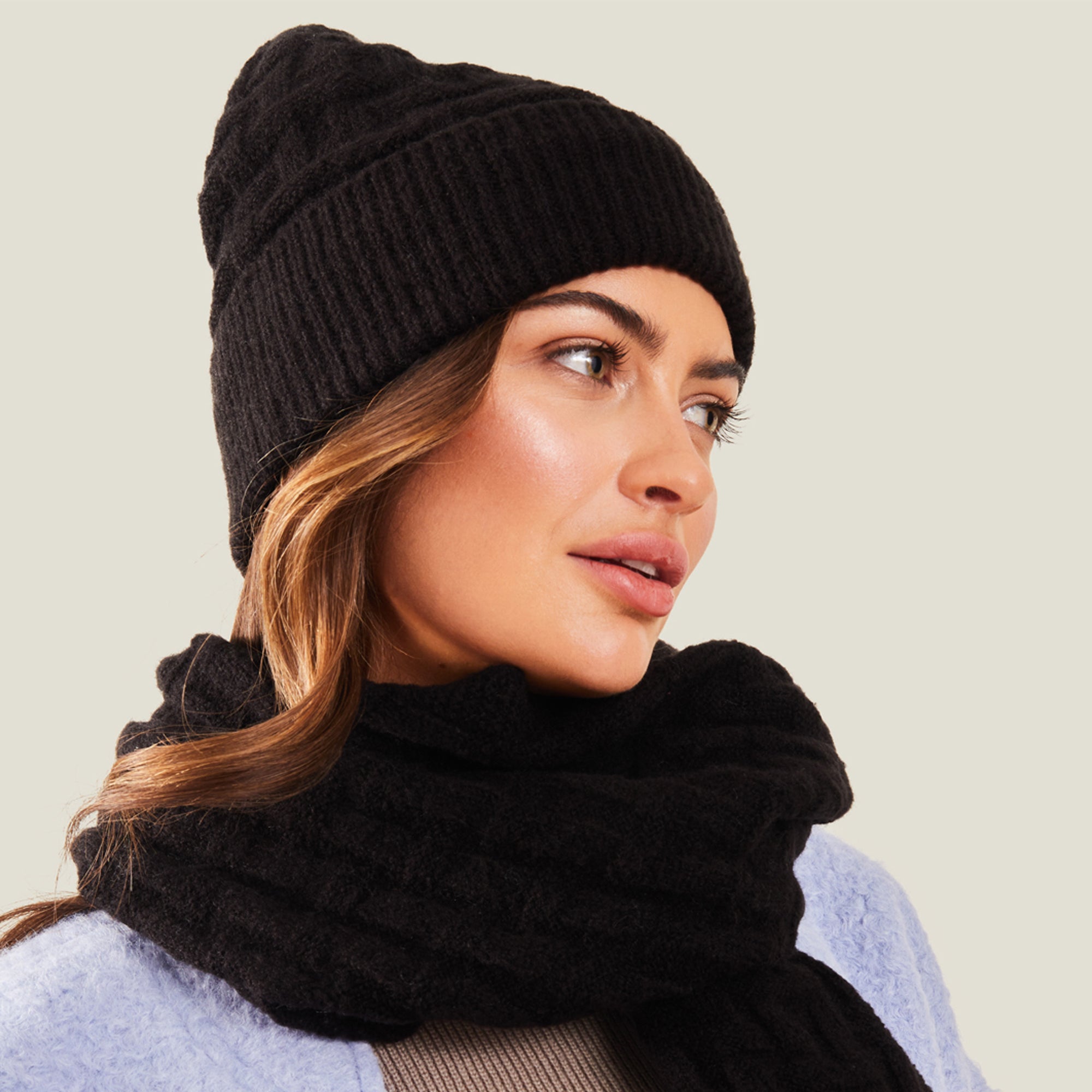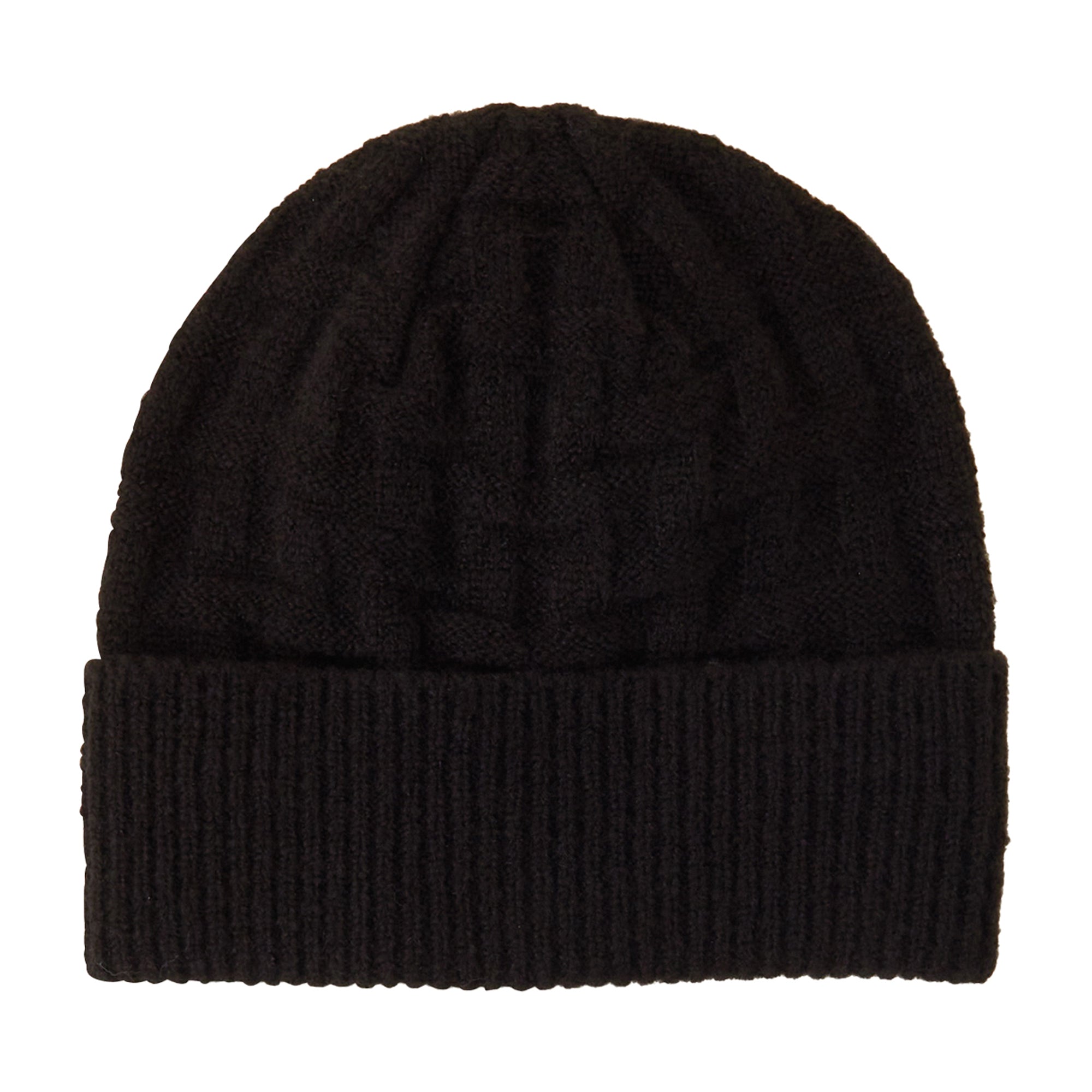 Dodge the winter chill in this beanie, designed in a geometric knit with a fold-up ribbed brim. Matching scarf available. Black