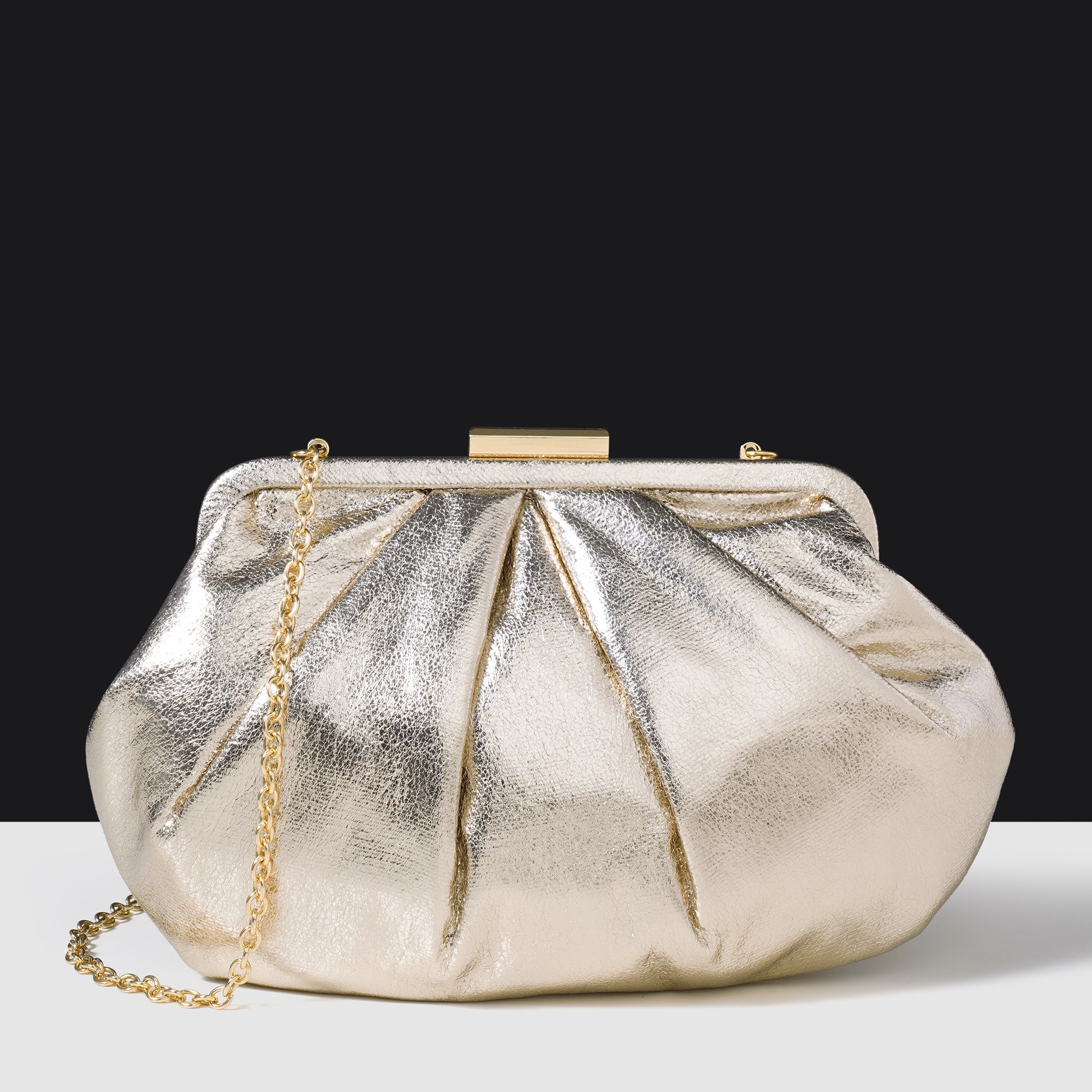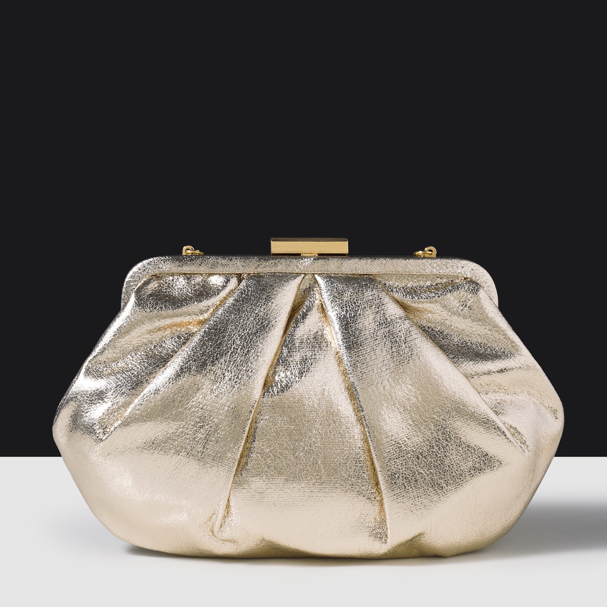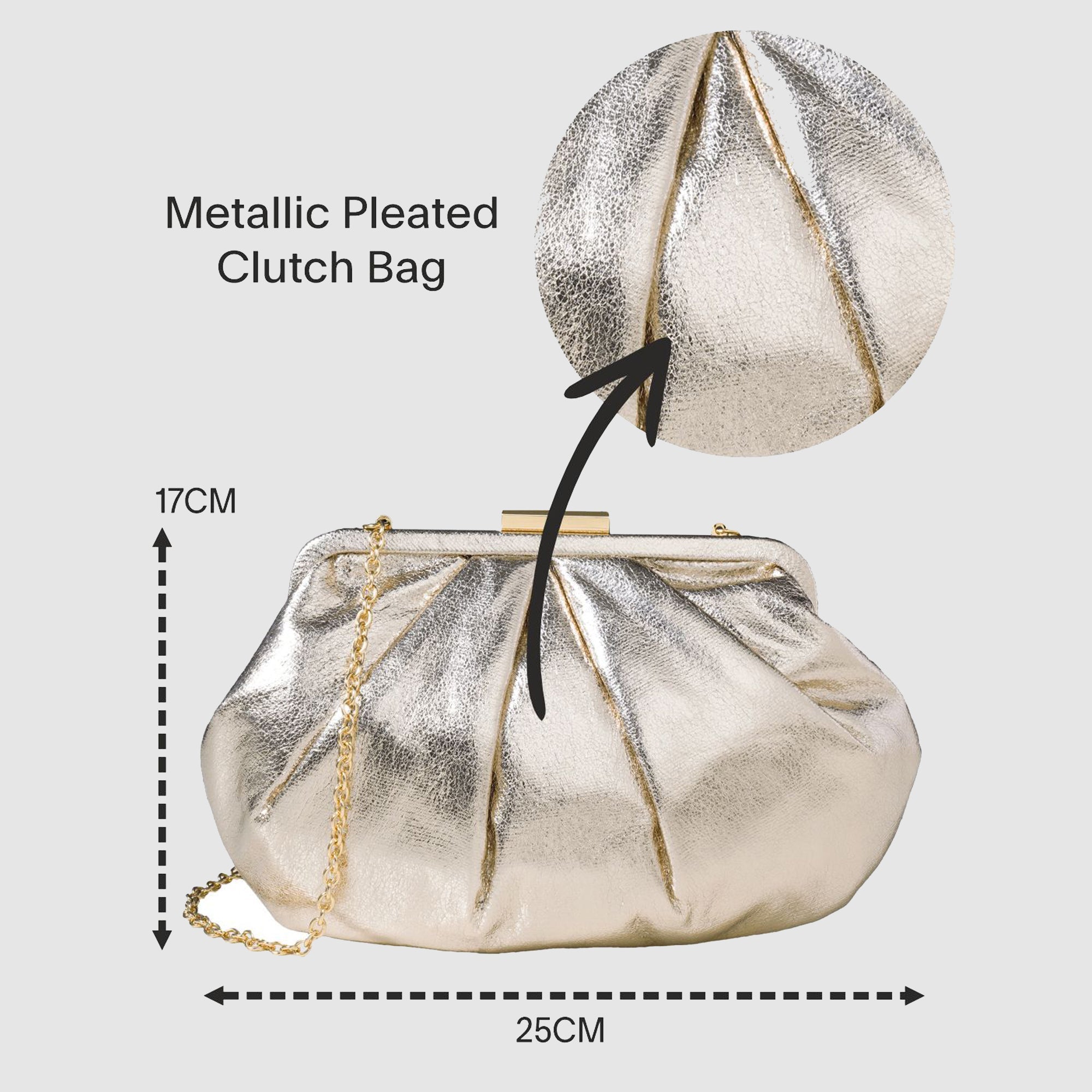 Gilded goodness. Designed with a metallic sheen, this clutch bag boasts a cloud profile with a pleated exterior. Fastens with a clip frame closure and optional chain strap.