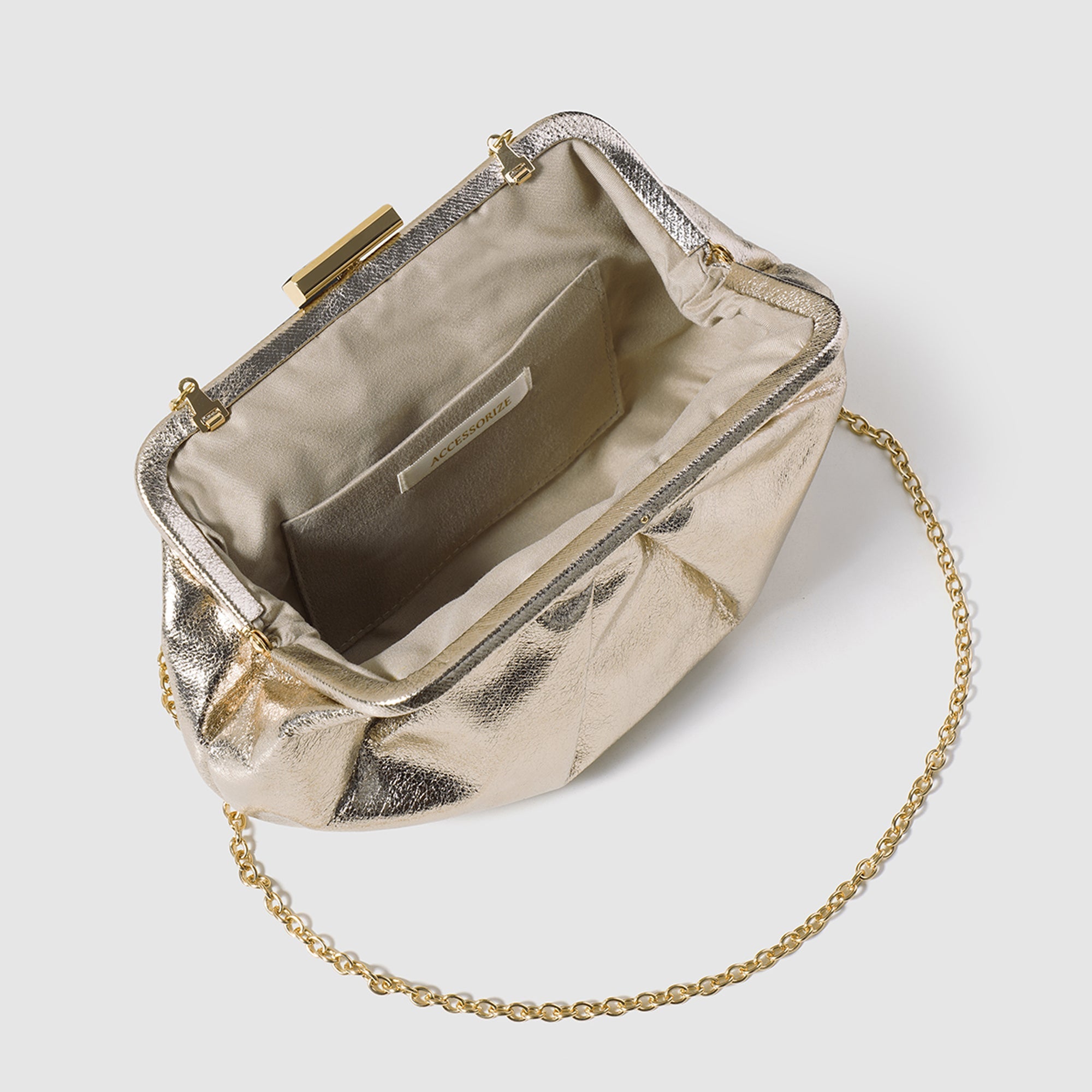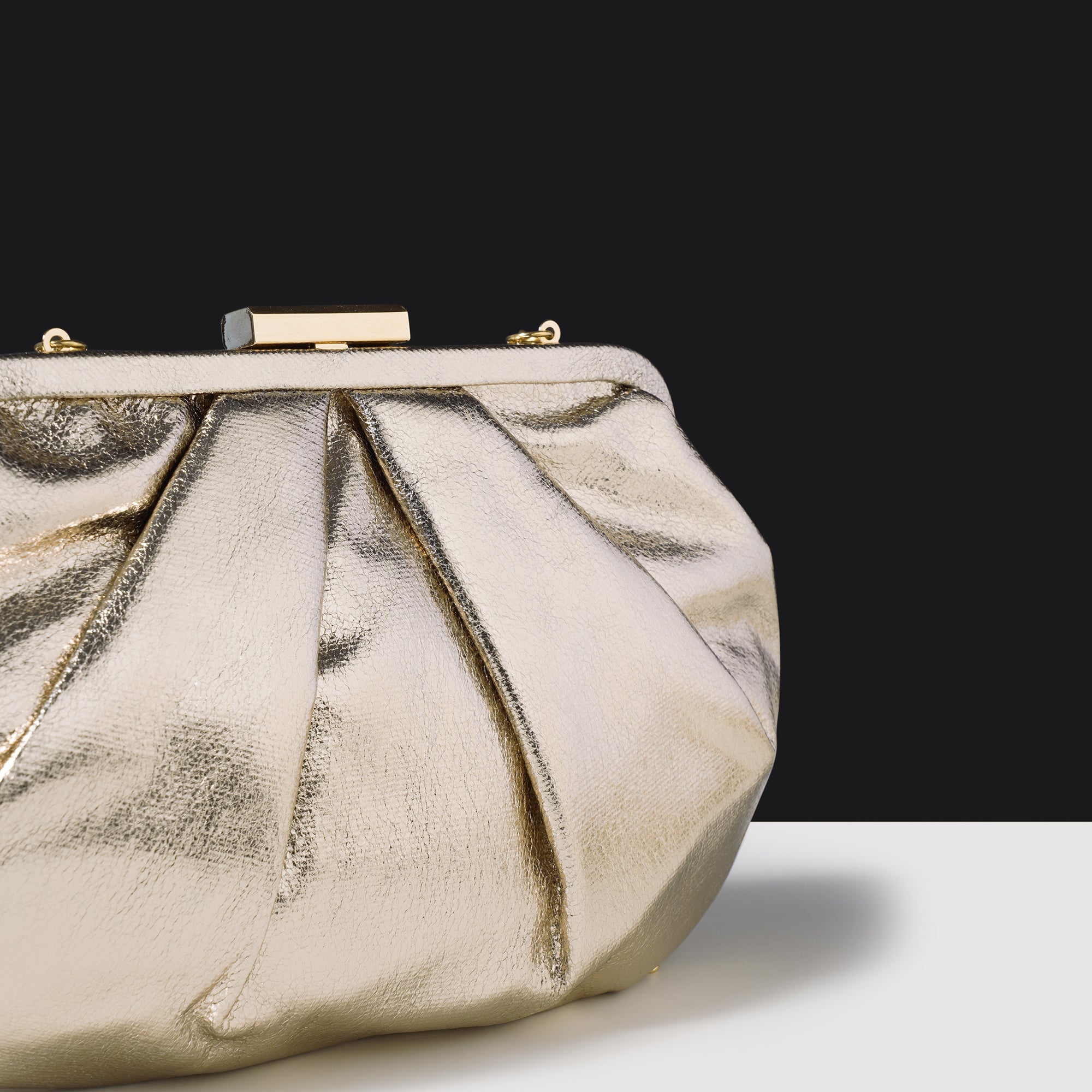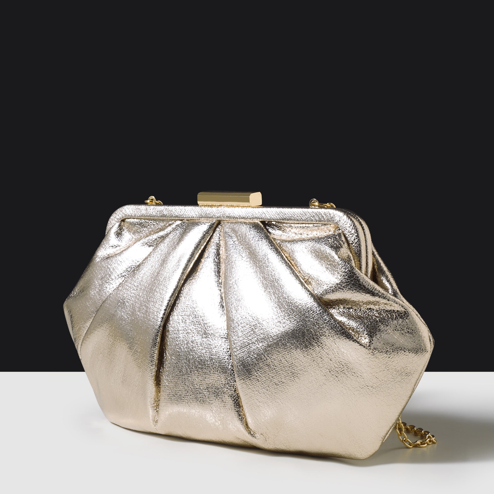 Gilded goodness. Designed with a metallic sheen, this clutch bag boasts a cloud profile with a pleated exterior. Fastens with a clip frame closure and optional chain strap.