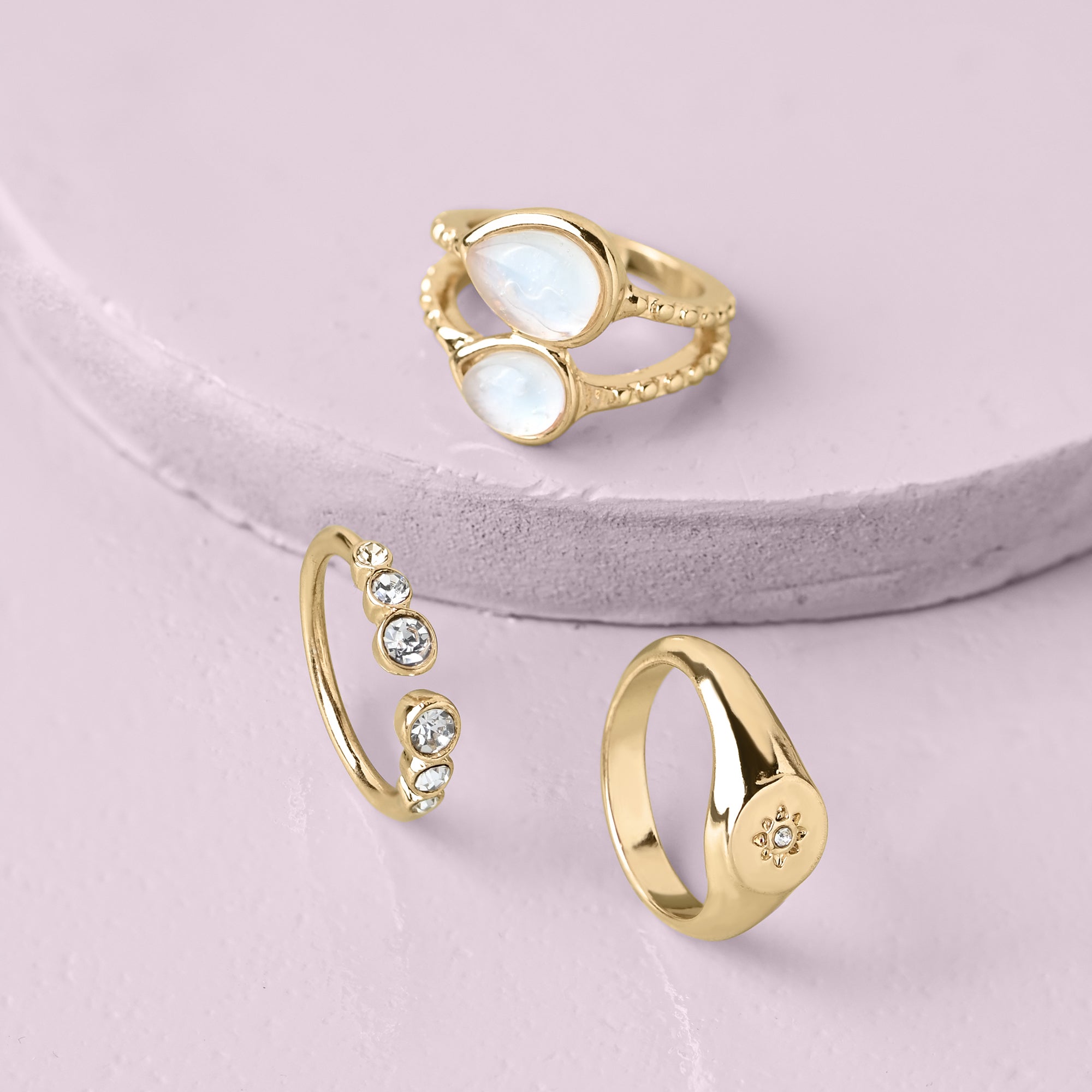 Featuring a signet ring, Mother of Pearl insets, and sparkling diamantes, this ring set is comprised of three individually designed rings that will elevate your stack.
