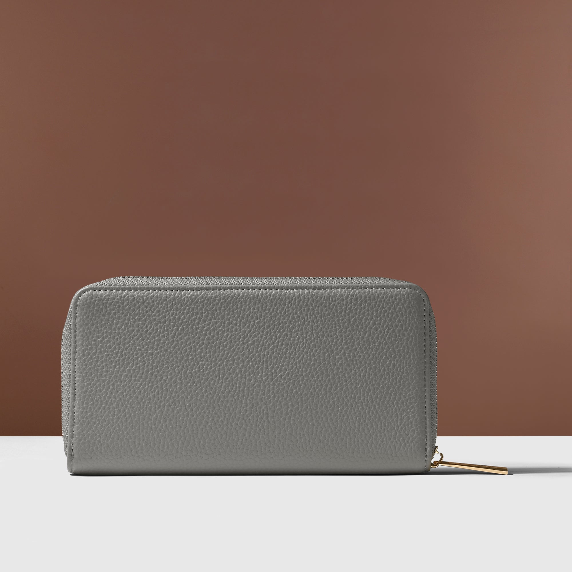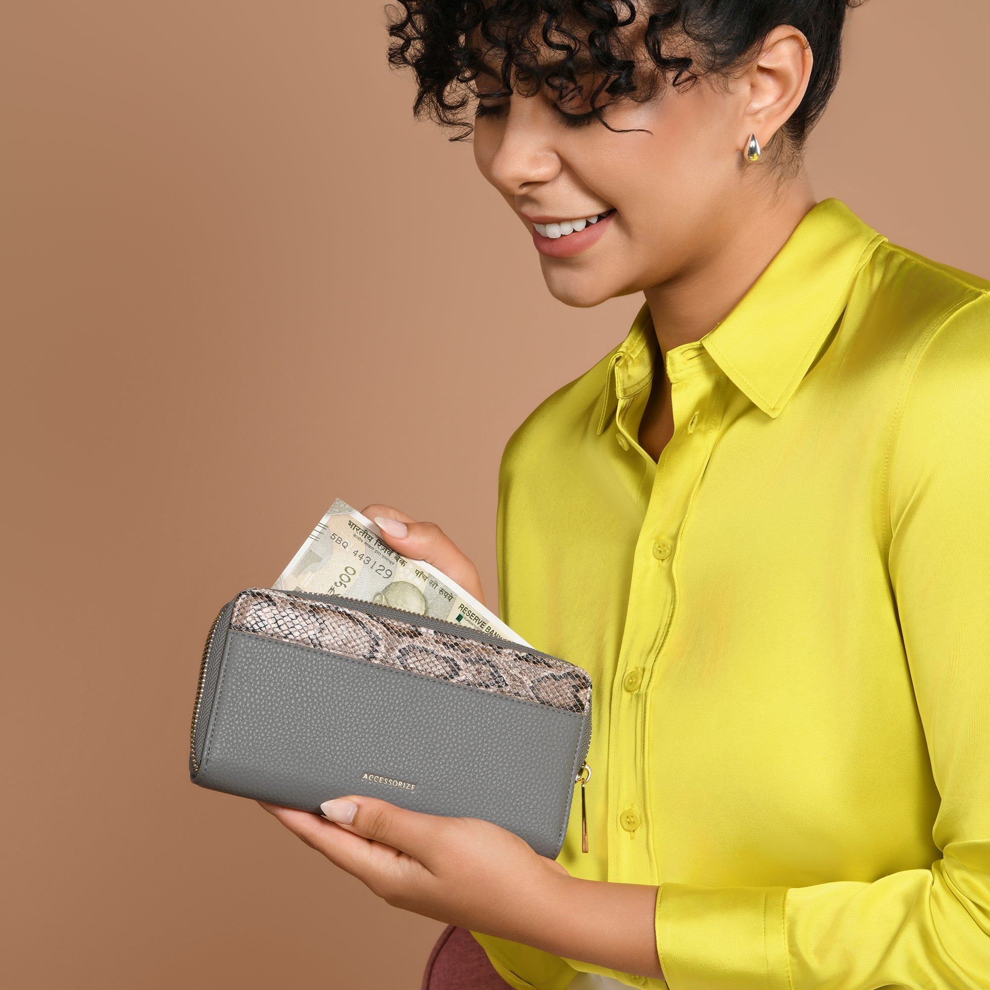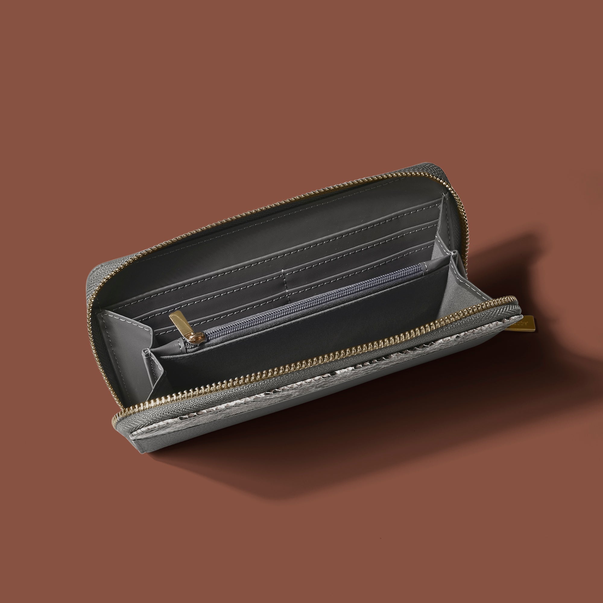 This minimalist zip-around wallet combines practicality with style, featuring subtle snake print details for a touch of exotic flair. With its sleek solid color exterior, it adds effortless sophistication to your essentials, wherever you go