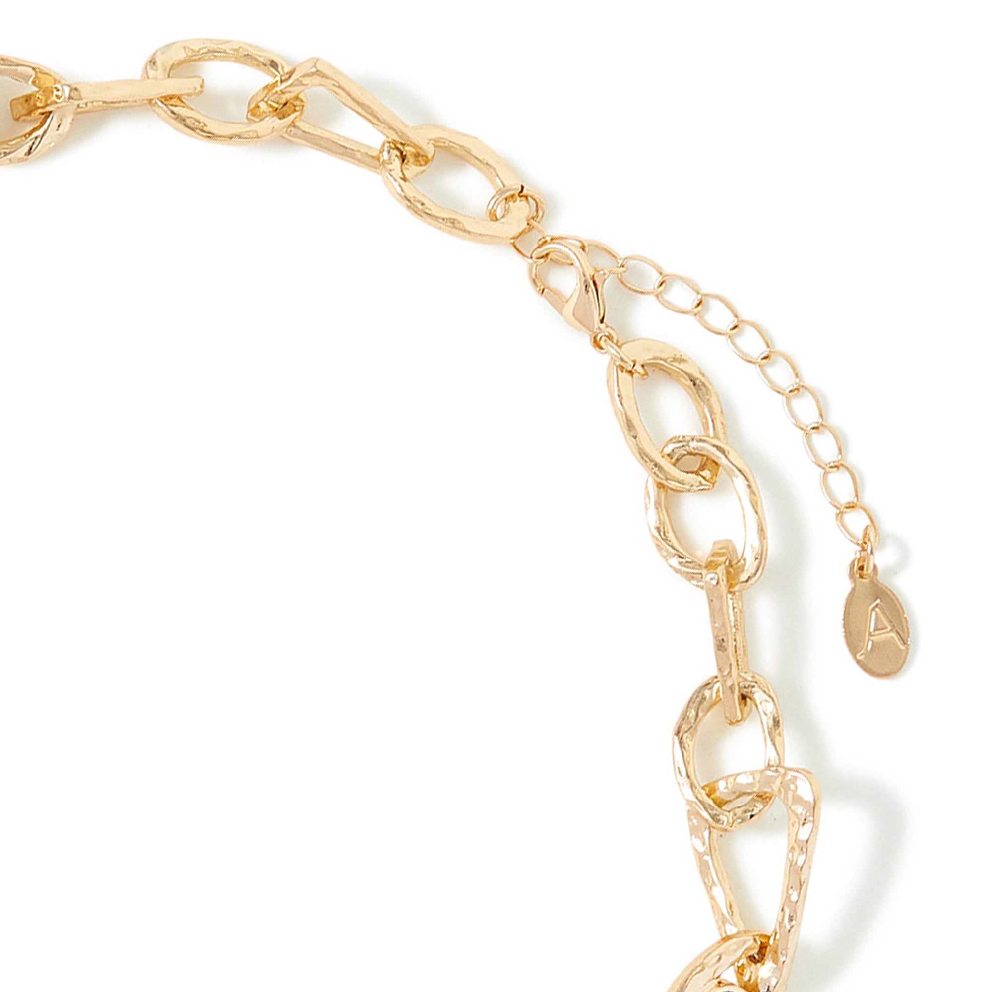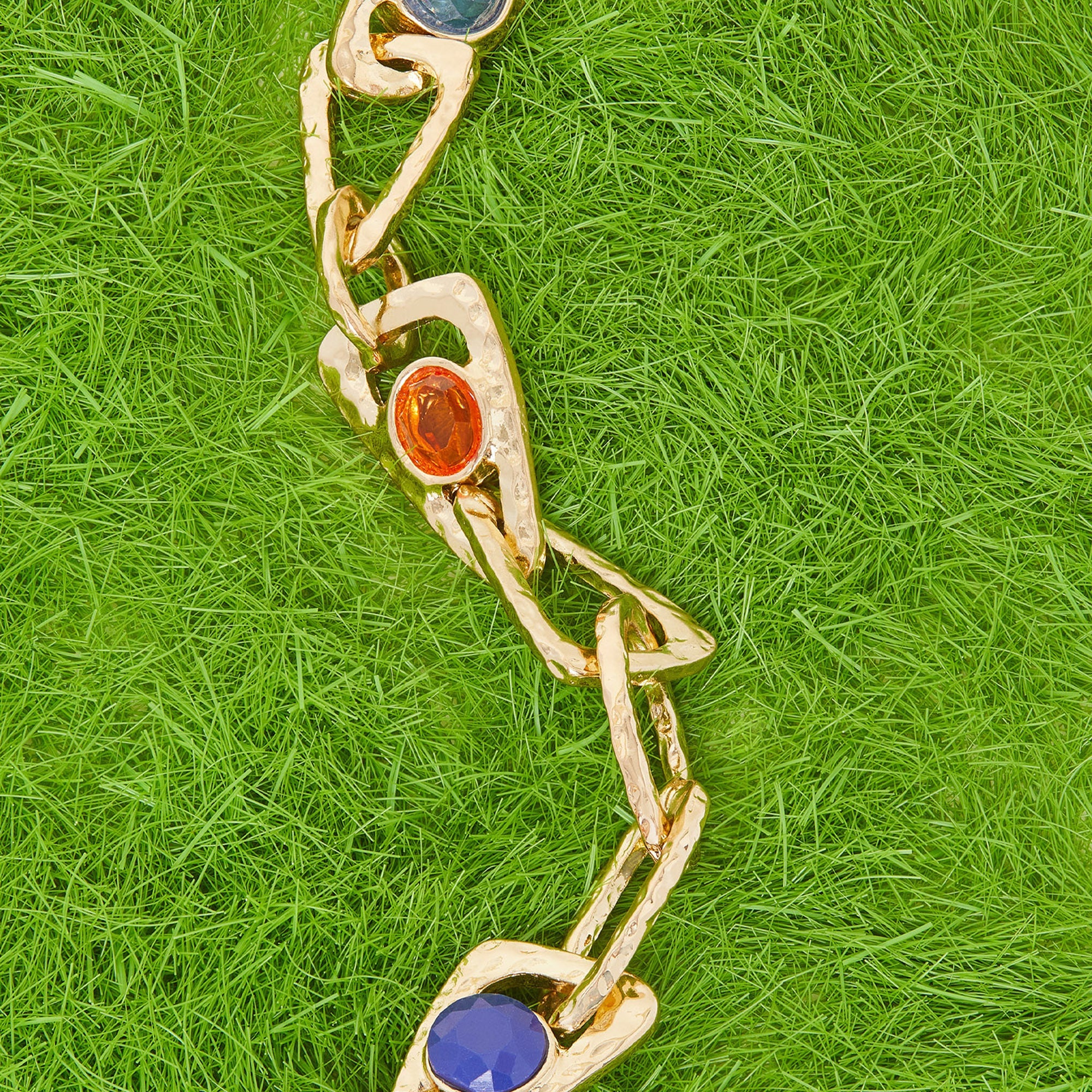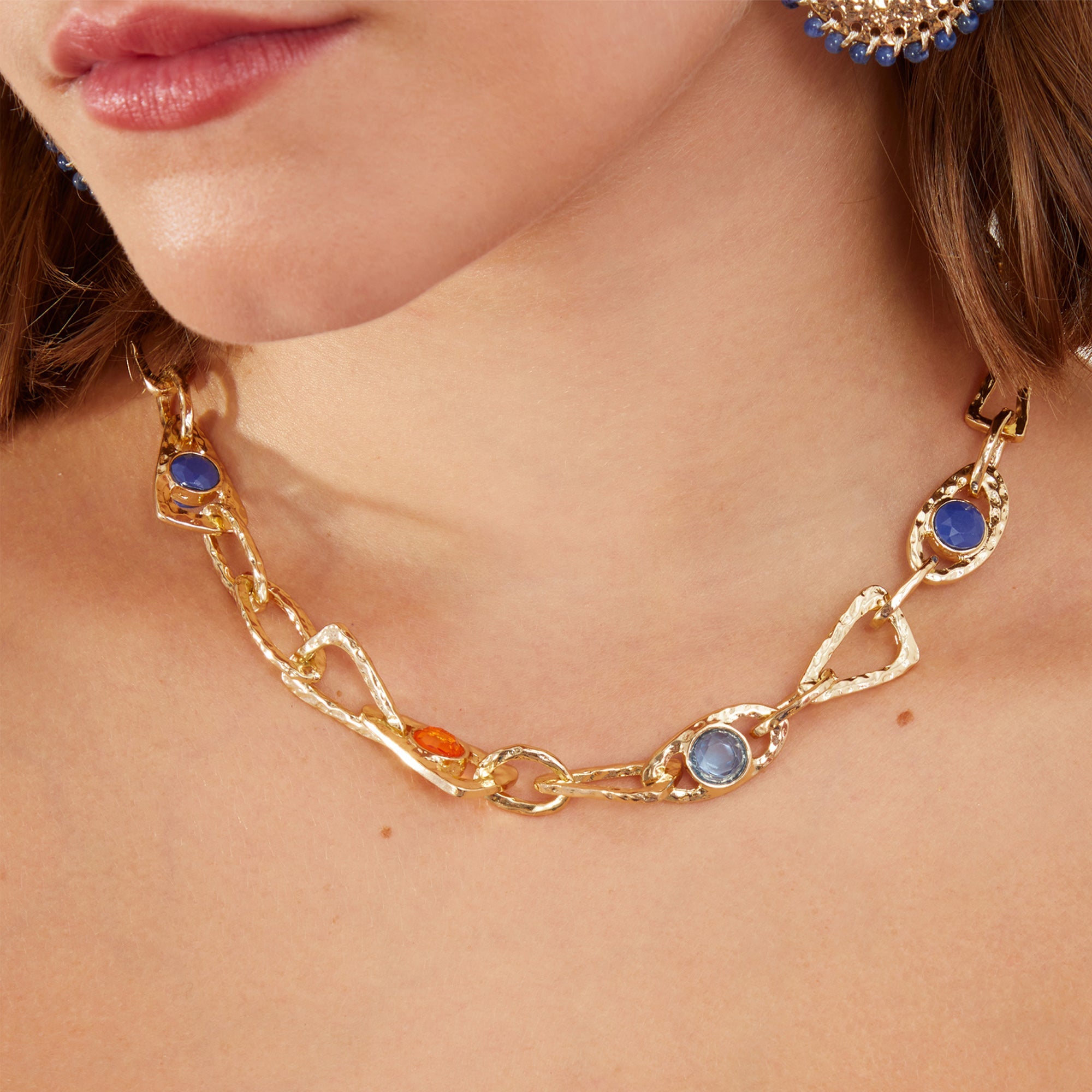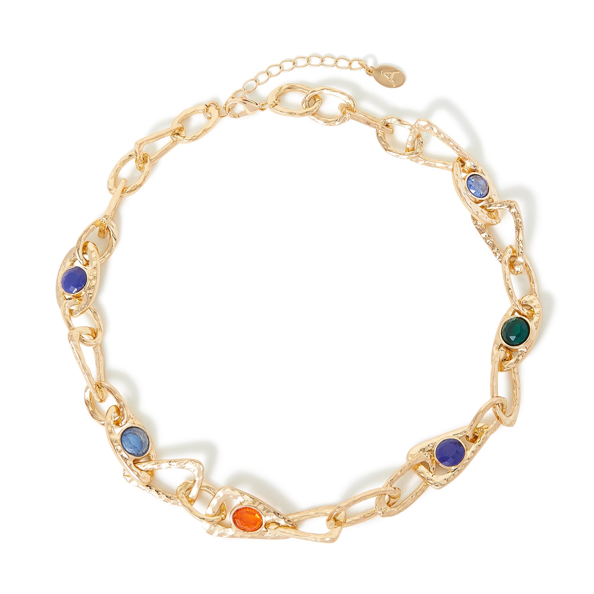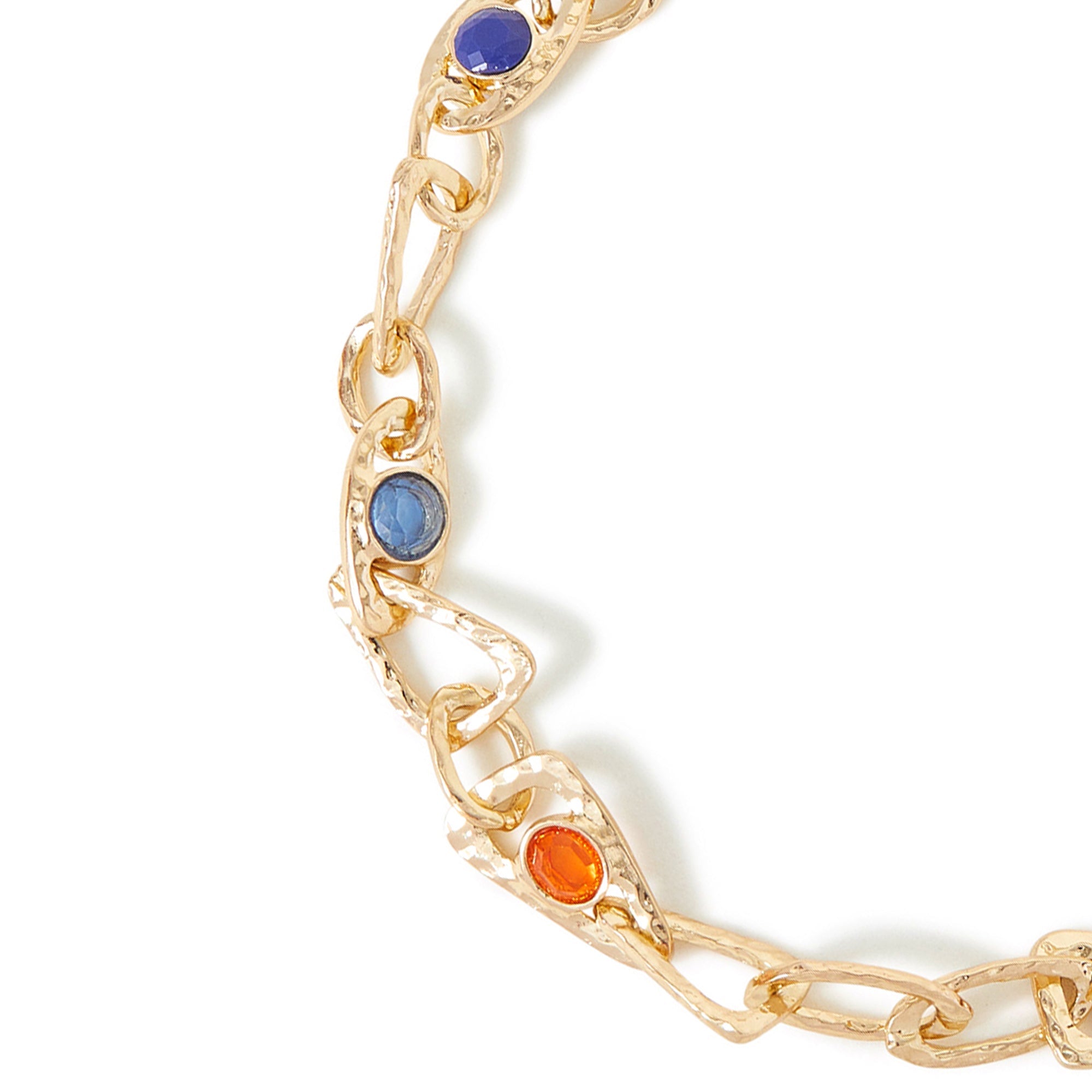 After something detailed? This is for you. Designed in gold-tone hammered metal, this necklace displays gemstone embellishments for a pop of colour with a looped chain. Matching earrings available.