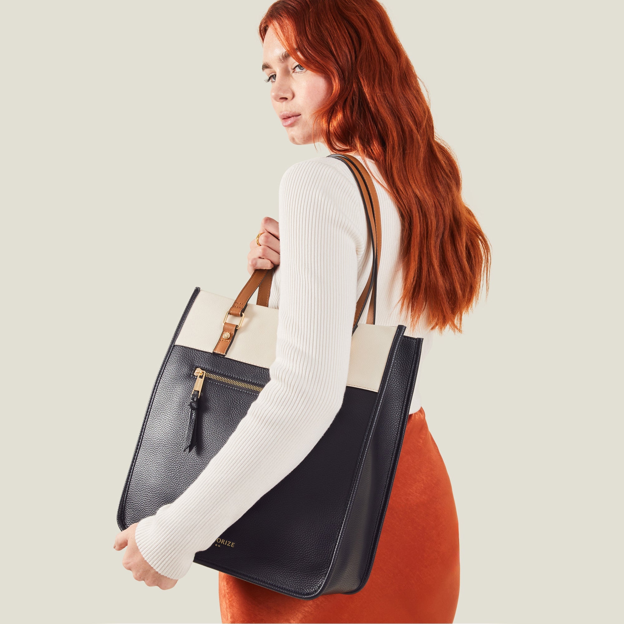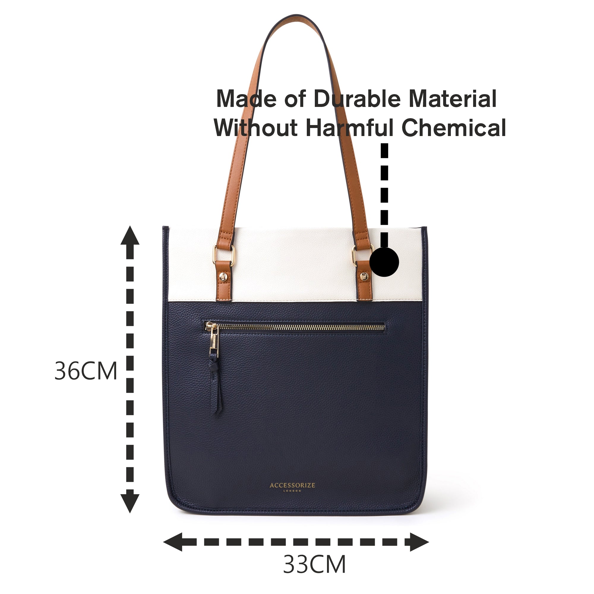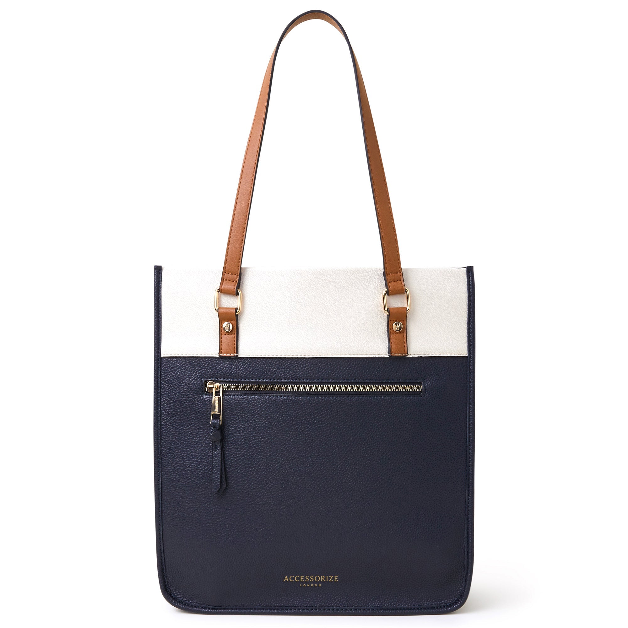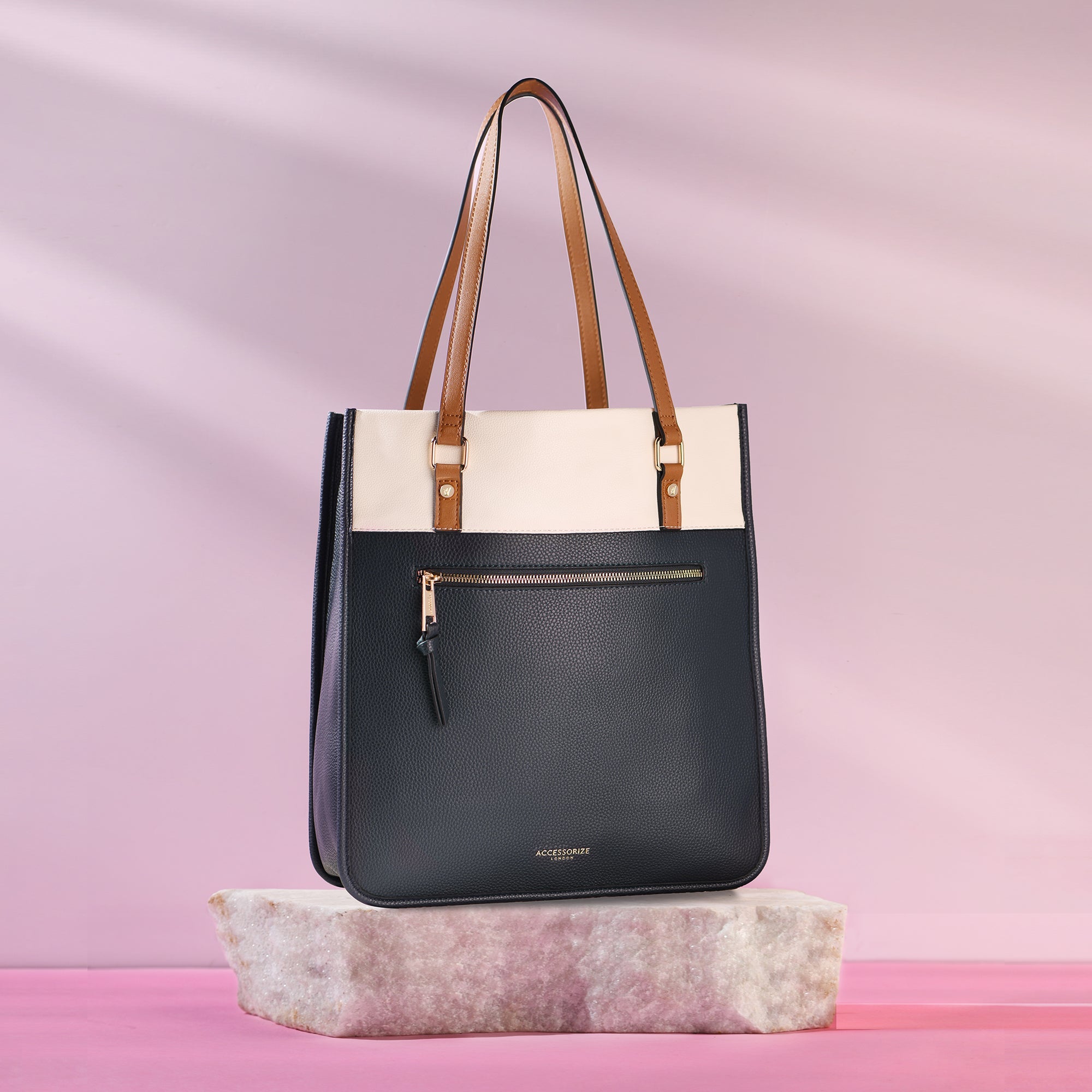 Diary, water bottle, purse, check! Designed in faux leather, this colour block bag features a zip compartment to the centre and exterior, housing all your valuables for long days in the office. Finished with shoulder straps for easy carrying.