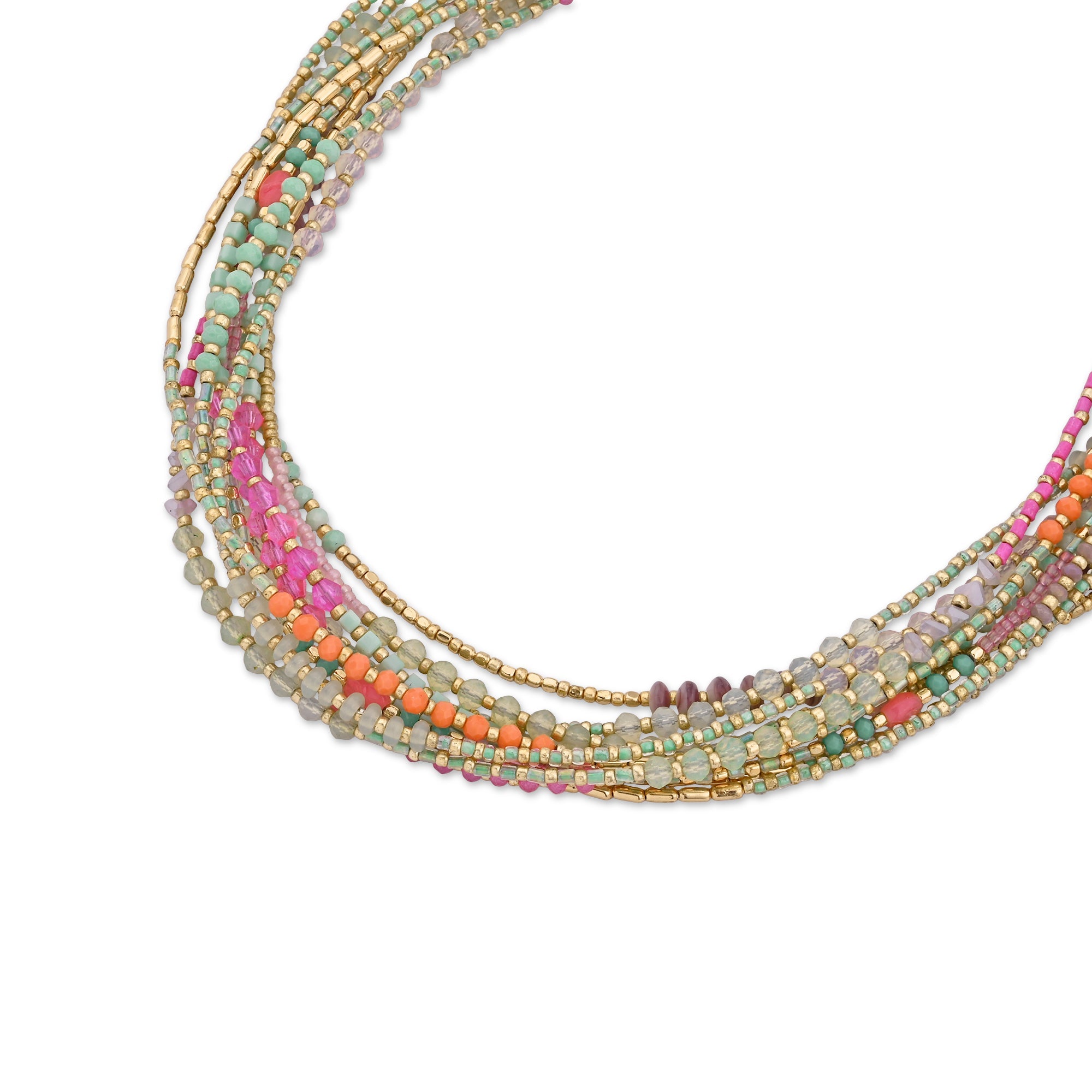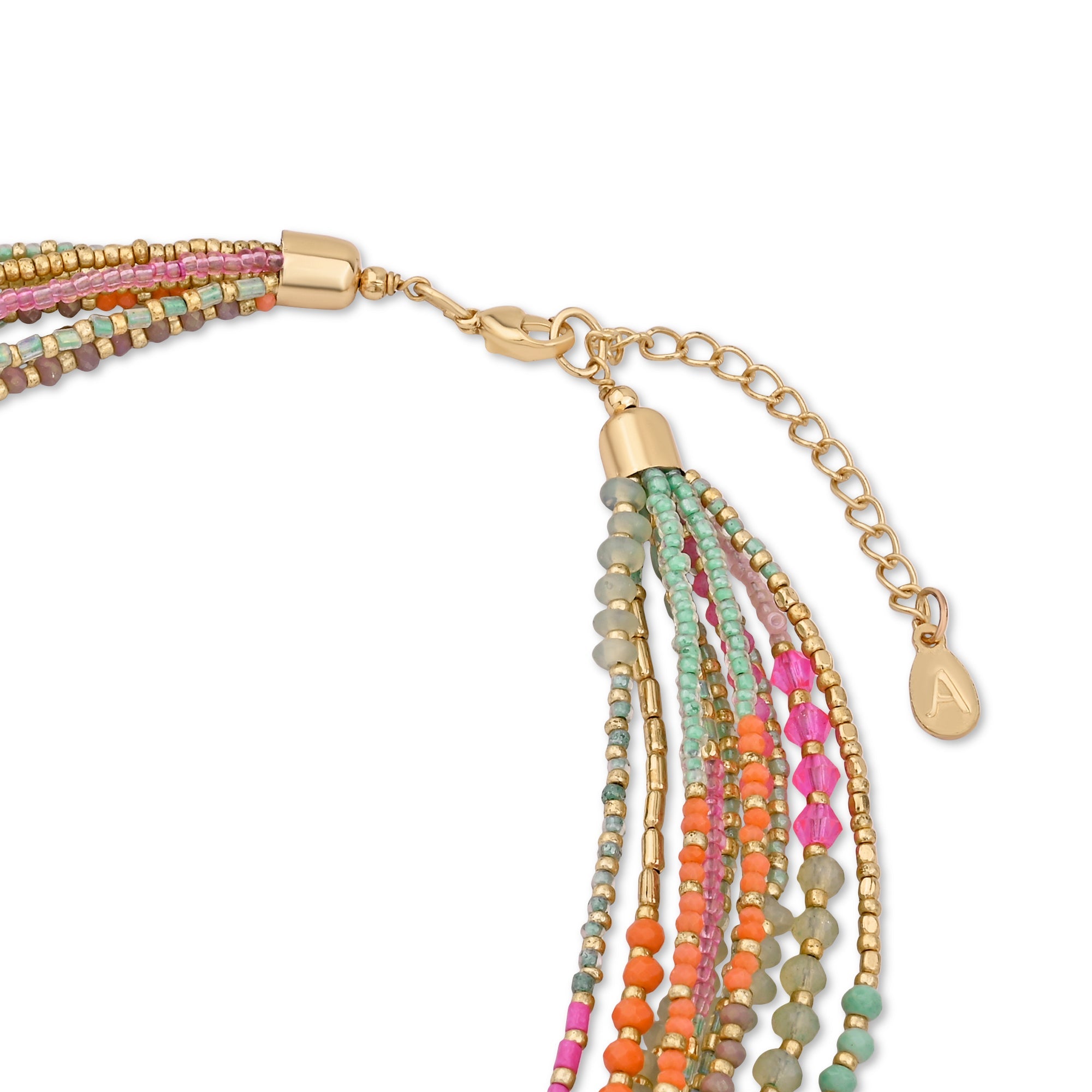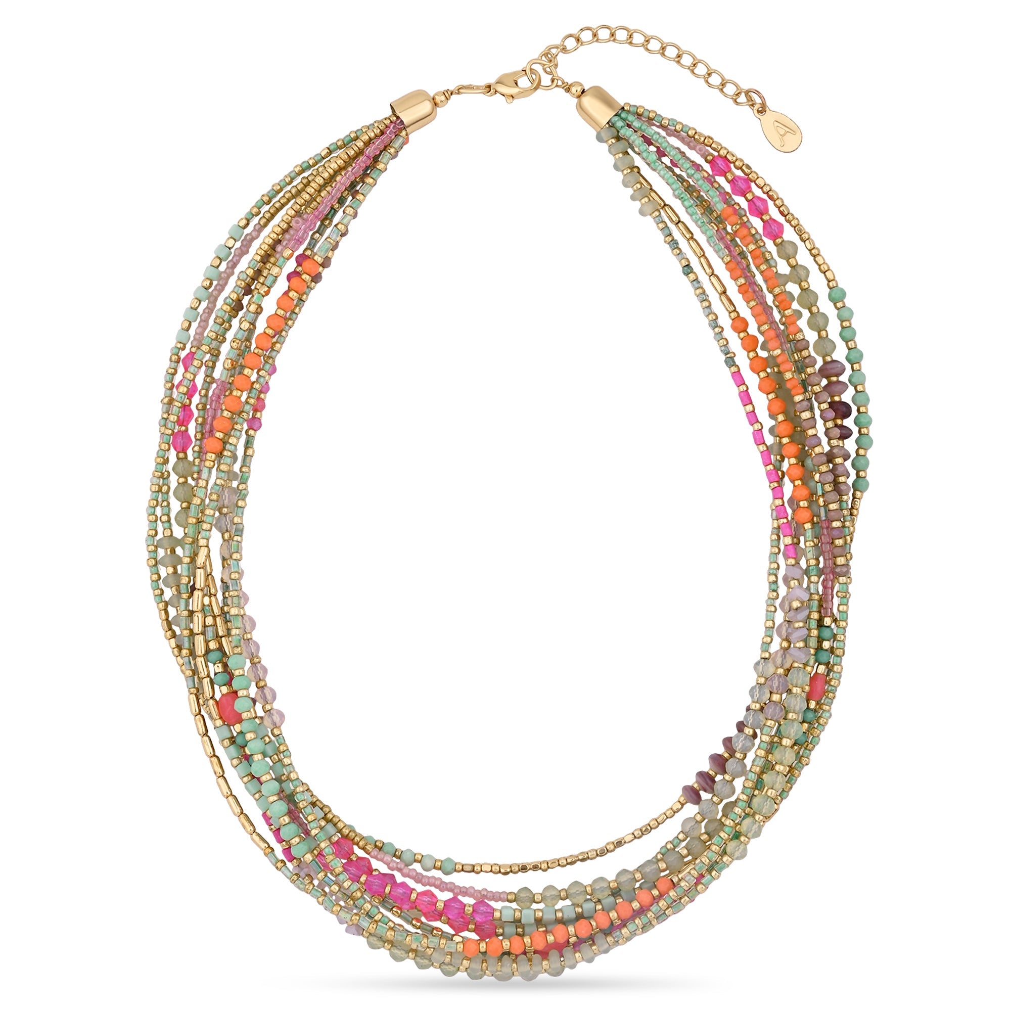 We love layers. Threaded with a collection of pinks, greens, and golds, this beaded necklace is designed in a short, collar profile for a splash of colour. Fastens with a lobster clasp and extender.
