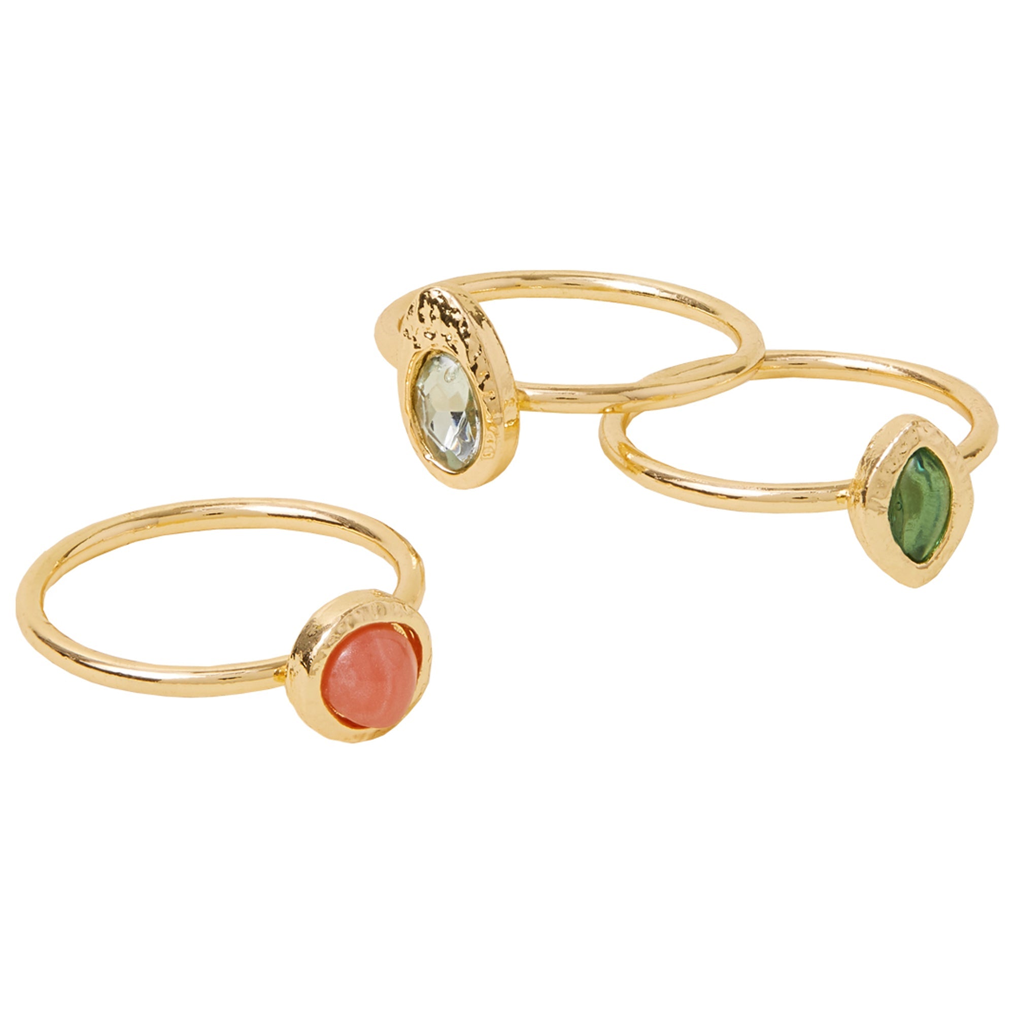 Leave the stacking to this set, designed in gold-tone metal. Each piece features a teeny tiny gem detailing, from gorgeous greens to simple diamantés.