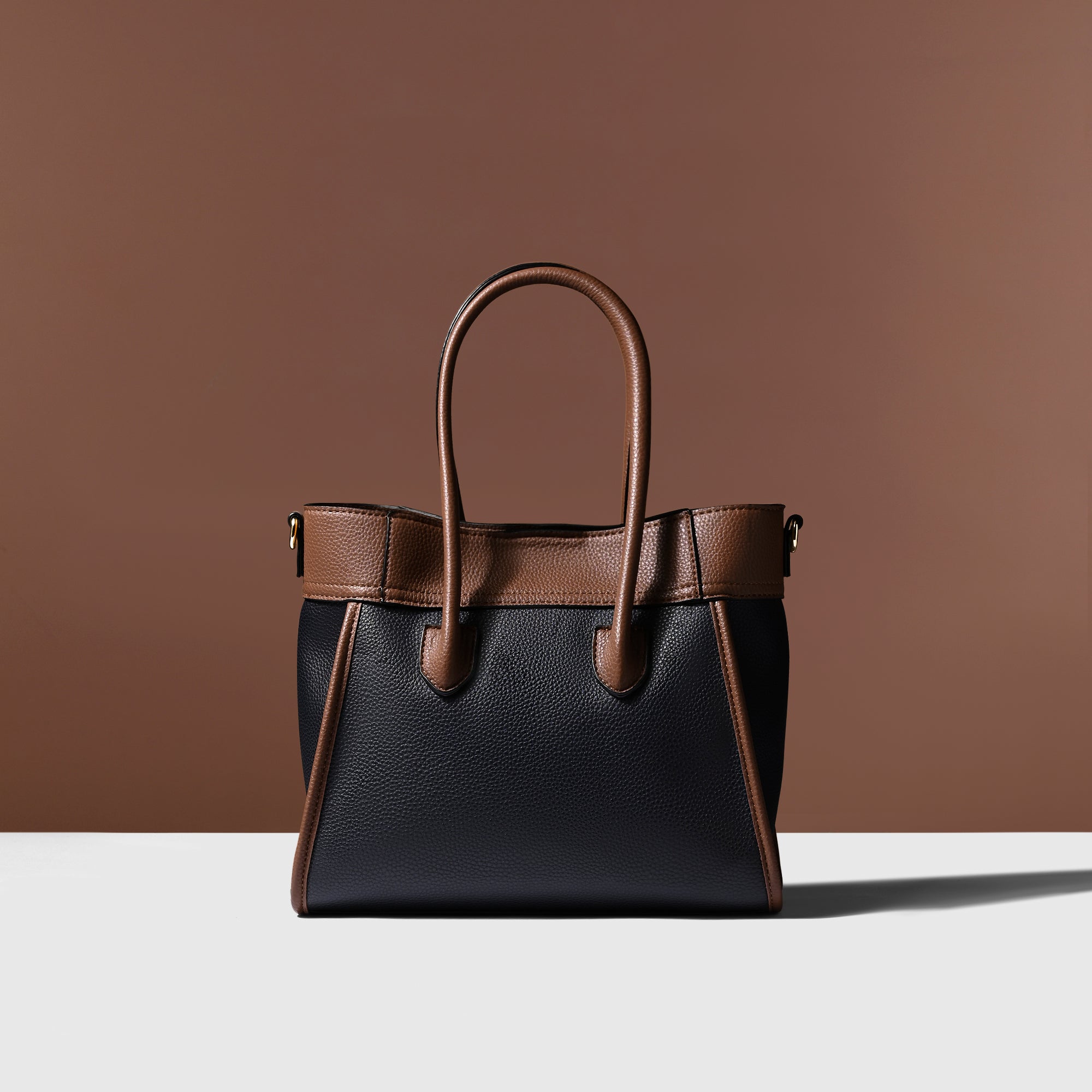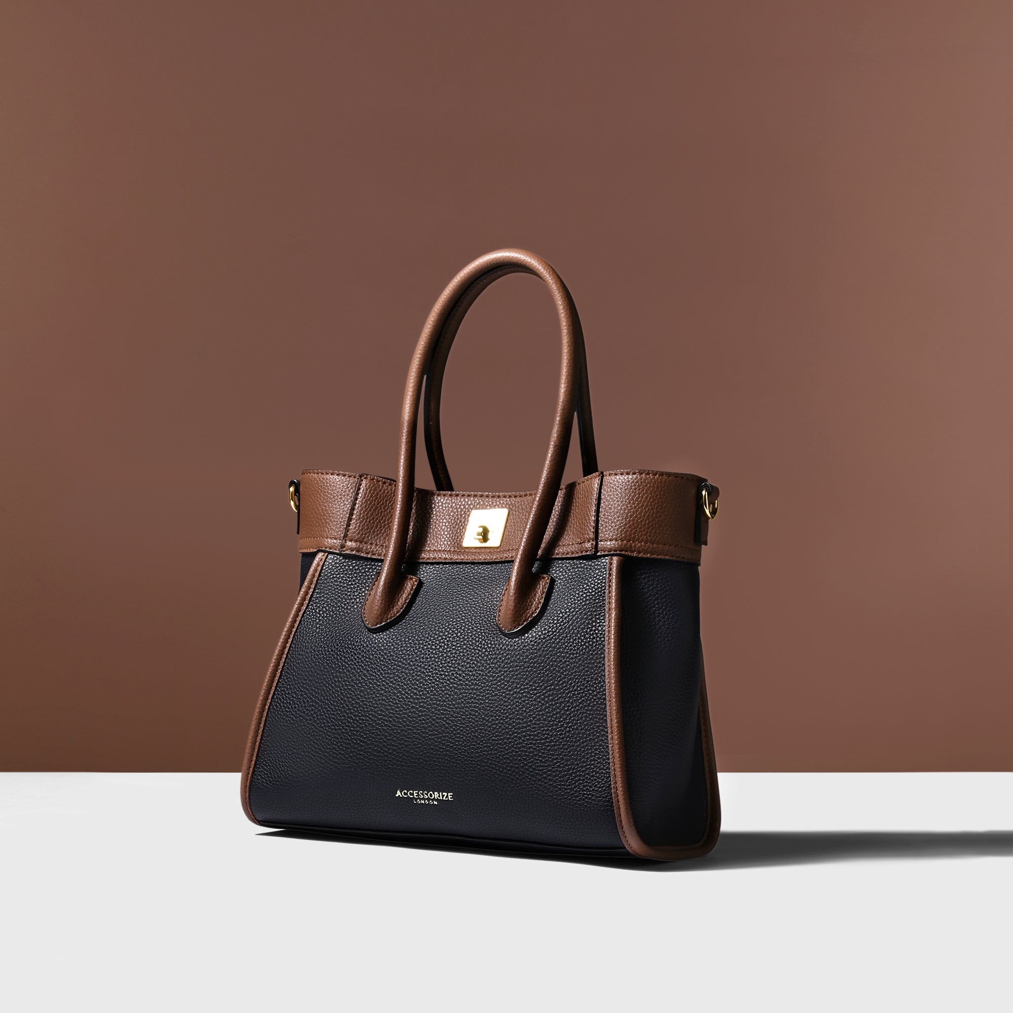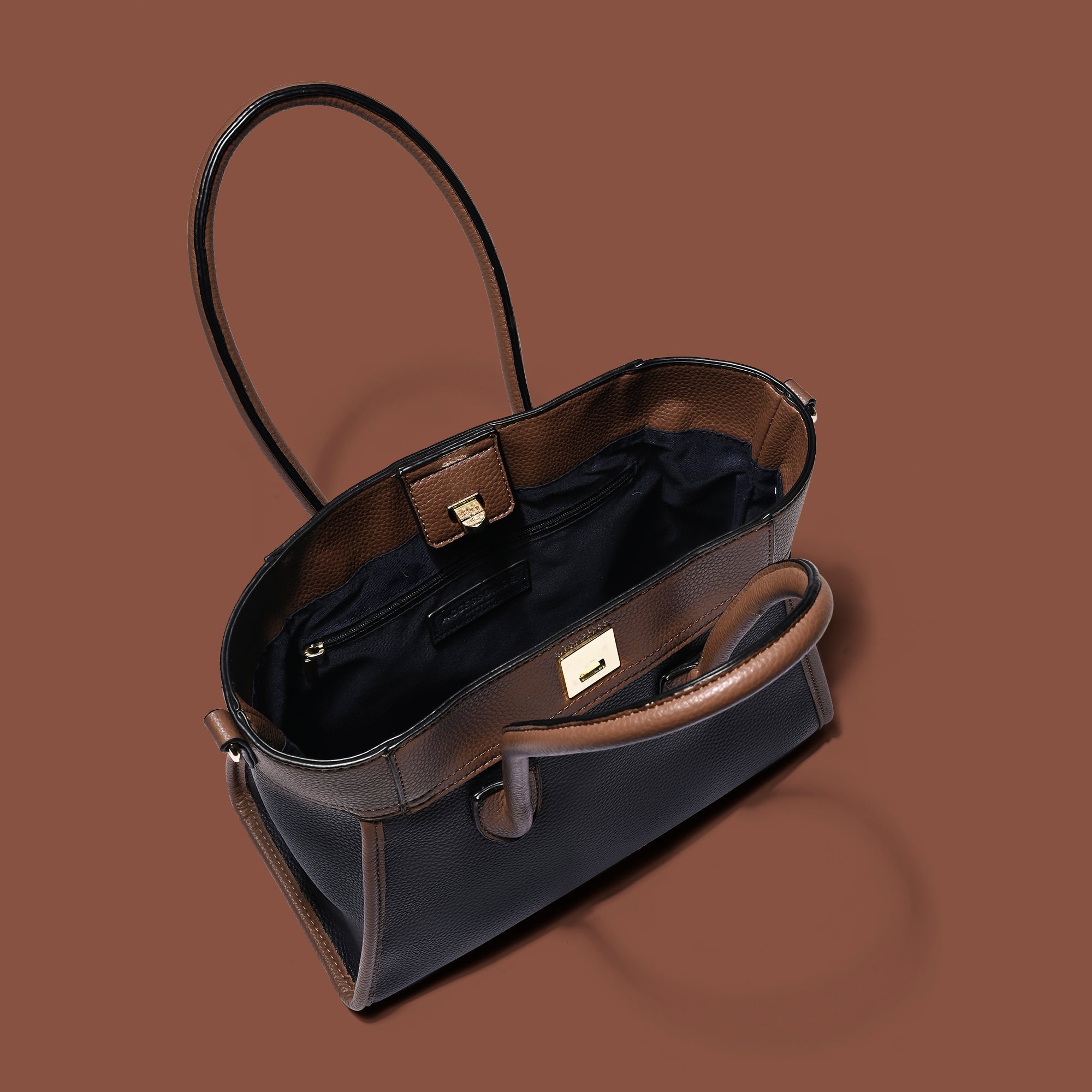 Add a touch of sophistication to your ensemble with this top-handle handbag featuring a chic dual-tone design and a classic twist lock closure. Versatile and stylish, it comes with a detachable long strap for added convenience, making it the perfect accessory for any occasion.