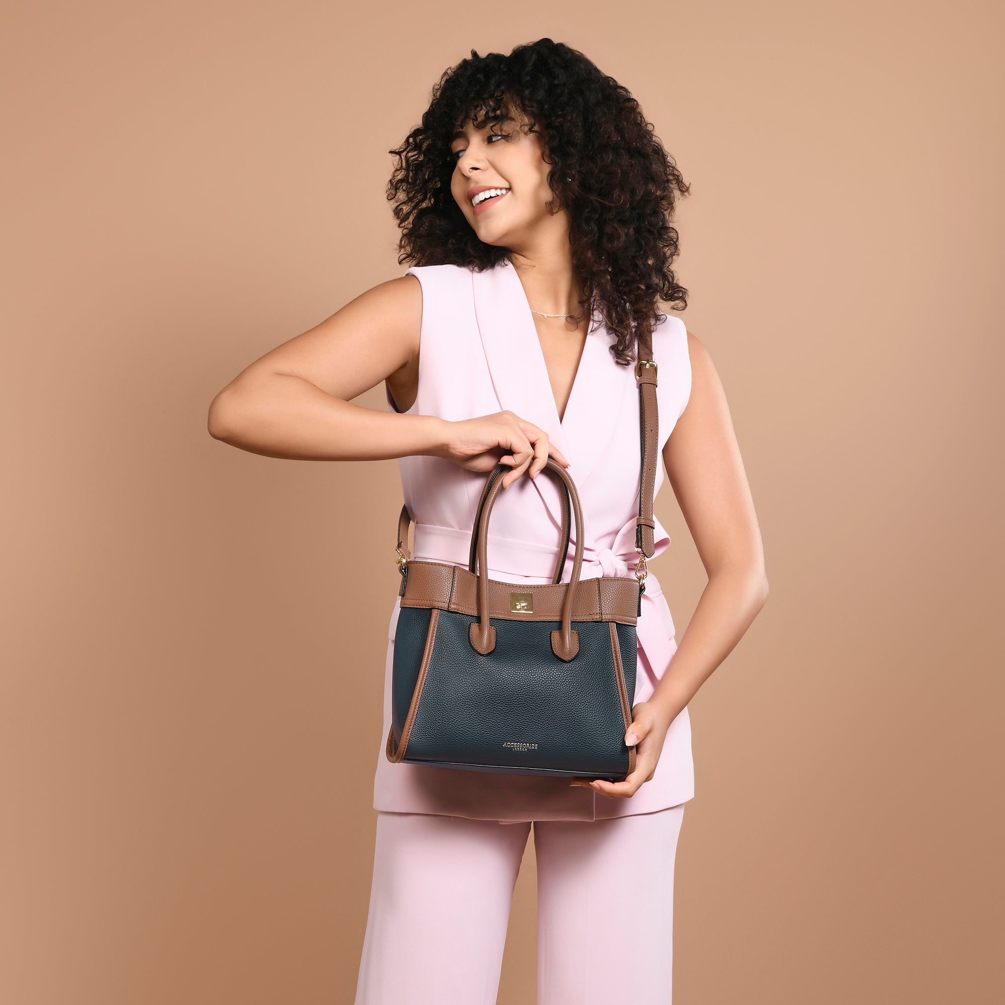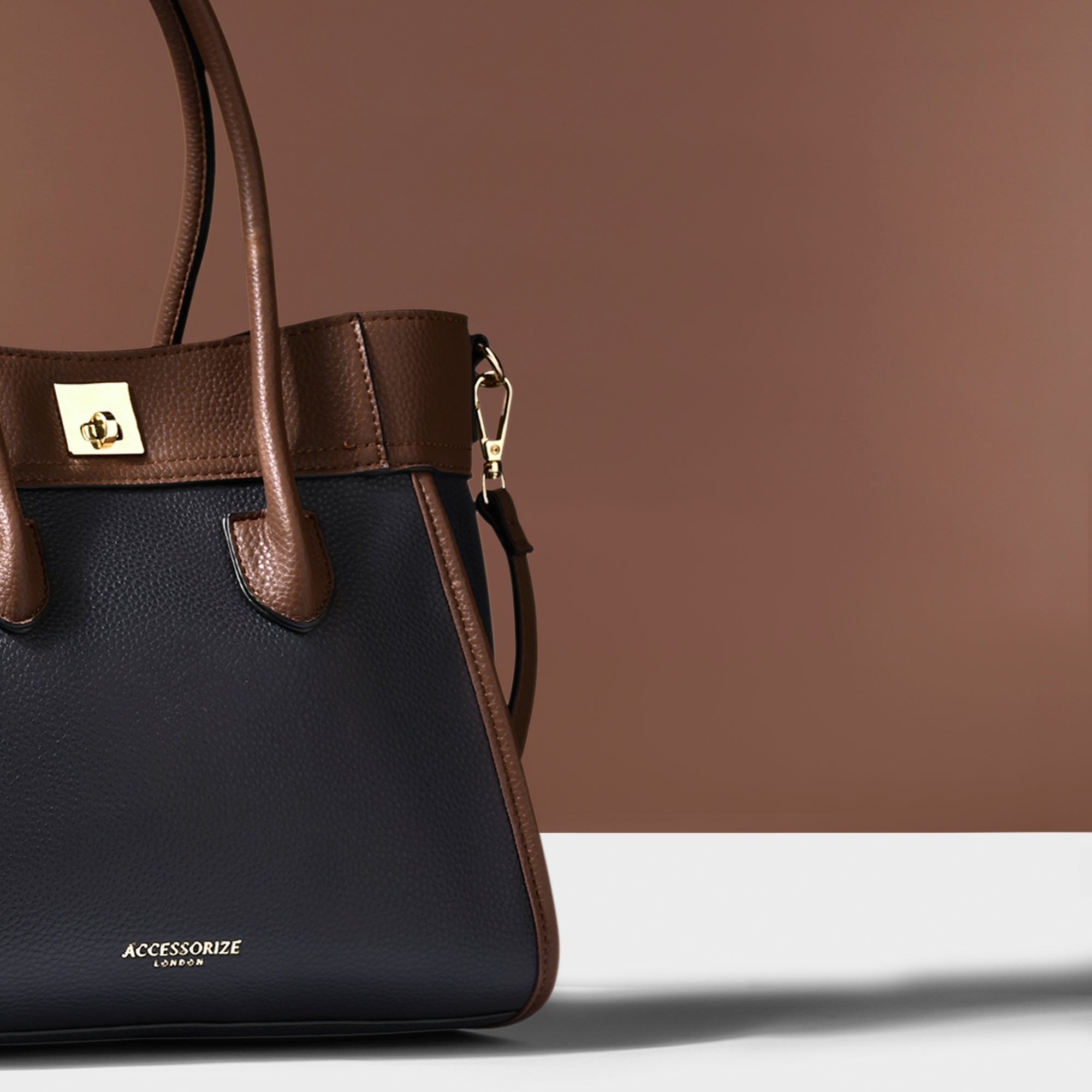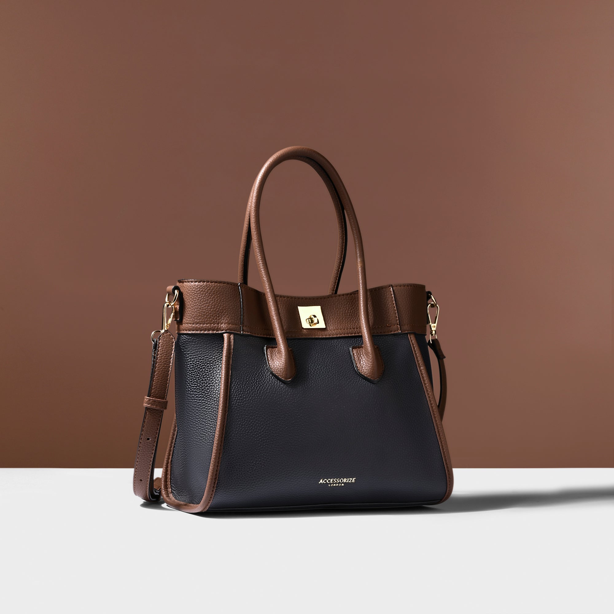 Add a touch of sophistication to your ensemble with this top-handle handbag featuring a chic dual-tone design and a classic twist lock closure. Versatile and stylish, it comes with a detachable long strap for added convenience, making it the perfect accessory for any occasion.