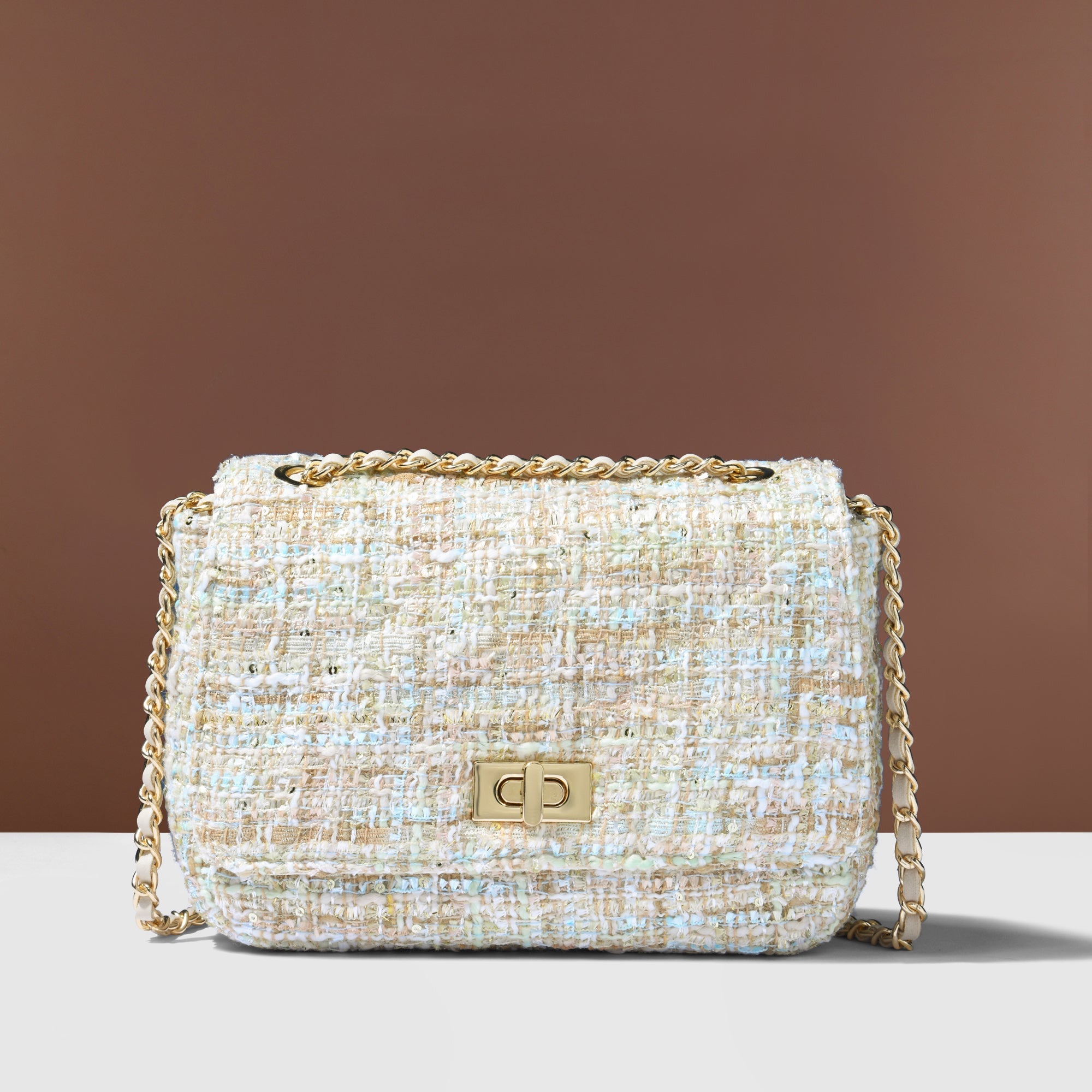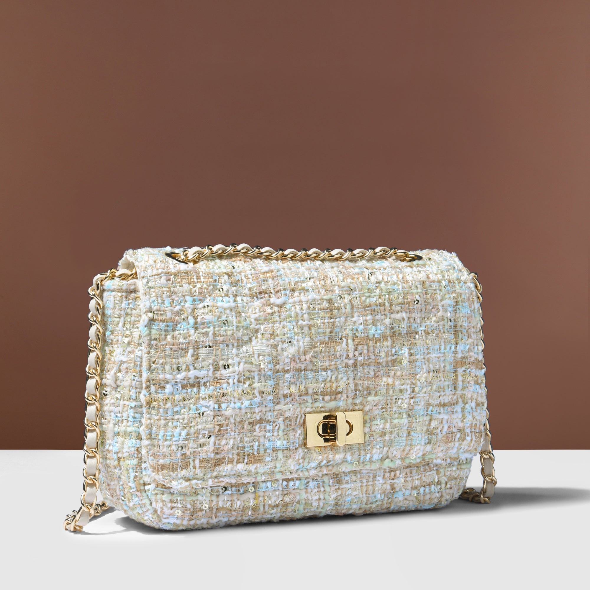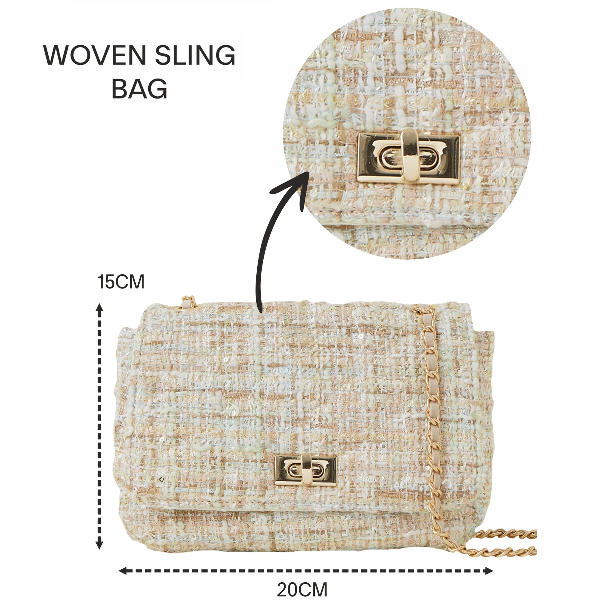 Say hey to your new favourite bag. This delightful cross-body bag is crafted from a multi-coloured woven bouclé featuring metallic threading. Flip open the secured front flap to reveal a lined interior with zipped compartment, and close it again with the twist-lock fastening! The smart metal chain and faux leather shoulder strap adds a chic touch for easy carrying.
