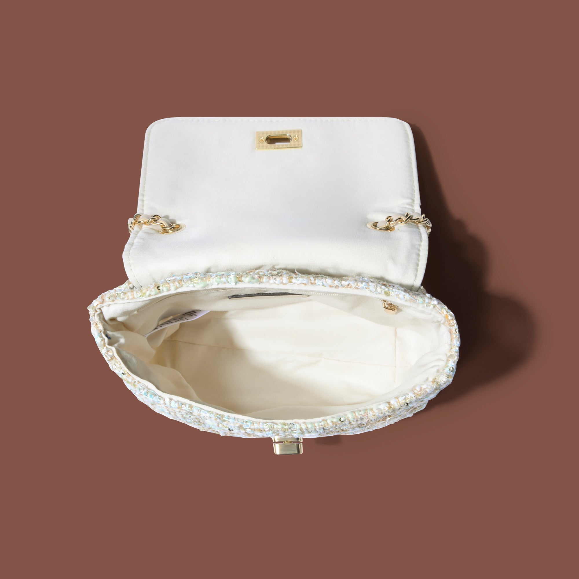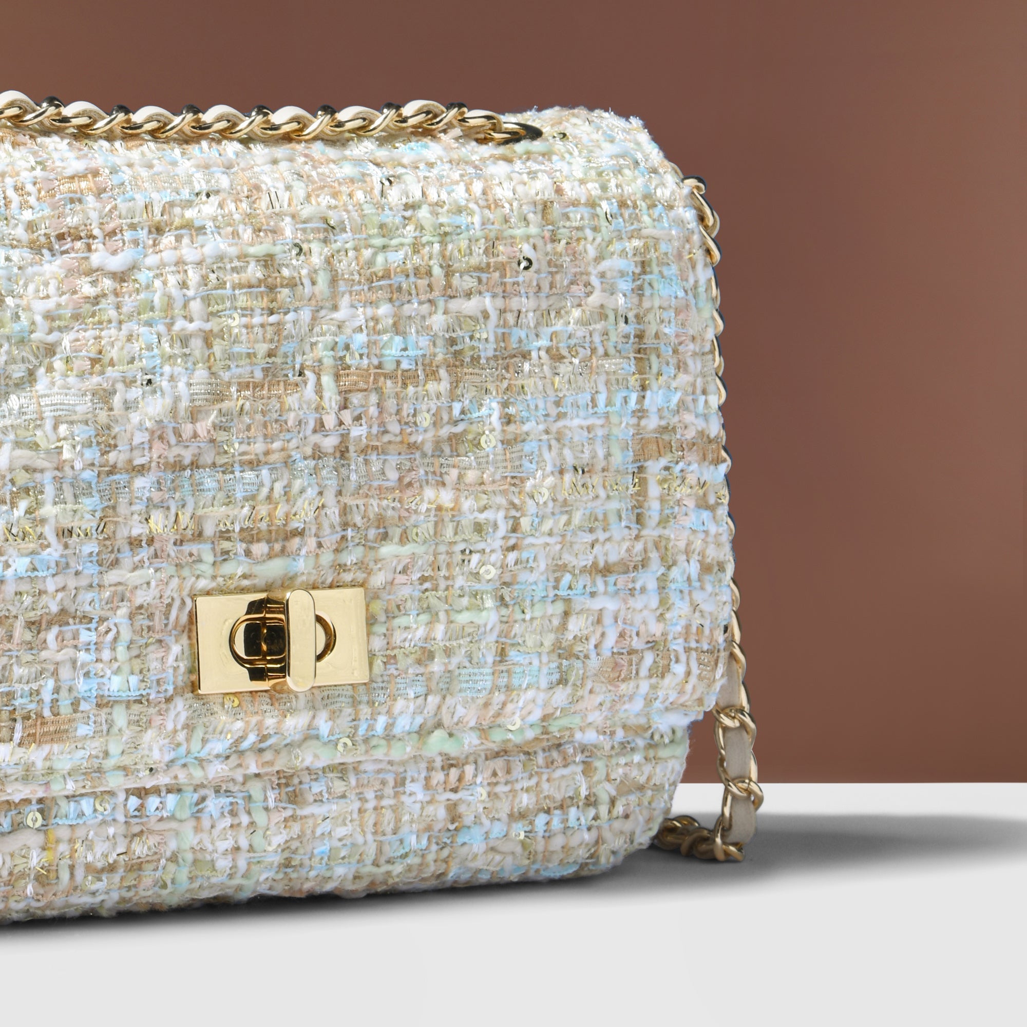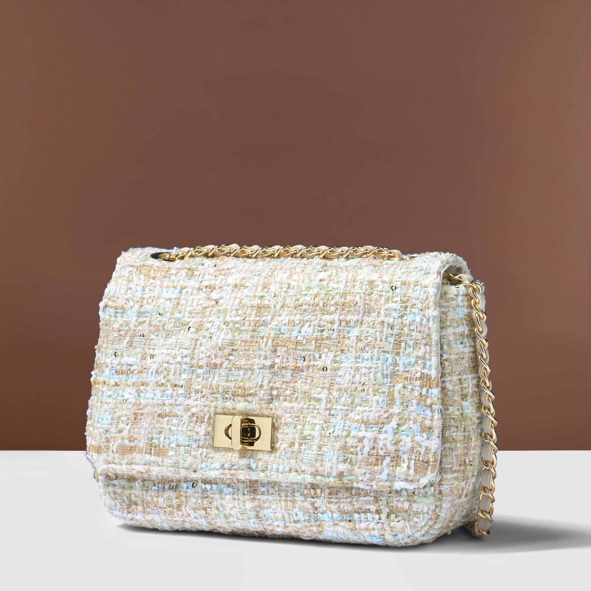 Say hey to your new favourite bag. This delightful cross-body bag is crafted from a multi-coloured woven bouclé featuring metallic threading. Flip open the secured front flap to reveal a lined interior with zipped compartment, and close it again with the twist-lock fastening! The smart metal chain and faux leather shoulder strap adds a chic touch for easy carrying.