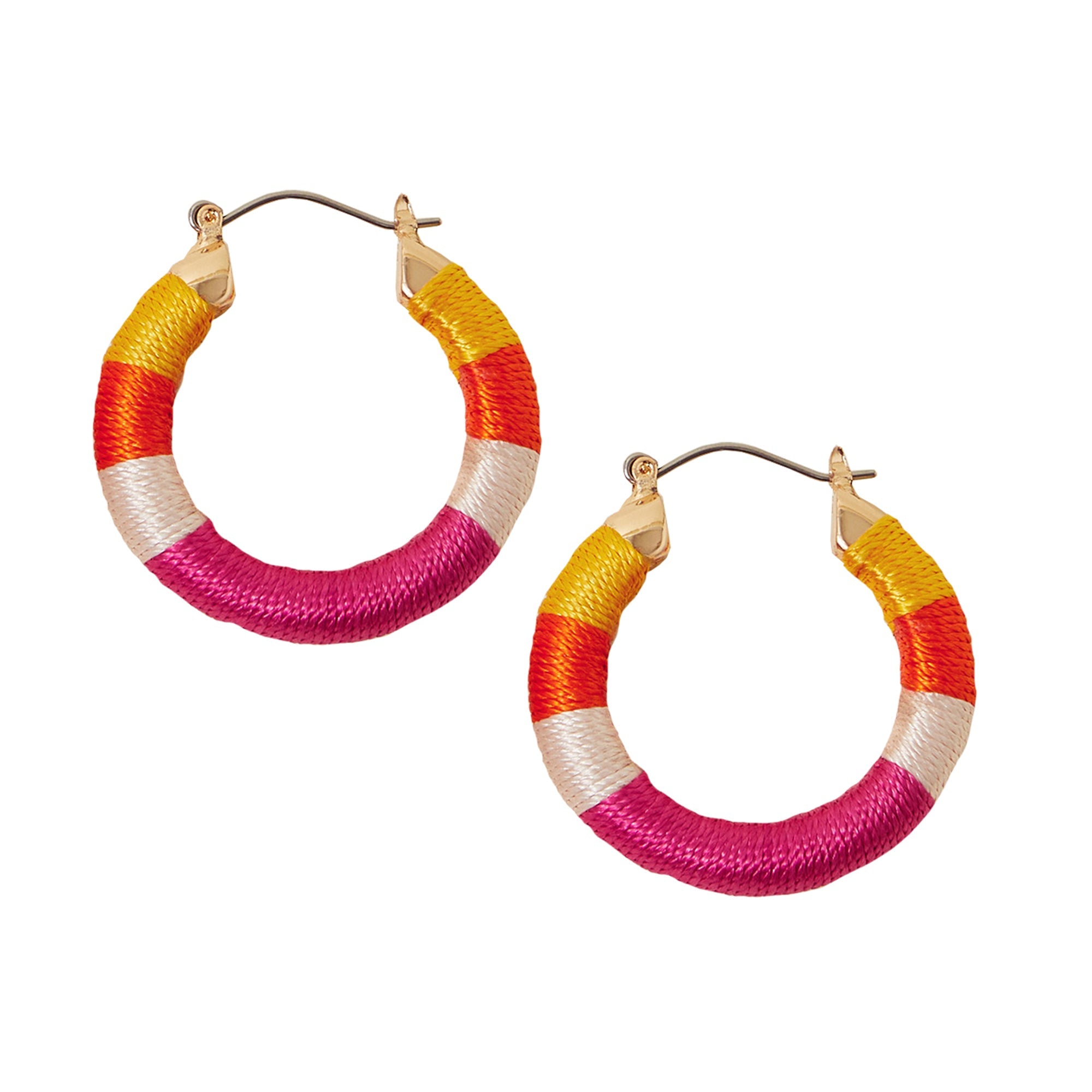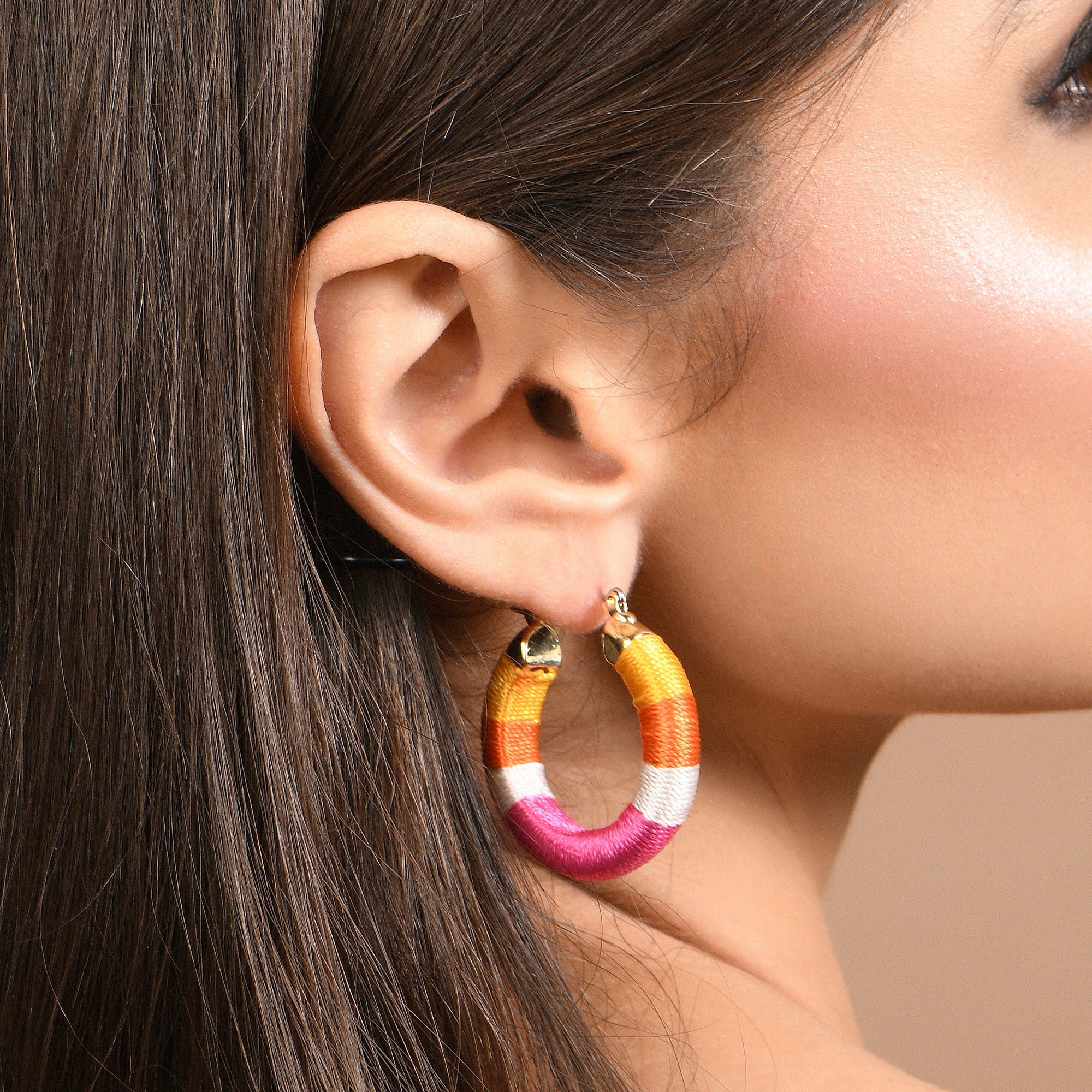 Sunset tones fit for golden hour. Wrapped in vibrant thread, these Hoop Earrings fasten with a simple hinged closure.