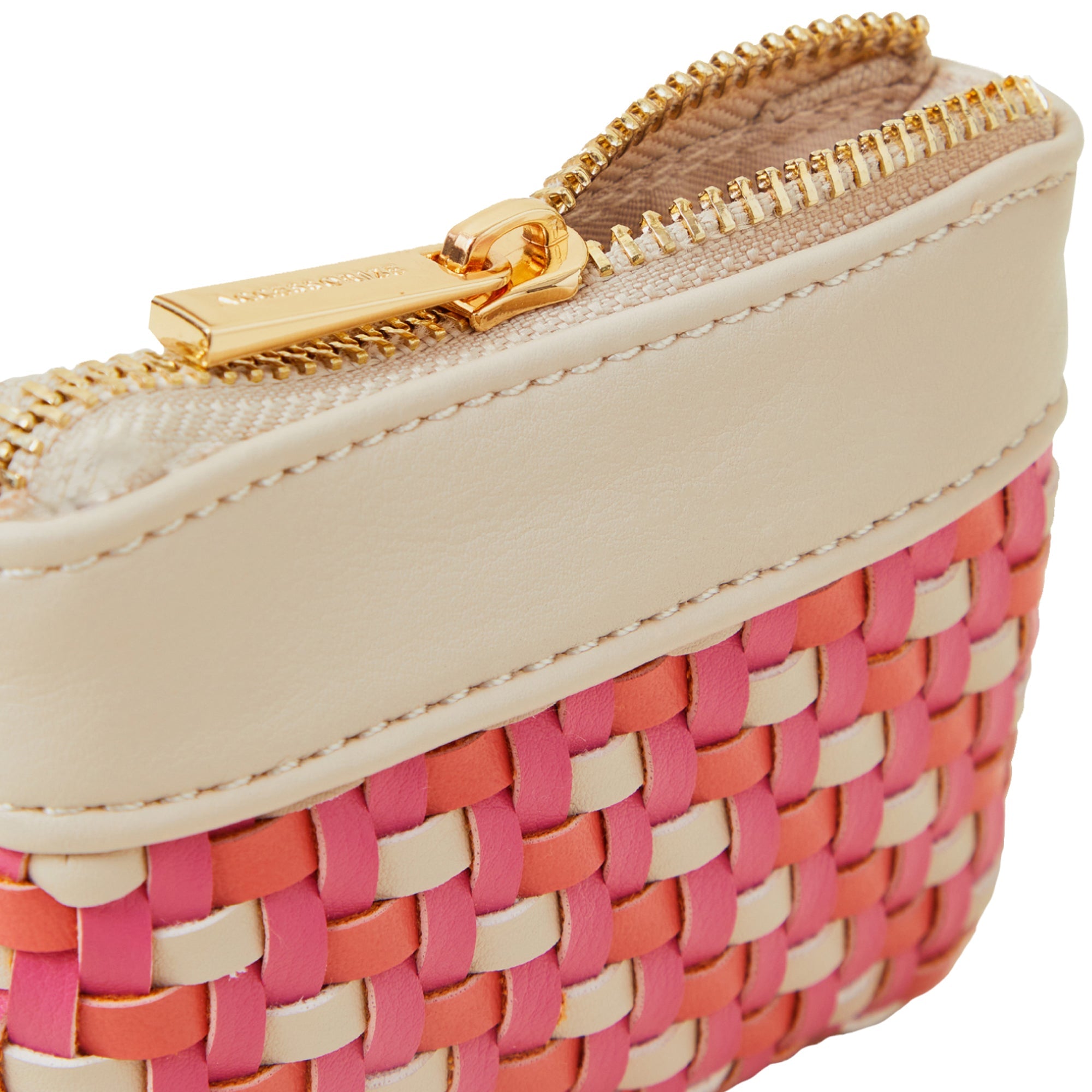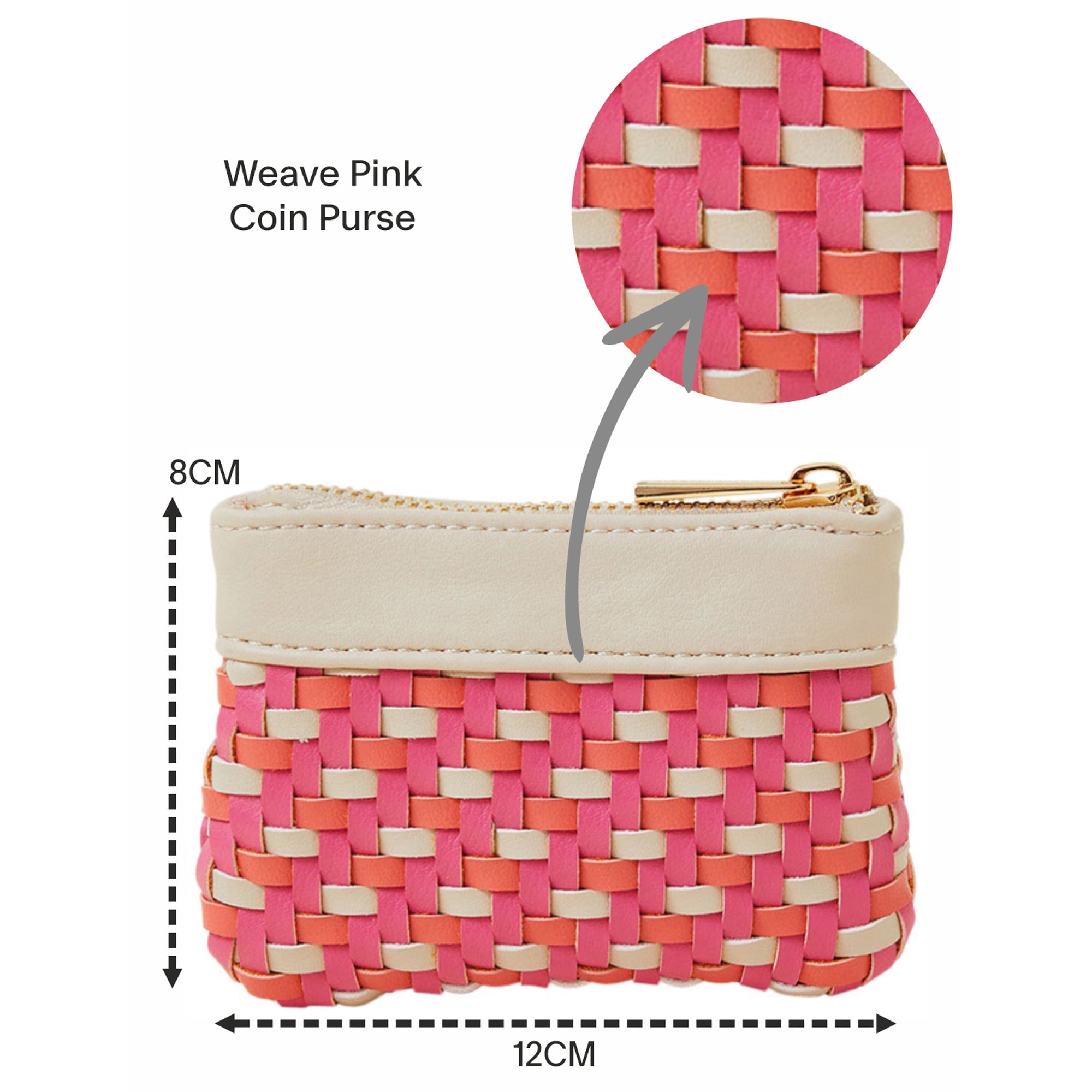 Keeping loose coins and notes safe, this coin purse is designed with a woven finish in our fave pink and orange combo. Fastens with a zip closure to the top.