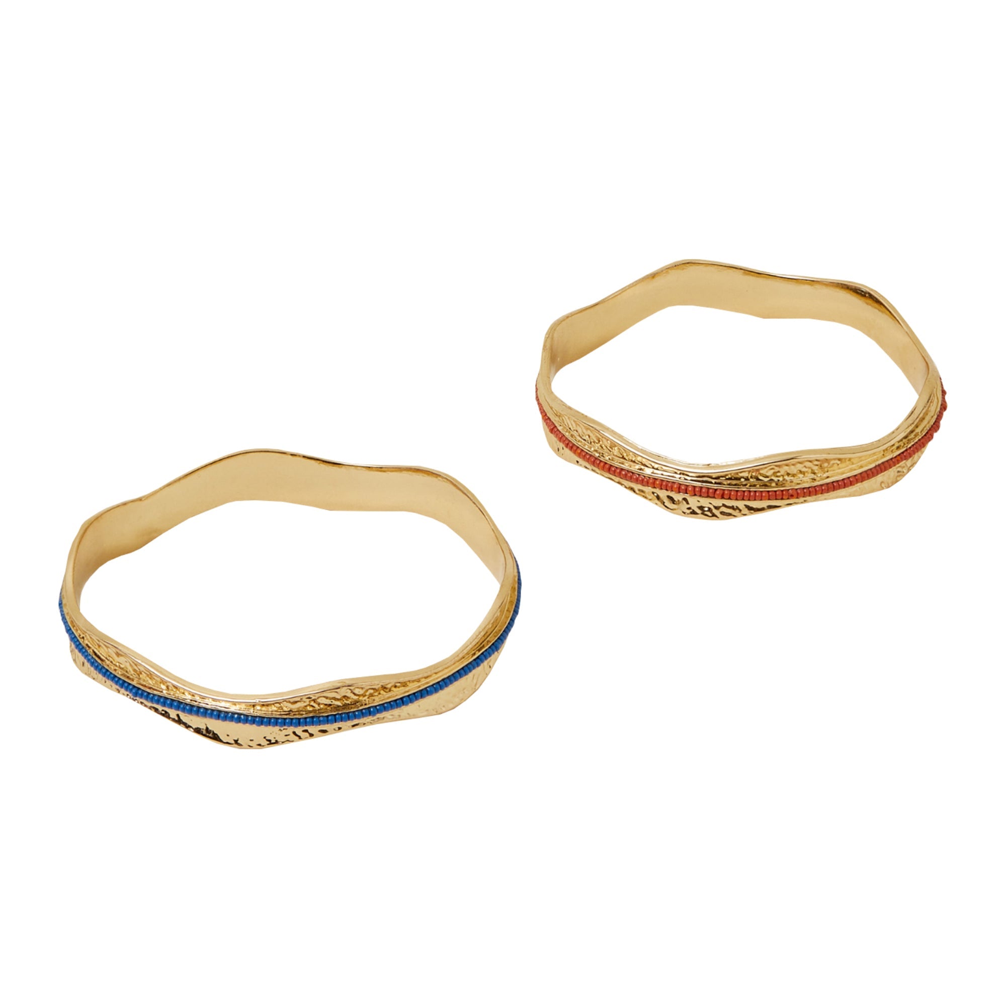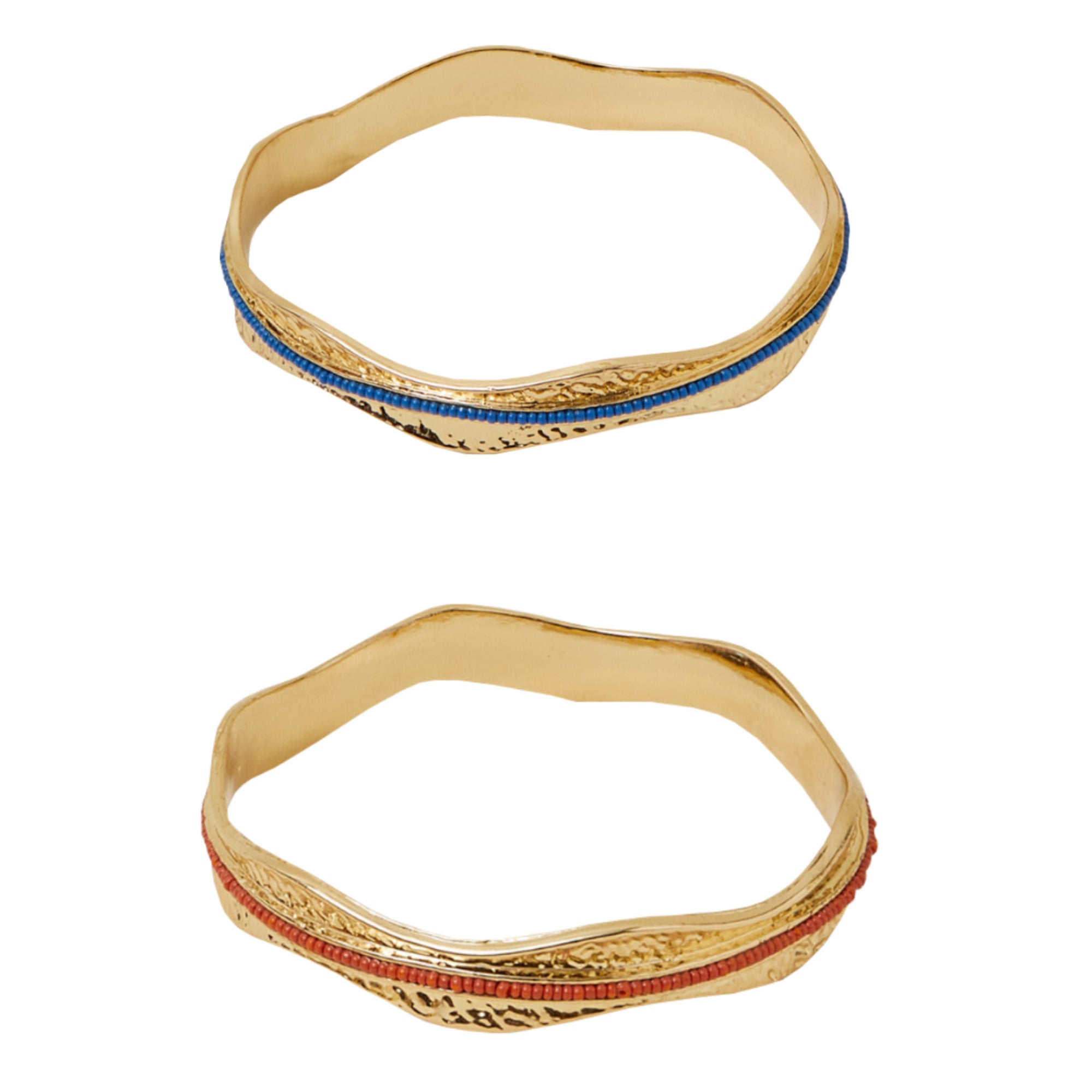 Crafted in gold-tone metal, this dynamic duo look perfect together and flying solo! Featuring a textured finish, these bangles are embellished with teeny tiny seed beads for a pop of colour.