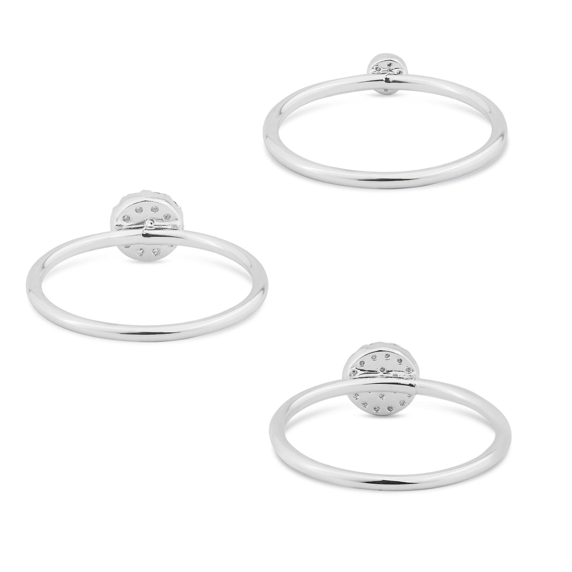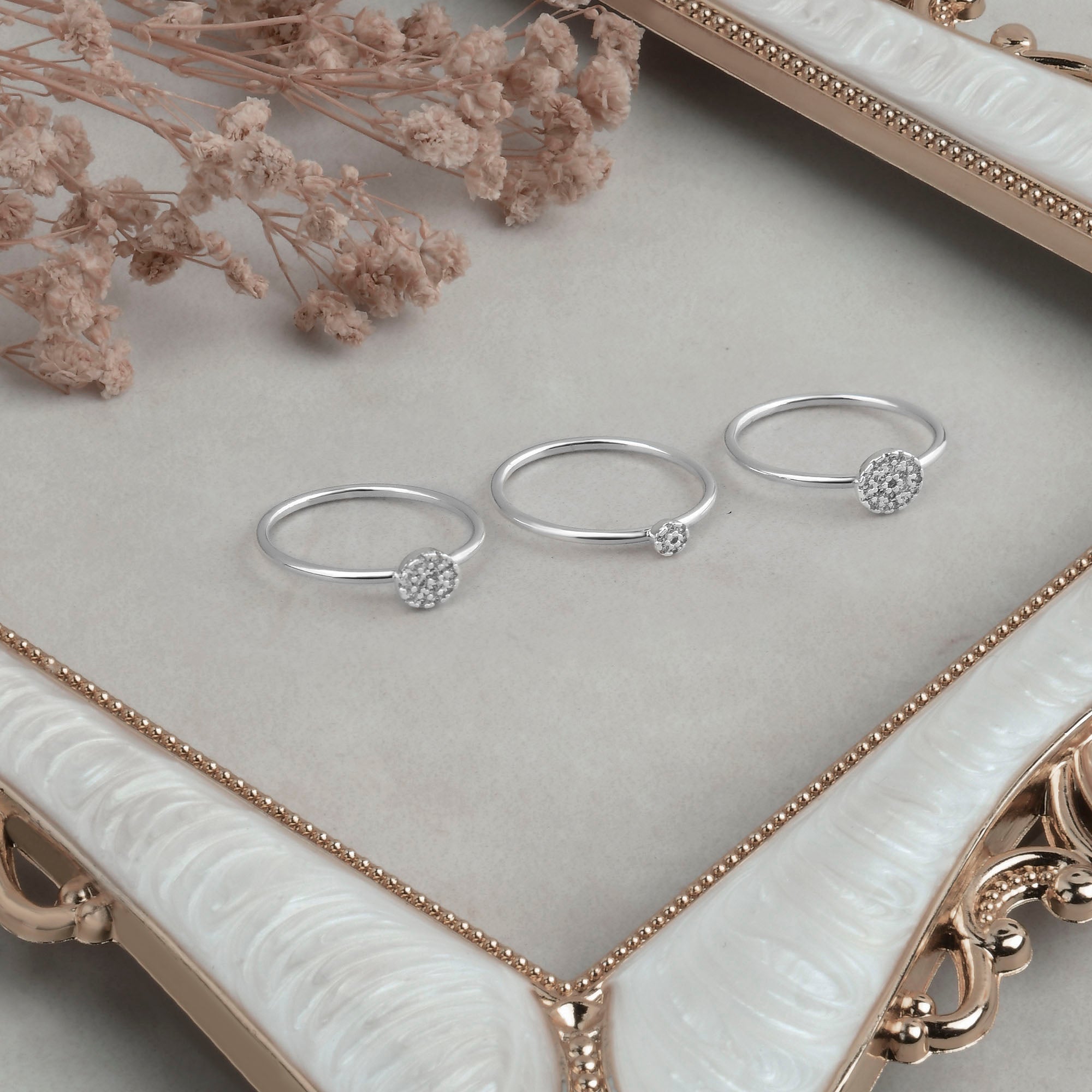 Crafted in sterling silver-plated metal, this sparking trio features a diamanté encrusted circle on a simple band. Stack them up, or wear them individually! Three included. Silver