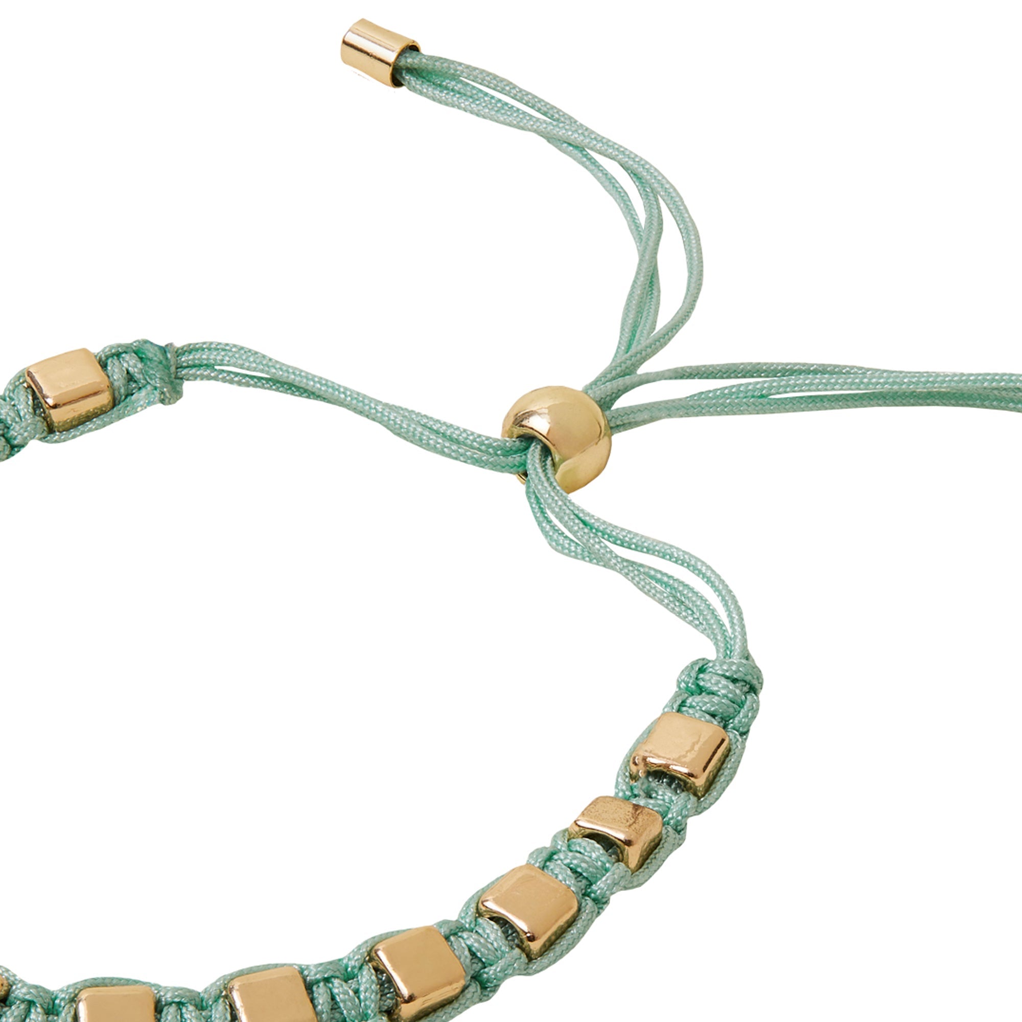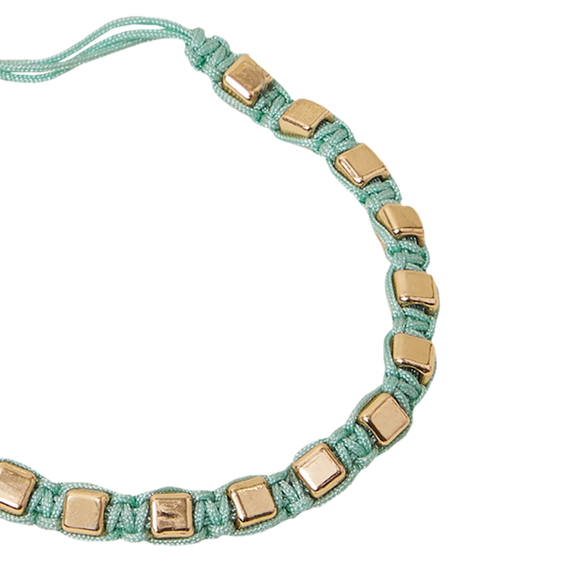 Designed in gold-tone metal, this friendship style bracelet is threaded with square beading on an aqua cord. Fastens with a drawstring bead closure.