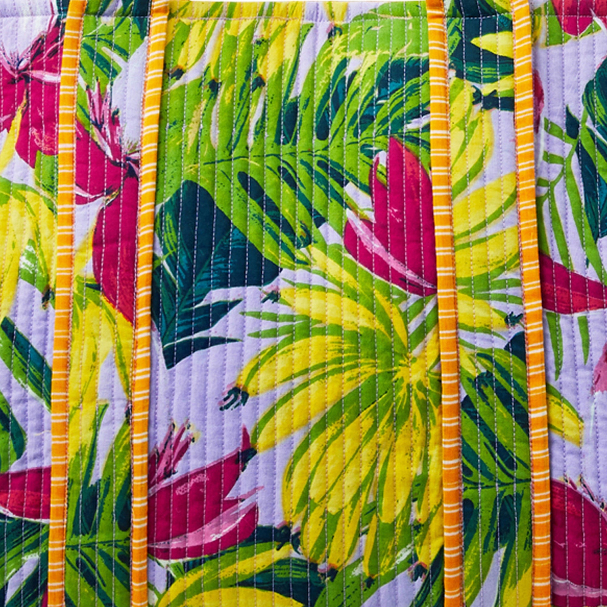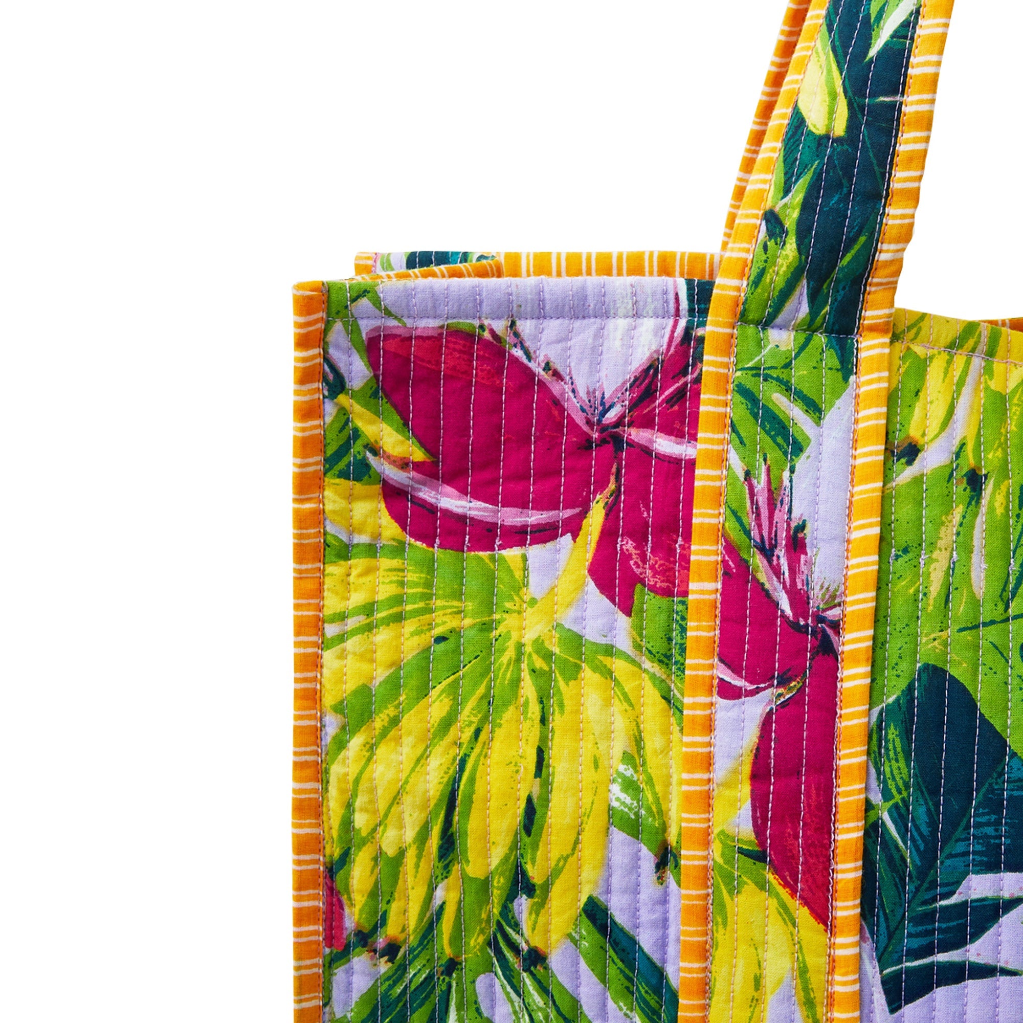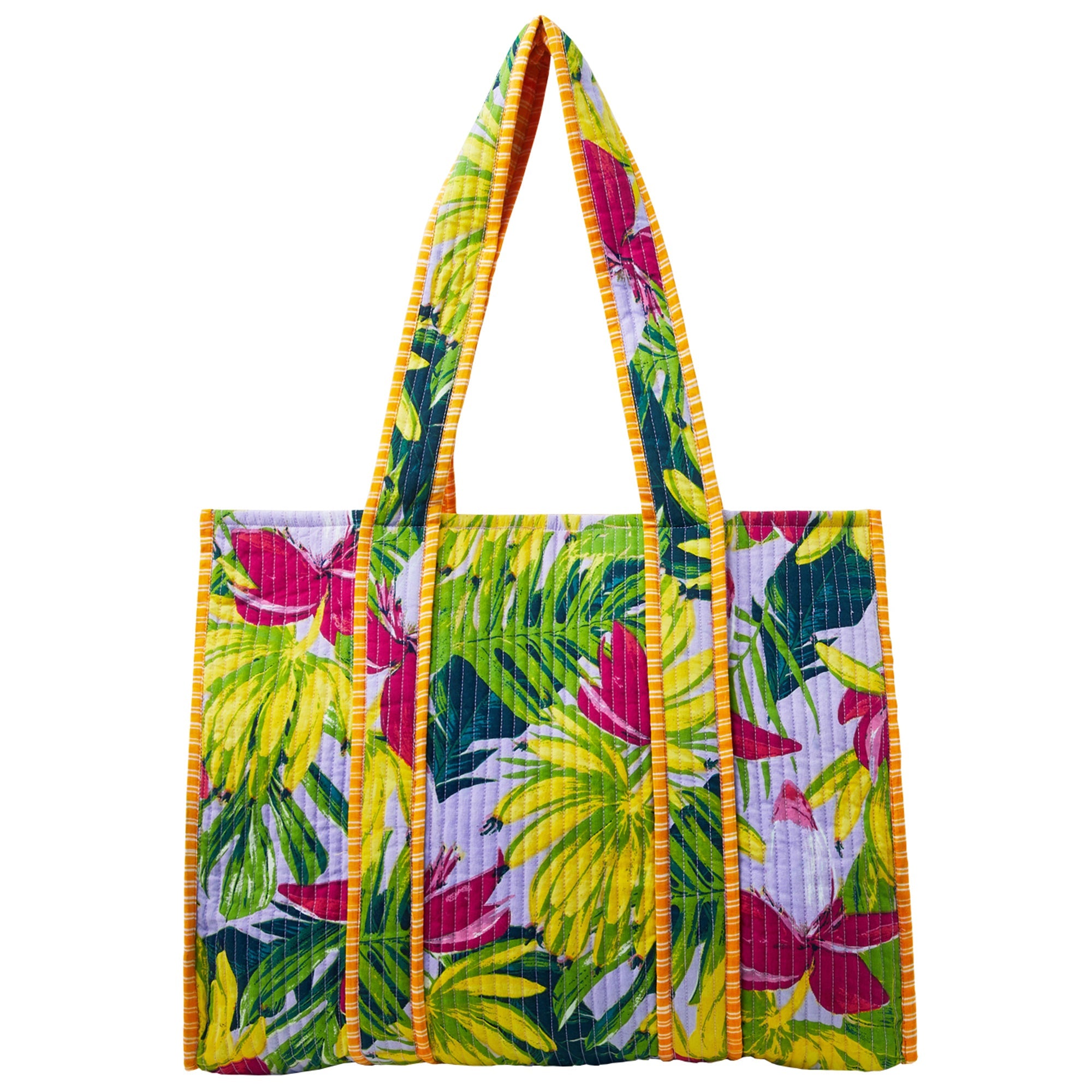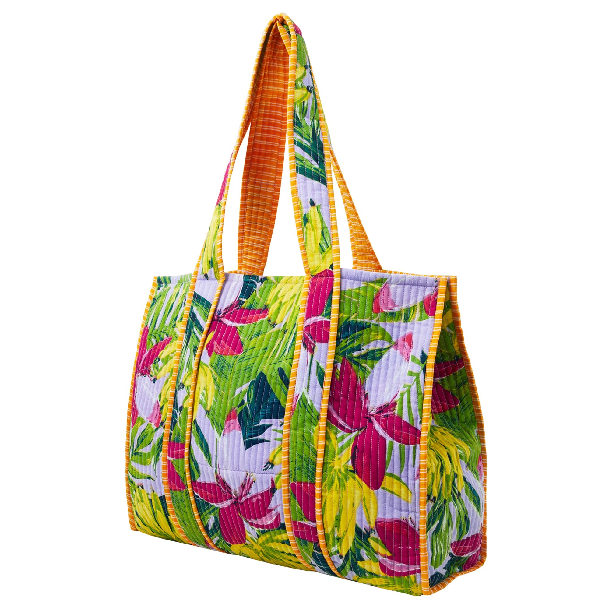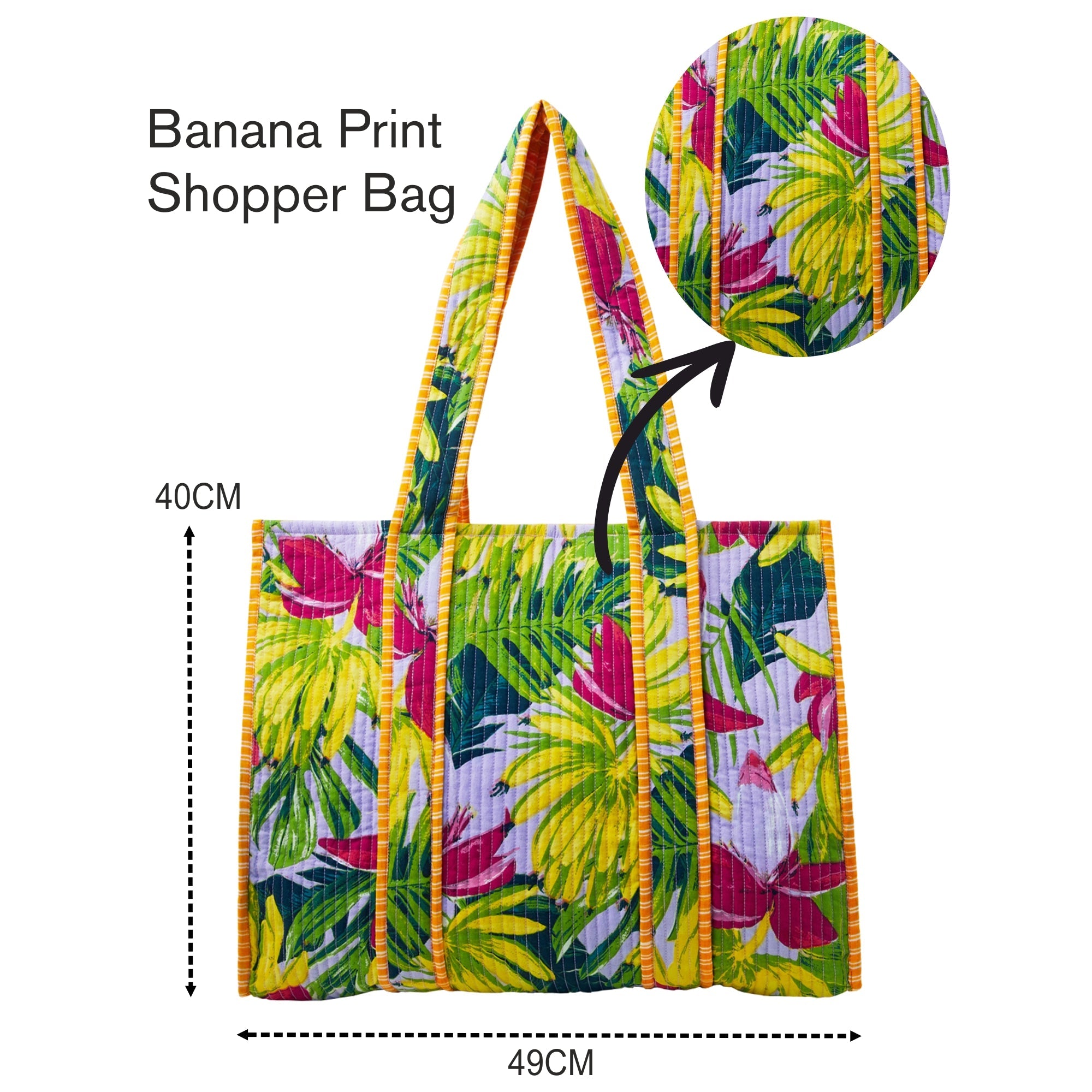 This roomy tote will come in handy for shopping trips or weekends away. It has a soft, quilted outer, two shoulder straps and a summery banana print.