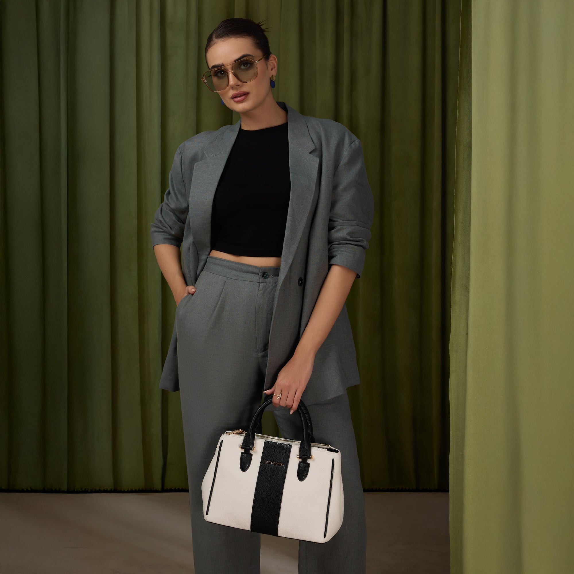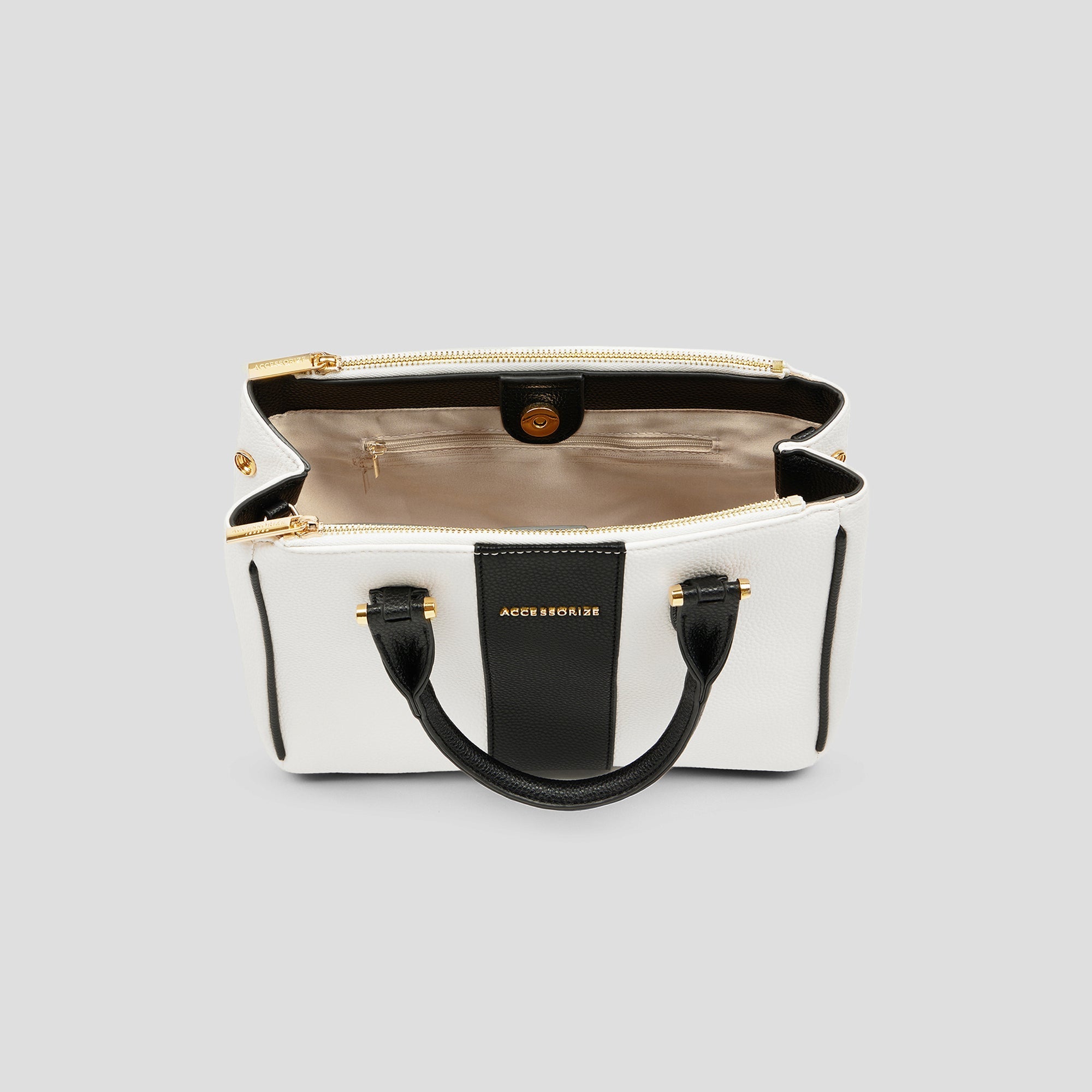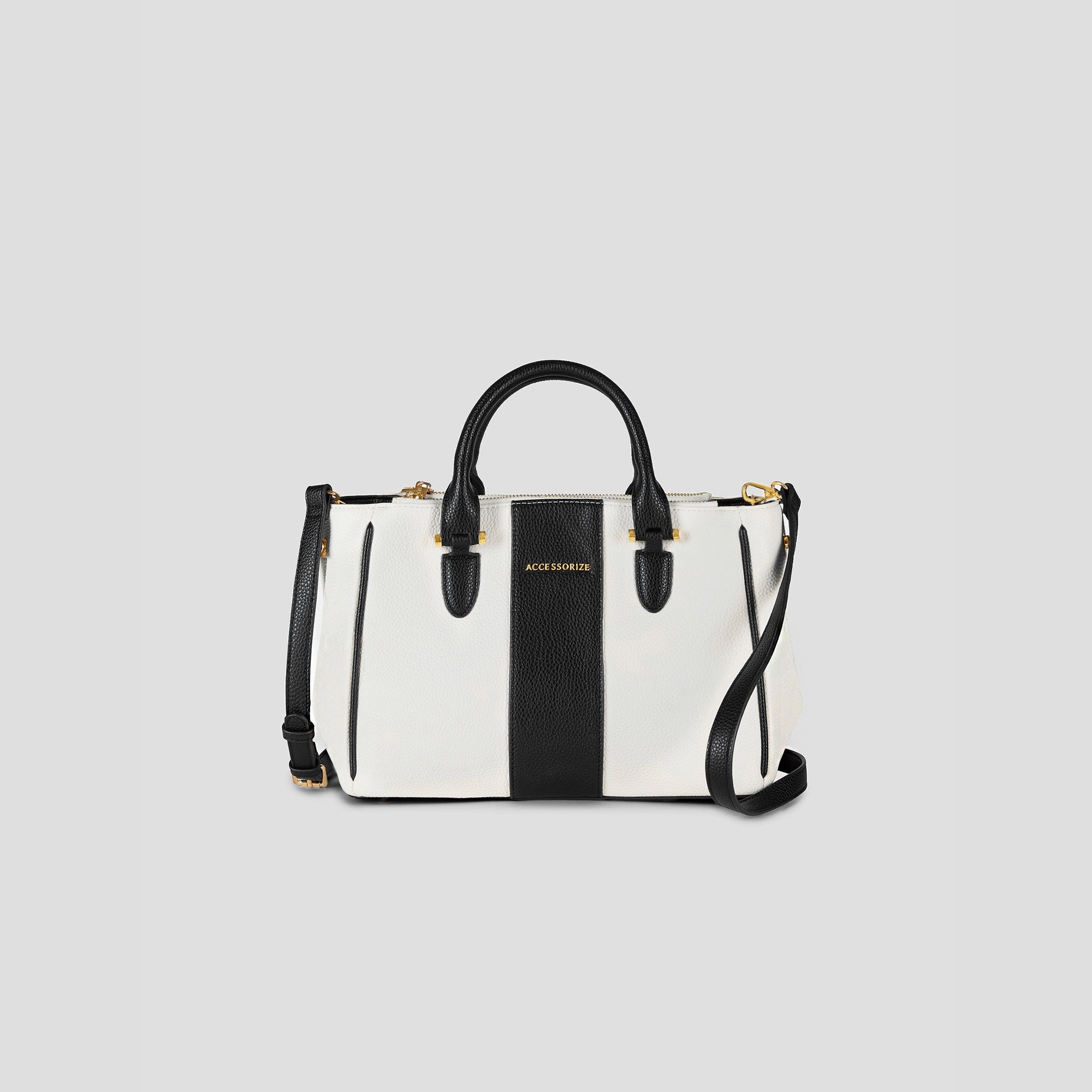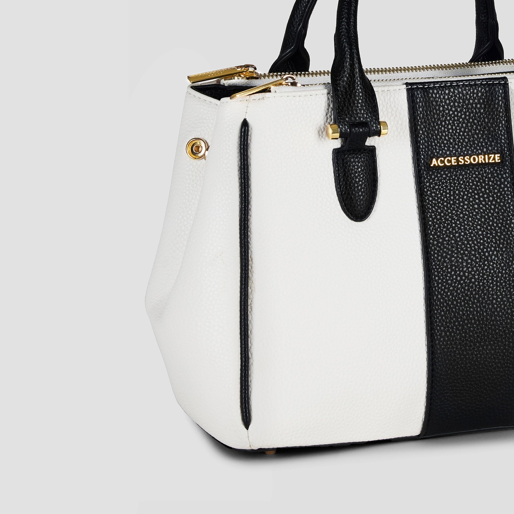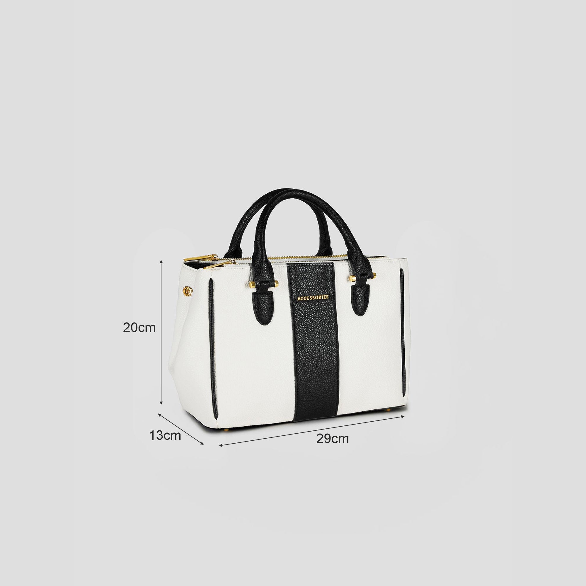 Minimal and sharp, this compact colourblock tote in black and white tones adds structure and style to your everyday wardrobe. Its sleek design and gold detailing give it an edge that suits both casual and formal dressing.