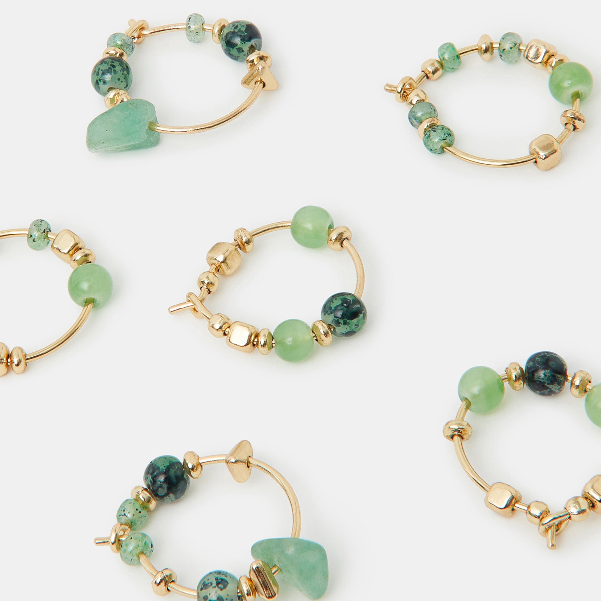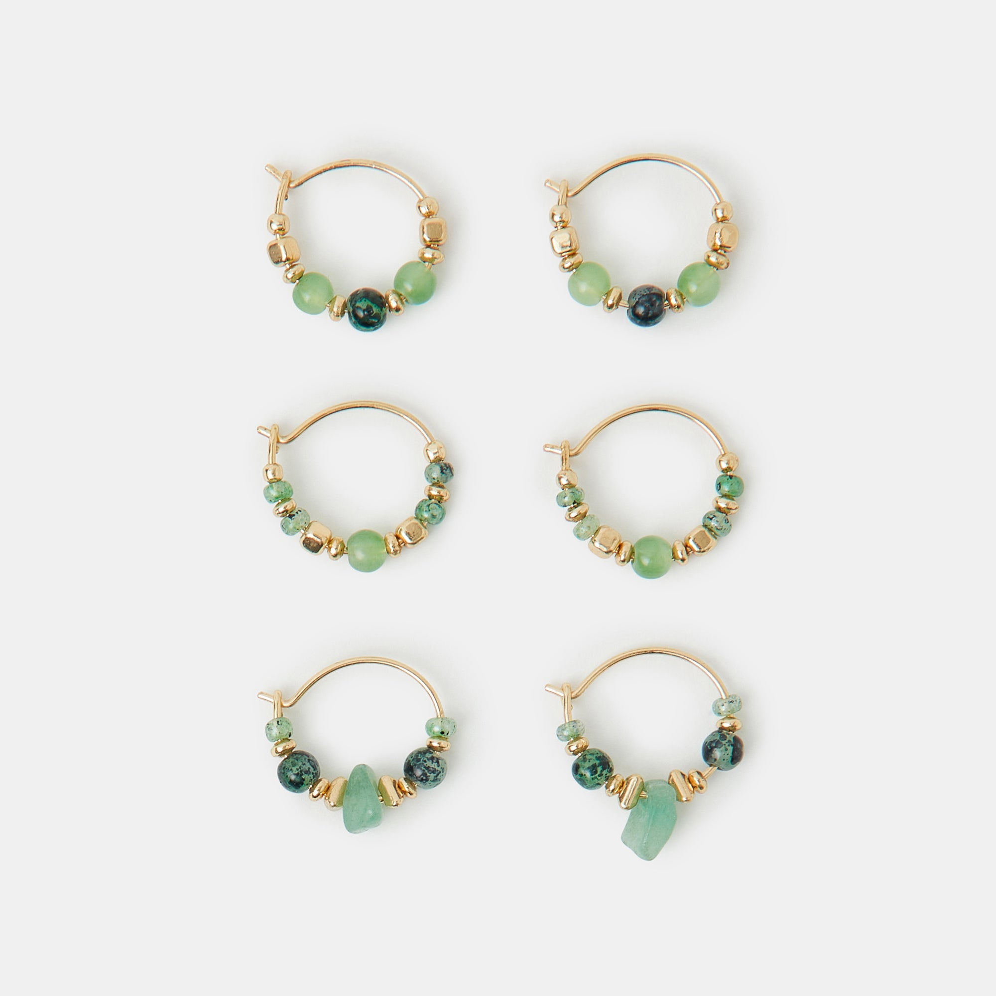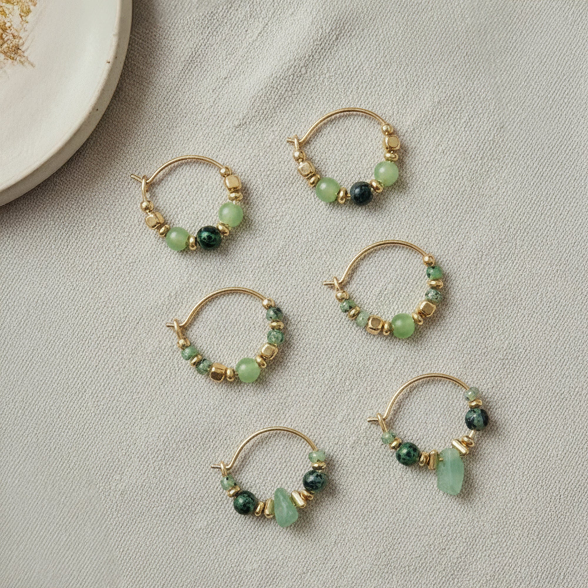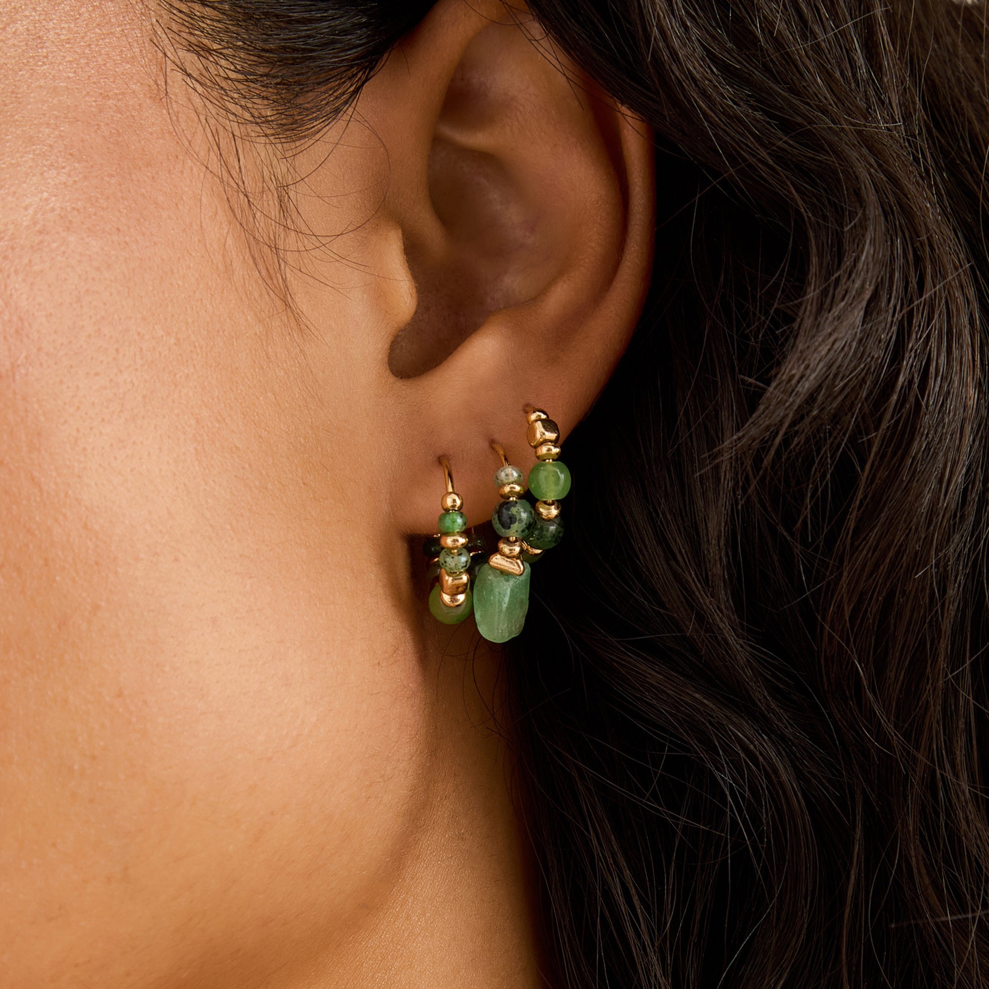 Teeny tiny but full of shine, these hoop earrings are dipped in a golden tone and strung with a mix of facet beads in pretty, green colours.