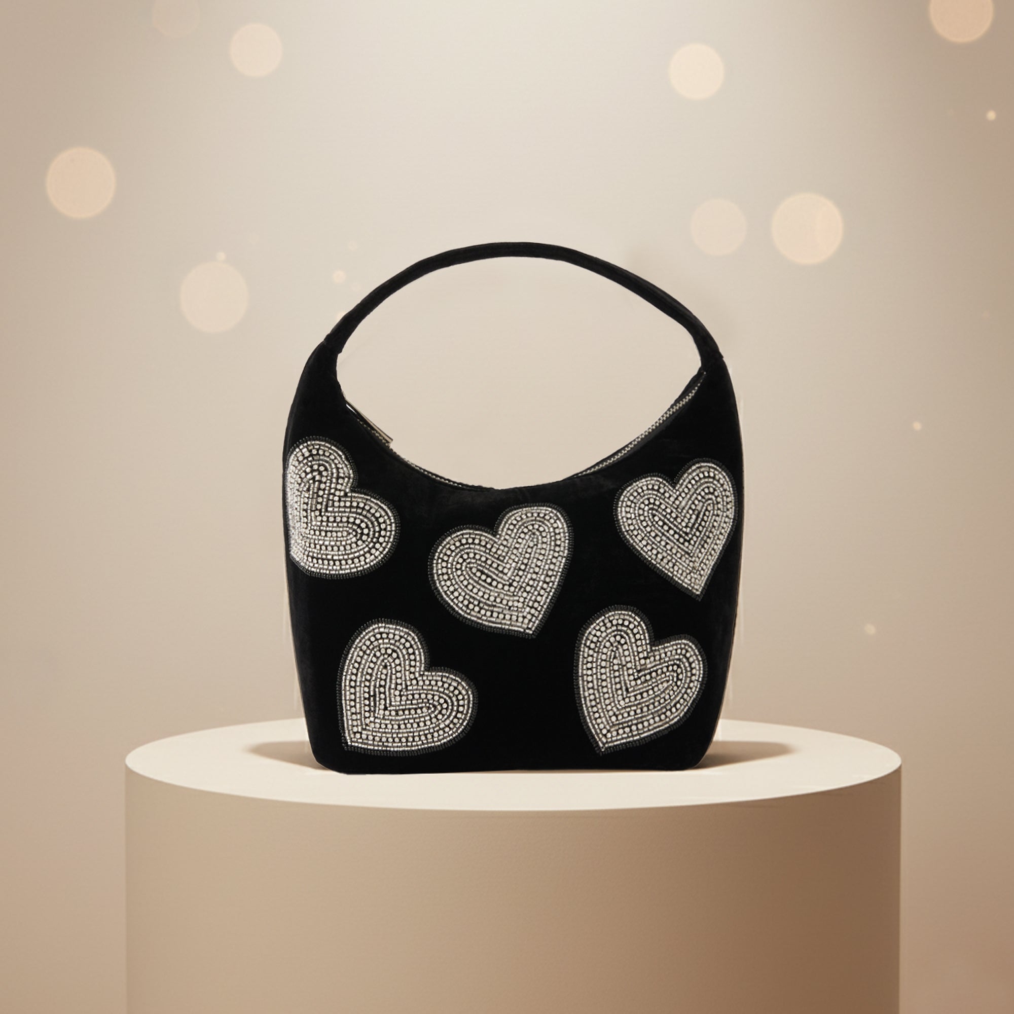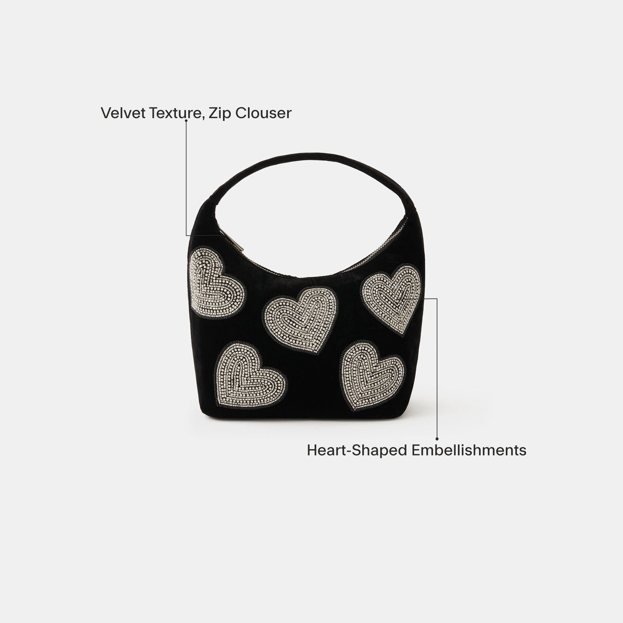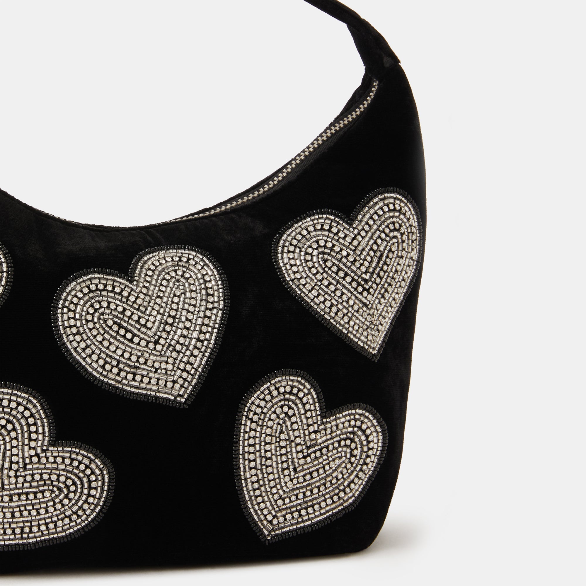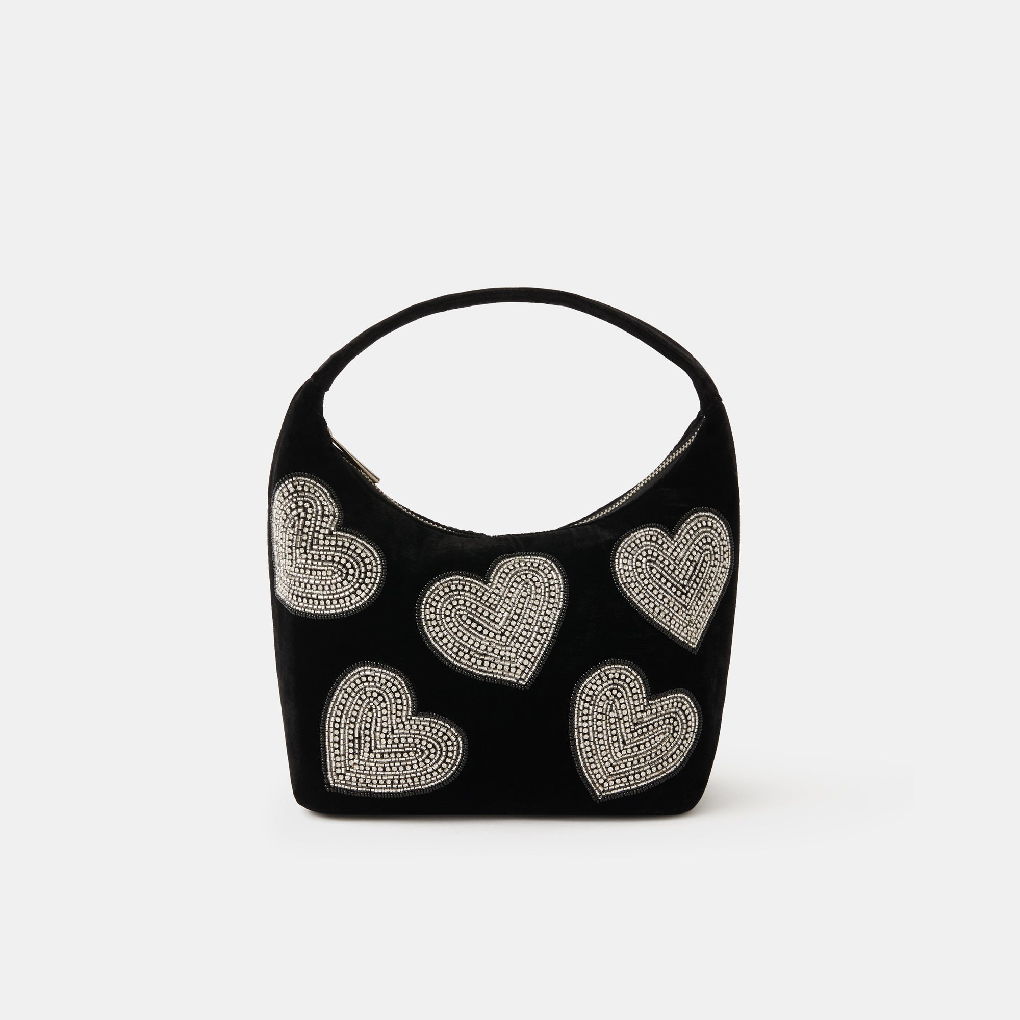 We've got a BIG crush on this. The ultimate plus-one for black tie weddings or date night, this handbag is made from luxe velvet fabric with sparkly heart embellishments to finish. Features a zip fastening and internal slip pocket.