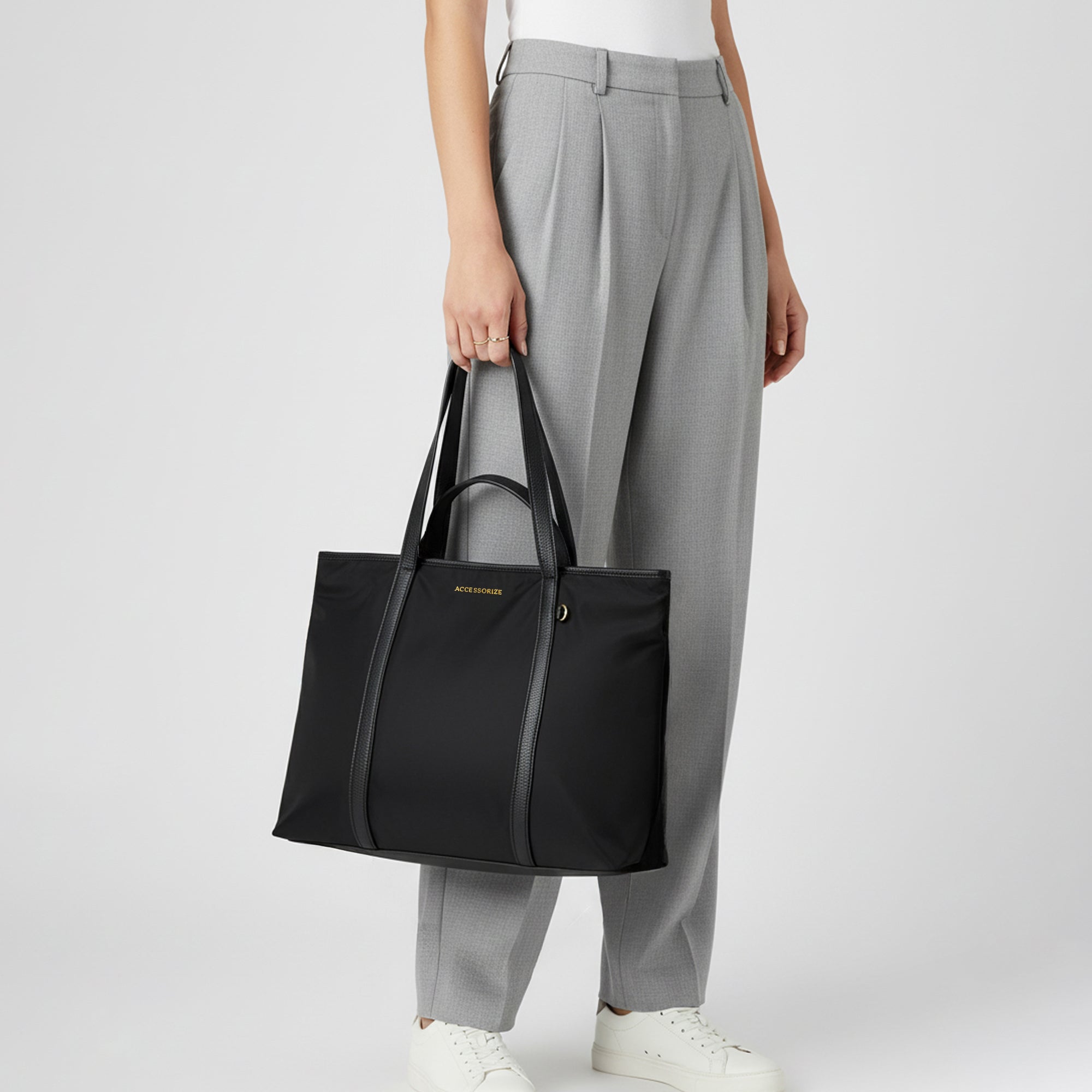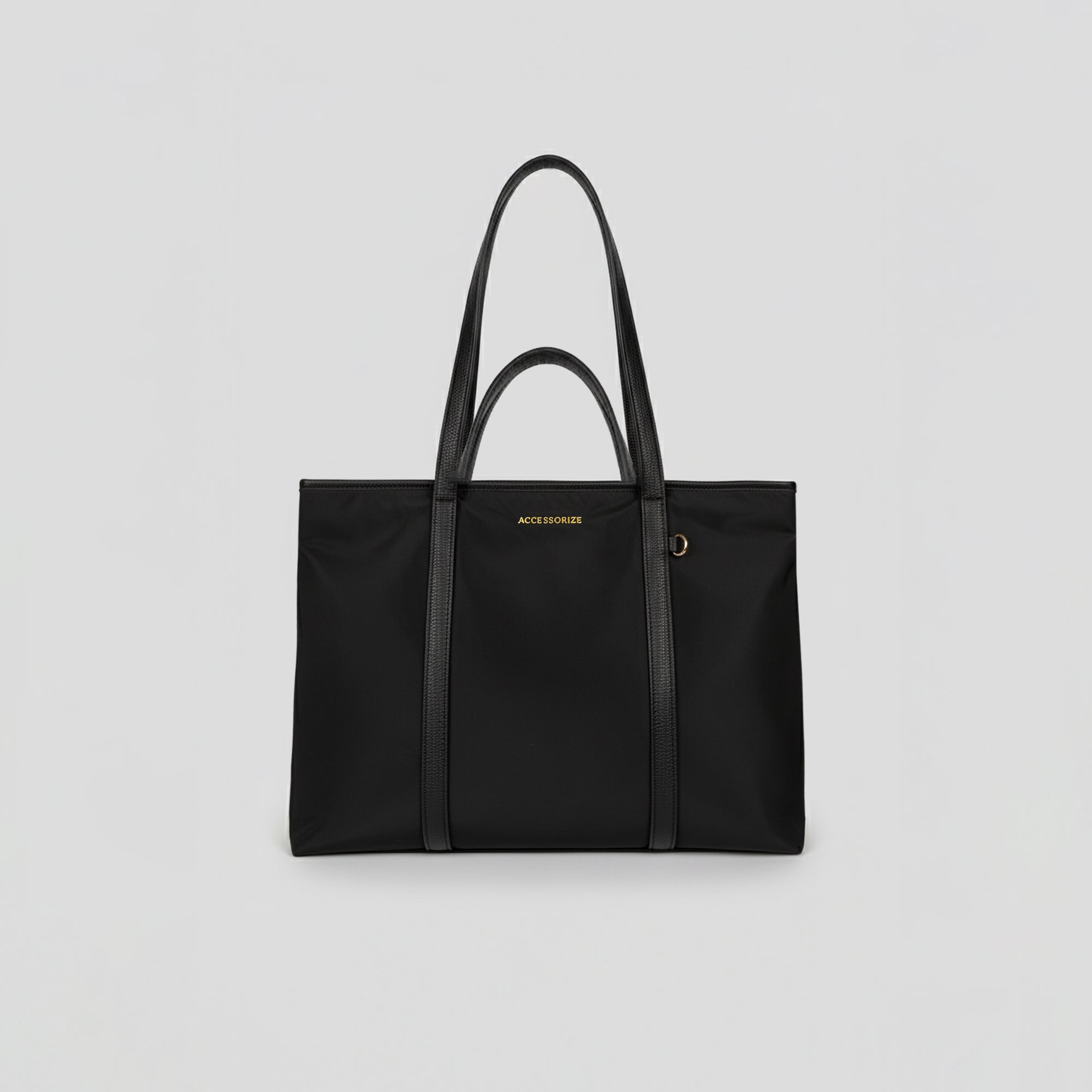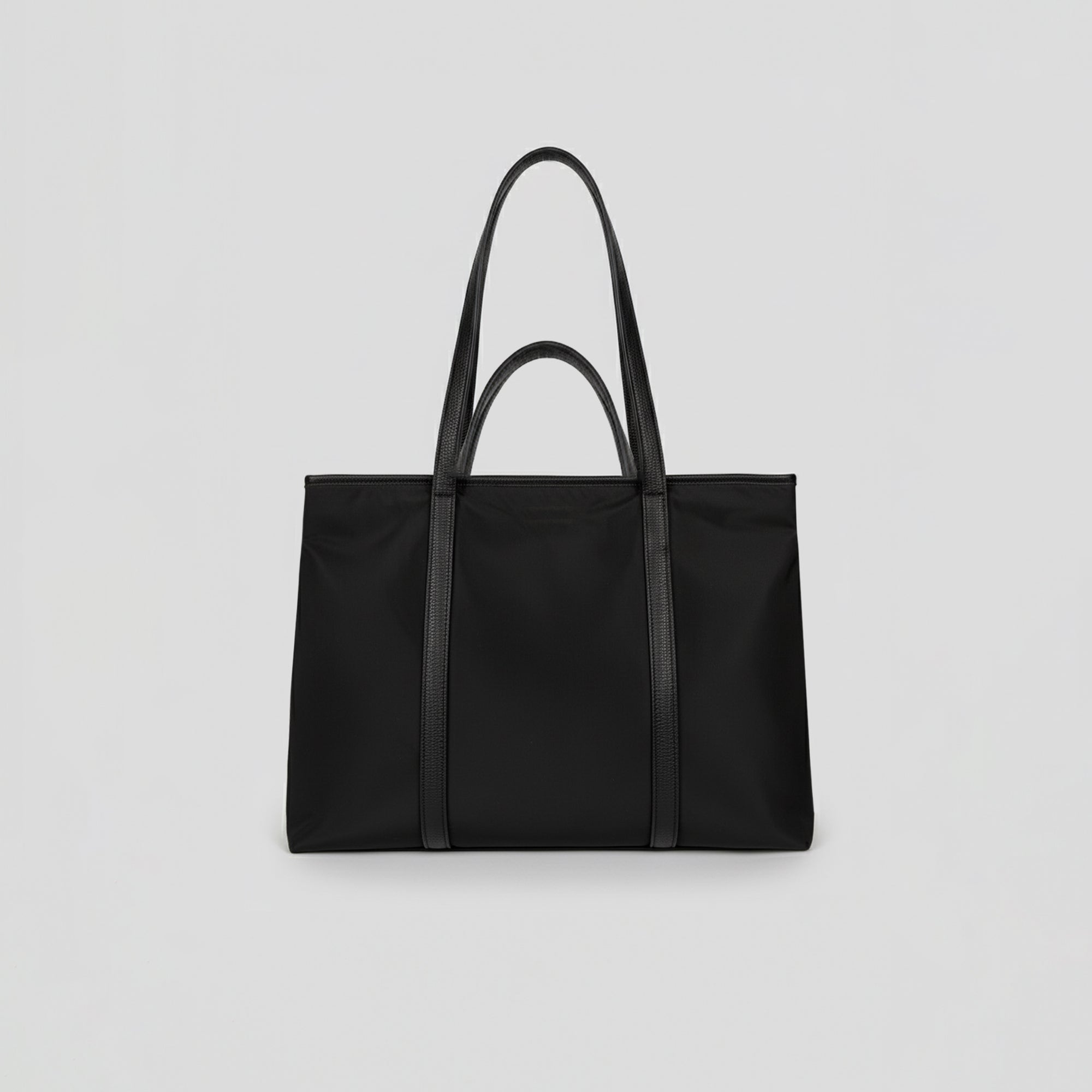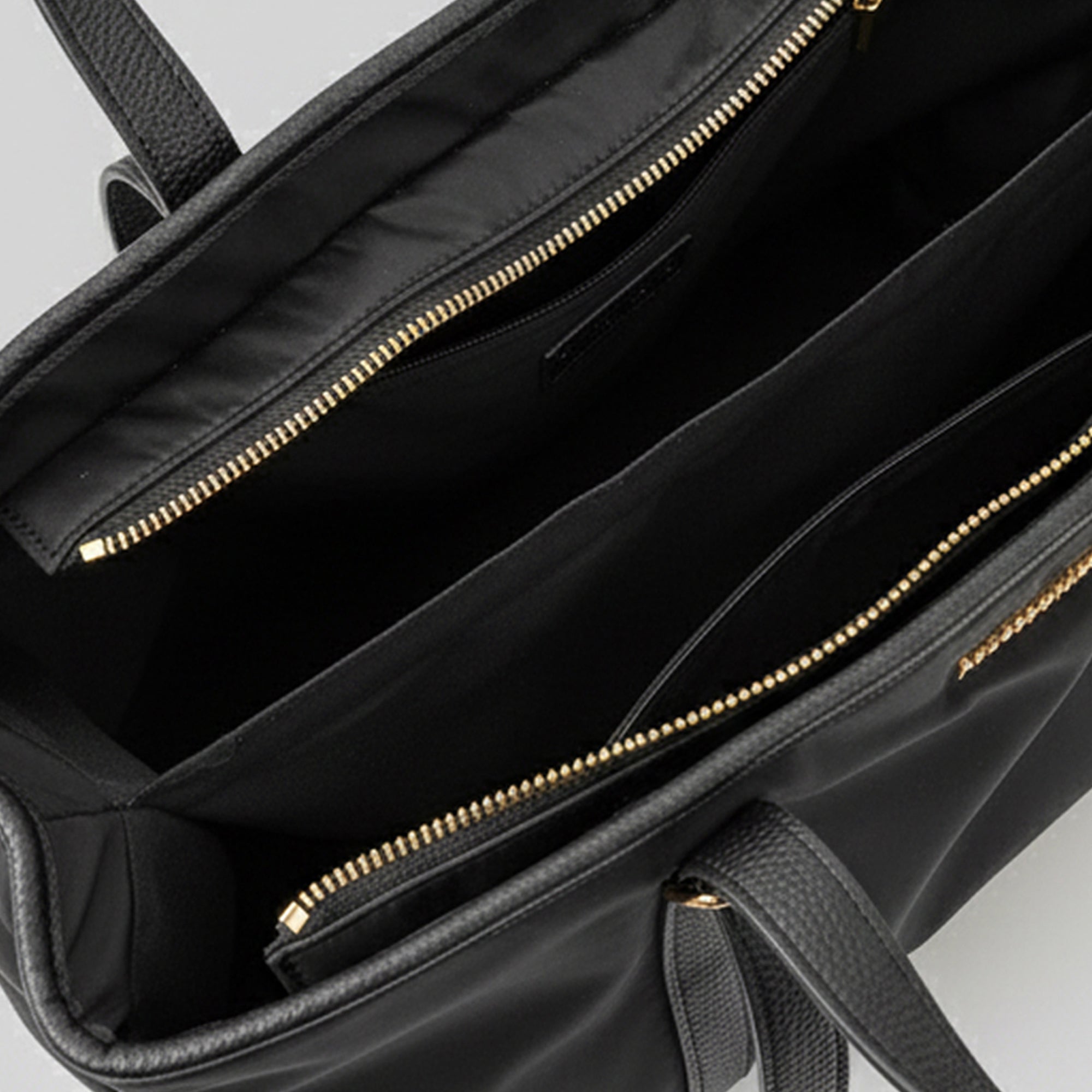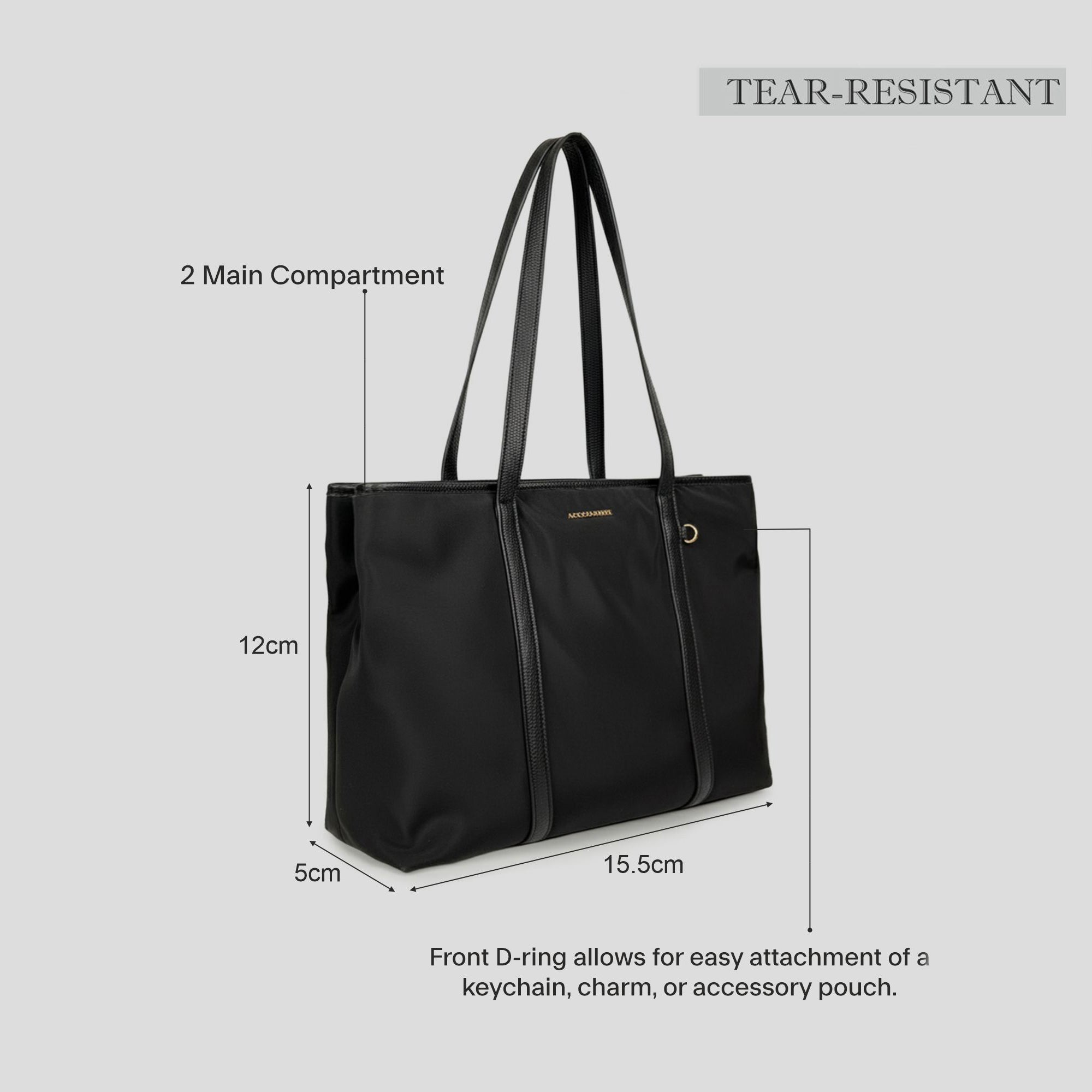 Master the art of organisation with this streamlined and sophisticated Black Tote Bag. Perfect for the professional or the stylish traveller, it is constructed from durable, tear-resistant, and waterproof nylon, offering peace of mind no matter the weather. The bag's standout feature is the dual main compartment design, allowing you to neatly separate your work essentials (like a laptop or documents) from your personal belongings. Finished with elegant faux leather shoulder straps and a handy front D-ring for attaching keychains or charms, this tote is the definition of chic, high-functionality.